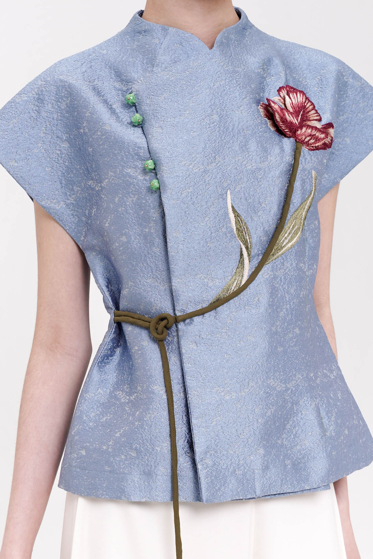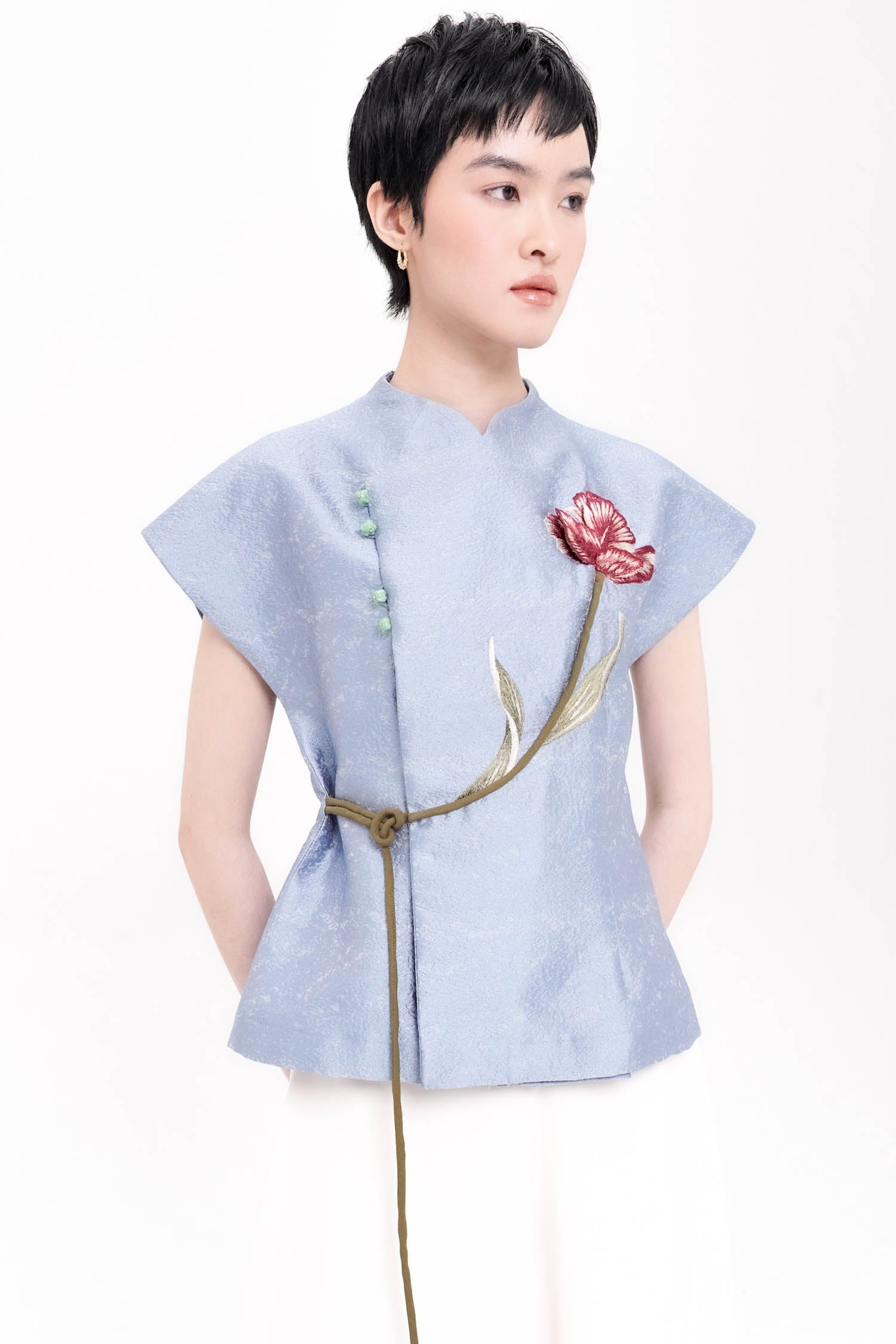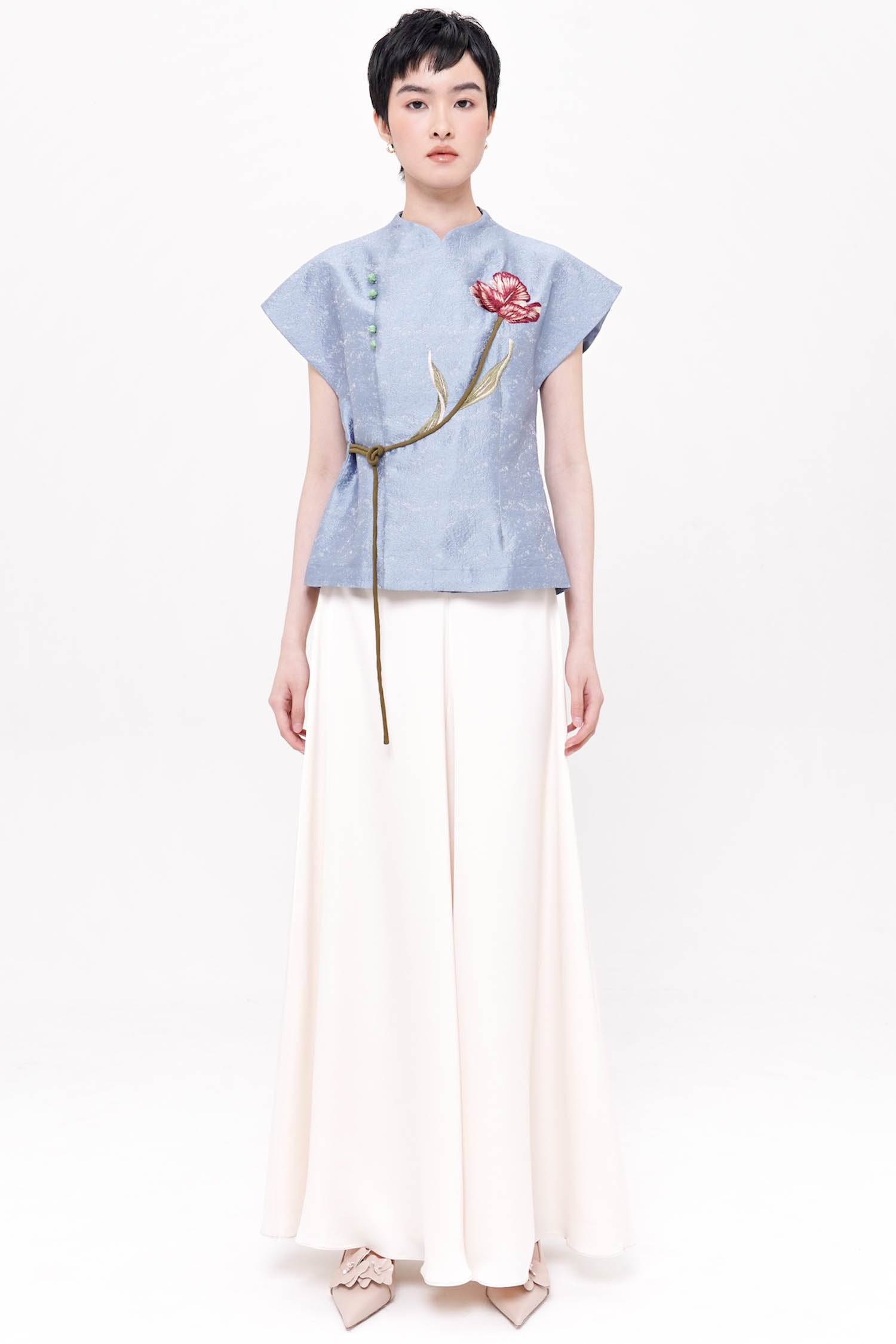 The Ning Wrap Top is a graceful expression of modern refinement, crafted from softly textured jacquard that offers both structure and fluidity. Designed with a clean wrap-inspired silhouette, it is accentuated by delicate floral embroidery that flows organically across the front, creating a subtle focal point rich in symbolism and artistry. The gently sculpted shoulders and adjustable tie detail define the waist with ease, while the refined finish allows the piece to transition seamlessly from daytime elegance to elevated occasions. Available in Nude and Blue.