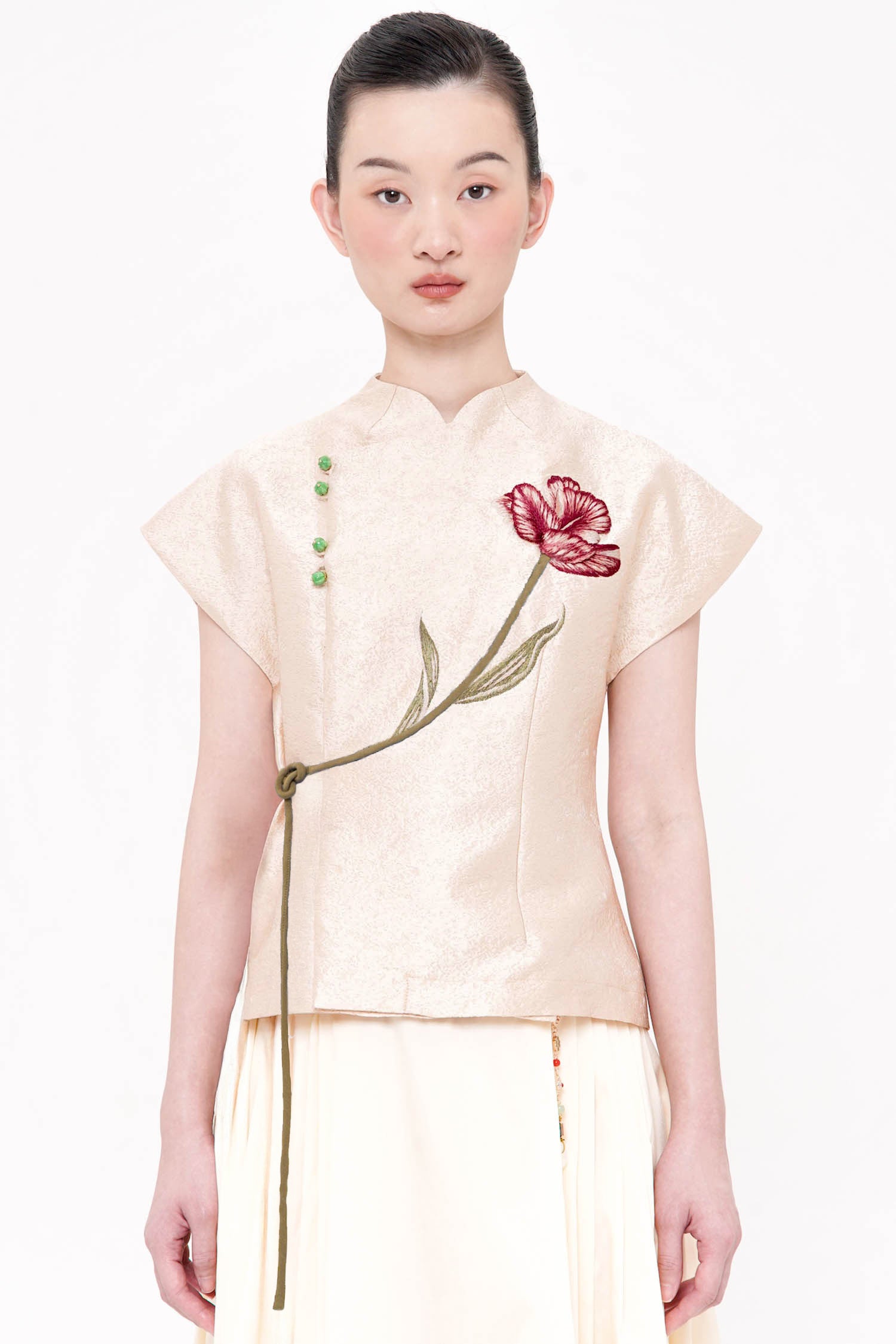 The Ning Wrap Top is a graceful expression of modern refinement, crafted from softly textured jacquard that offers both structure and fluidity. Designed with a clean wrap-inspired silhouette, it is accentuated by delicate floral embroidery that flows organically across the front, creating a subtle focal point rich in symbolism and artistry. The gently sculpted shoulders and adjustable tie detail define the waist with ease, while the refined finish allows the piece to transition seamlessly from daytime elegance to elevated occasions. Available in Nude and Blue.