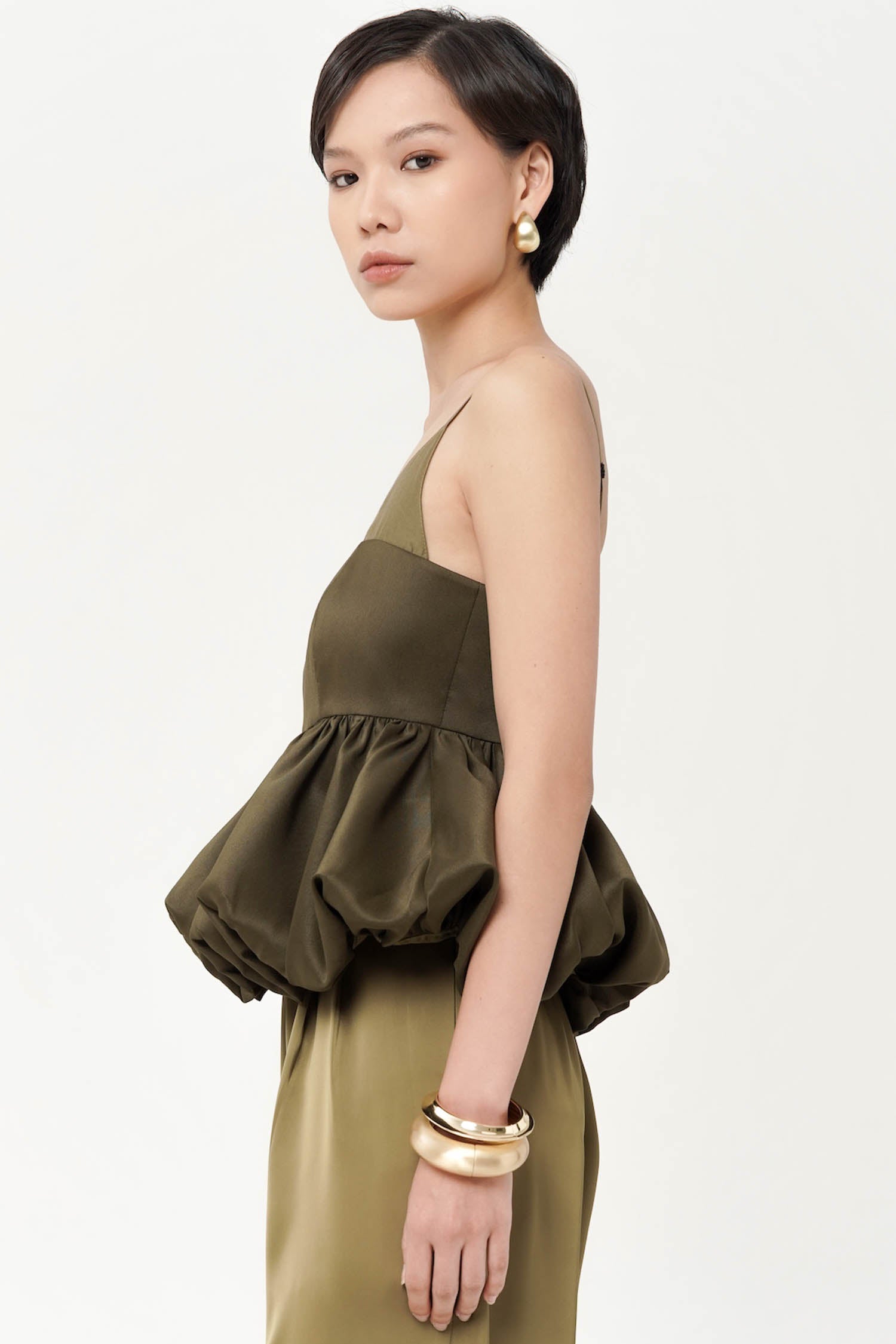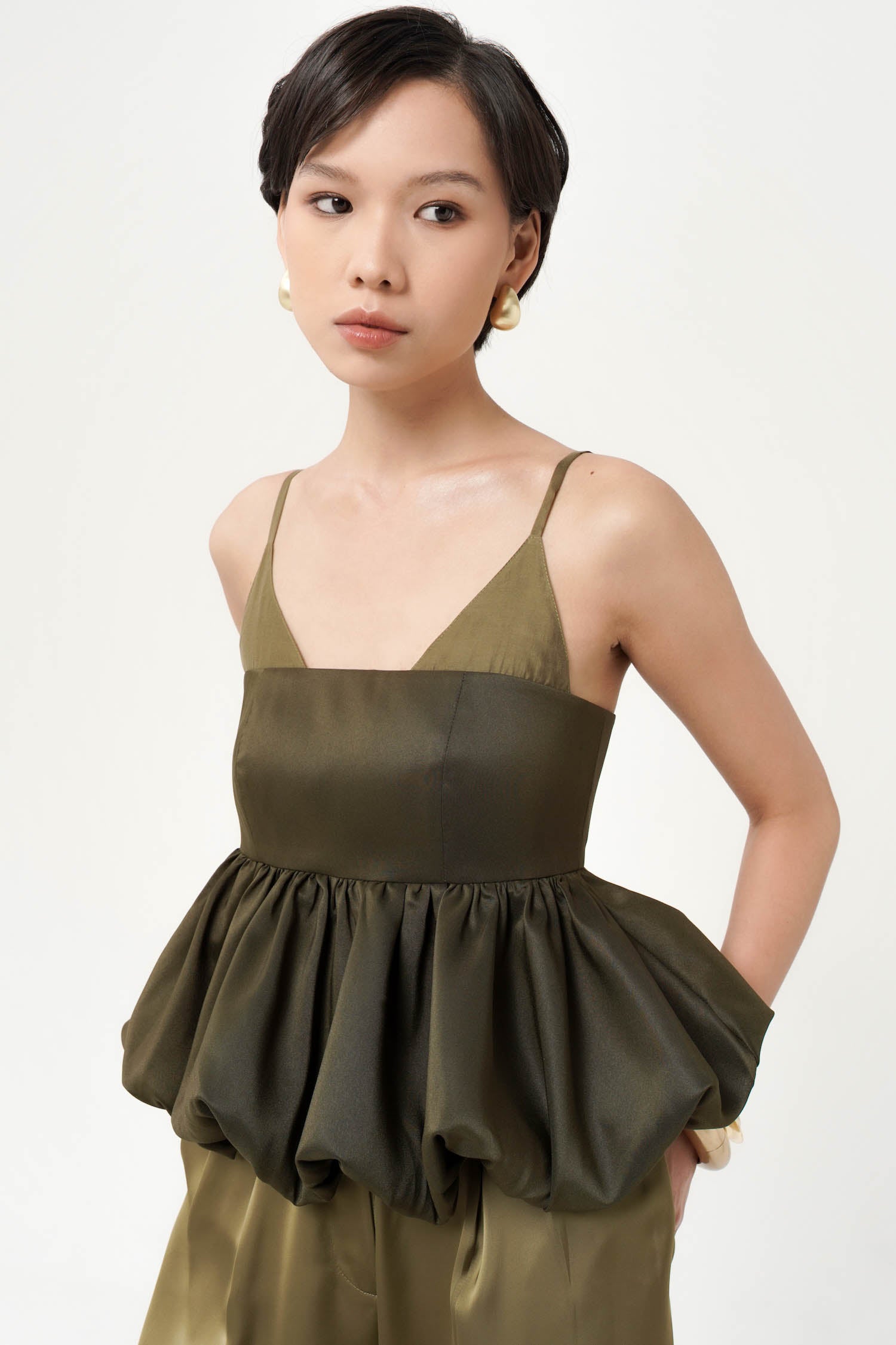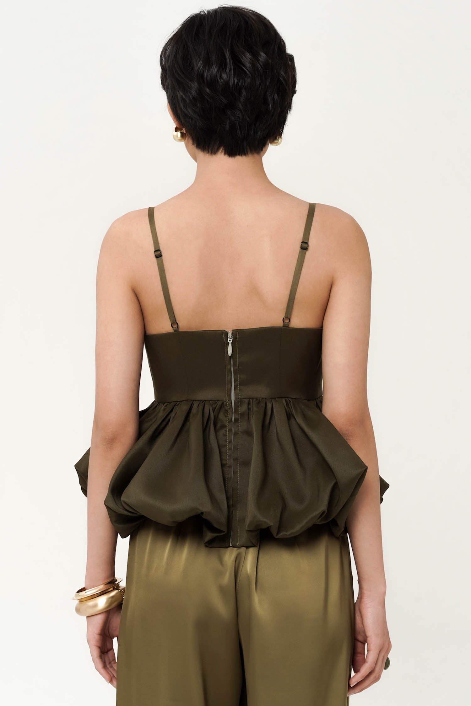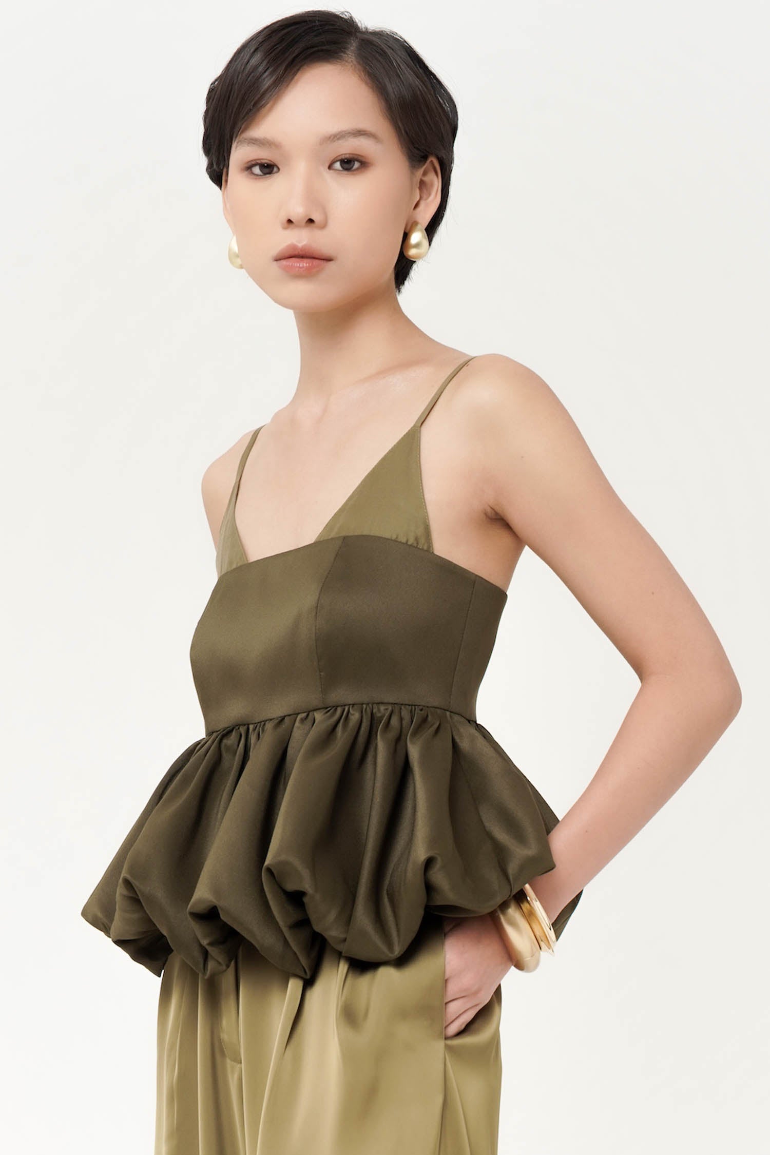 This is a white sleeveless top featuring delicate spaghetti straps and a structured peplum hem with a voluminous, gathered design that creates a playful yet elegant silhouette. The fitted bodice contrasts beautifully with the dramatic puffed waist detail, giving the top a chic and fashion-forward look. Perfect for pairing with tailored pants or skirts for a polished outfit.