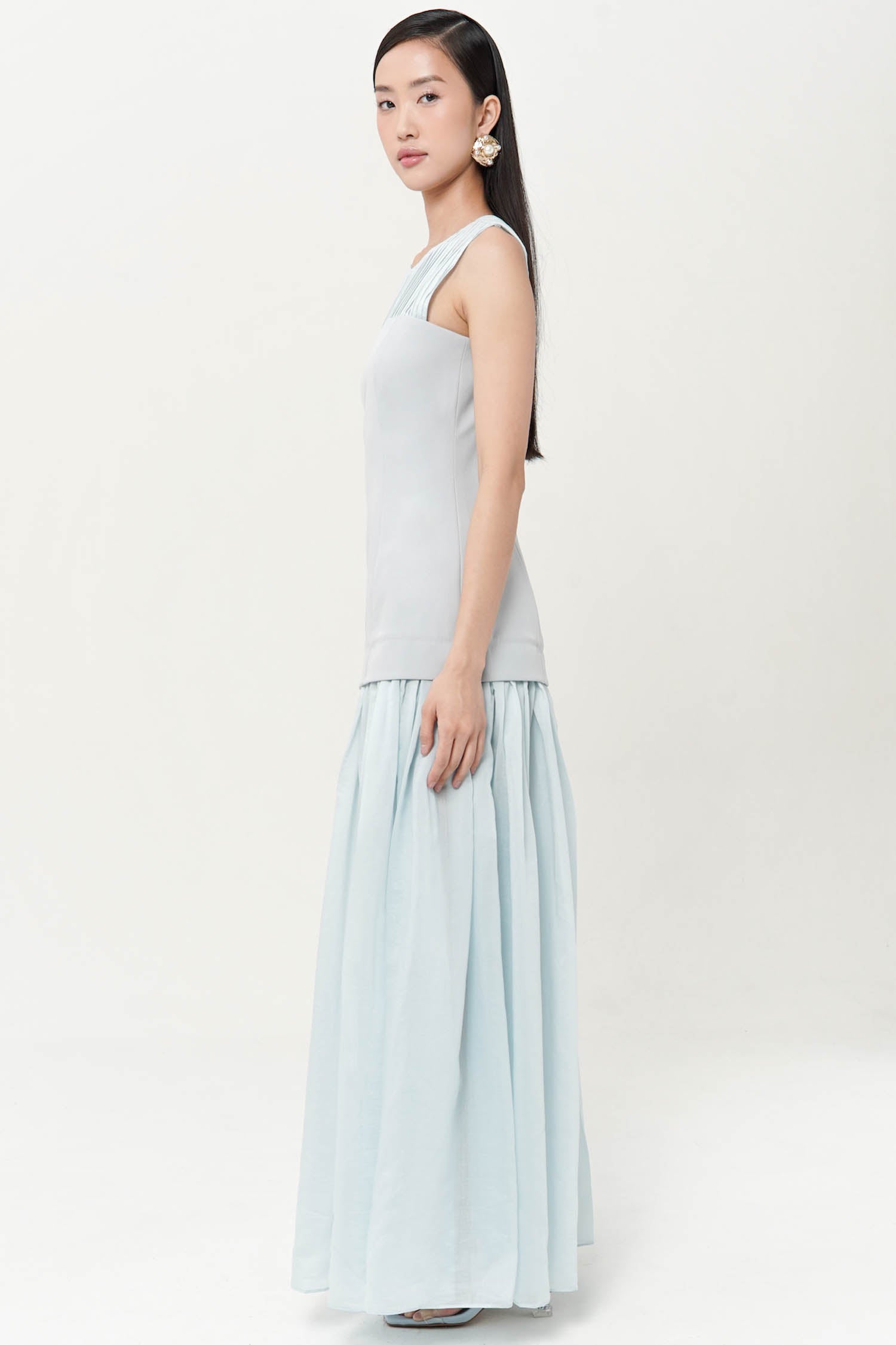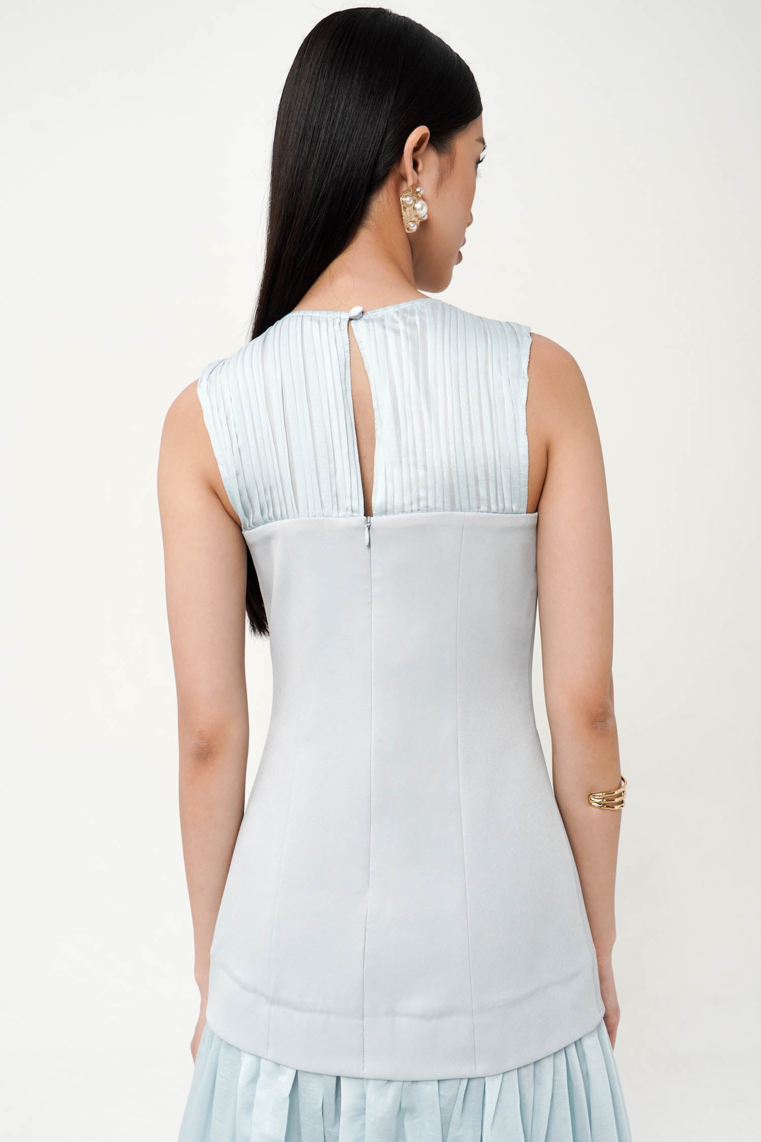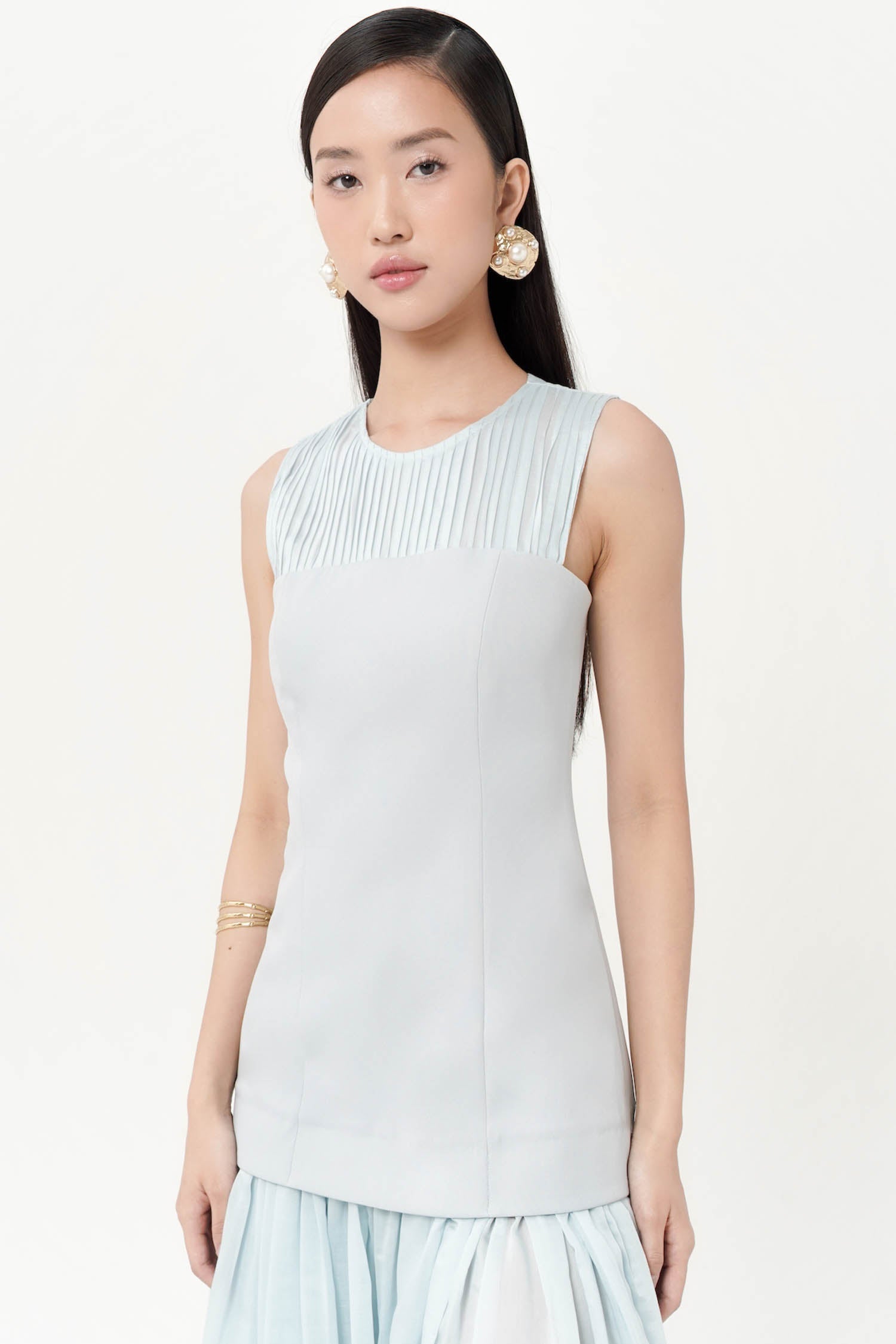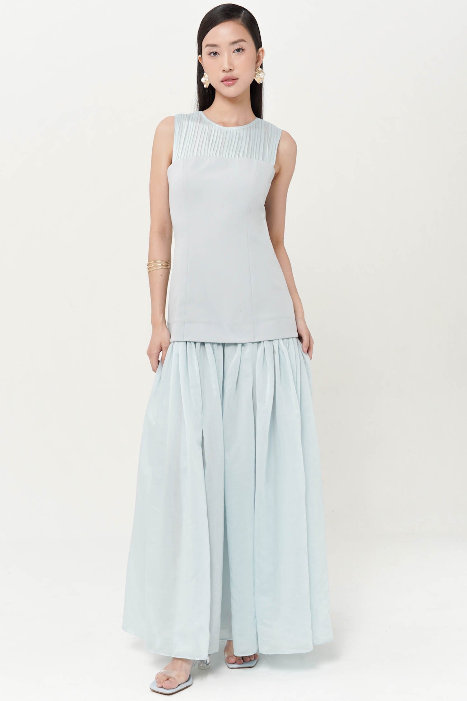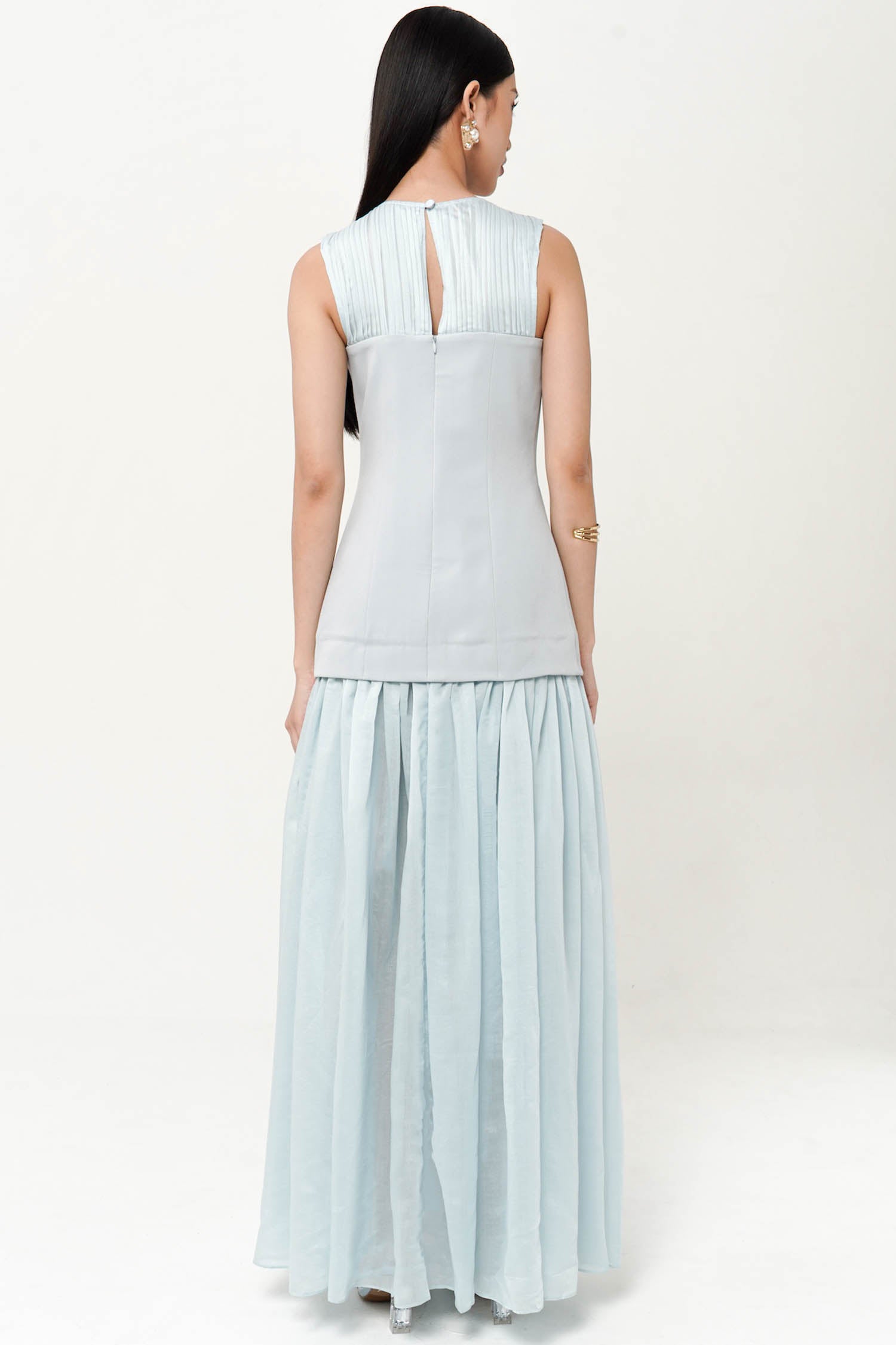 This dress is a sleeveless white gown with a refined and elegant design. The bodice features a fitted silhouette with a sheer pleated panel at the neckline, adding a delicate and feminine touch. The waistline drops slightly before transitioning into a voluminous, floor-length skirt with soft gathers that create graceful flow and movement. The overall look is minimalist yet sophisticated, perfect for formal occasions or a modern bridal style.