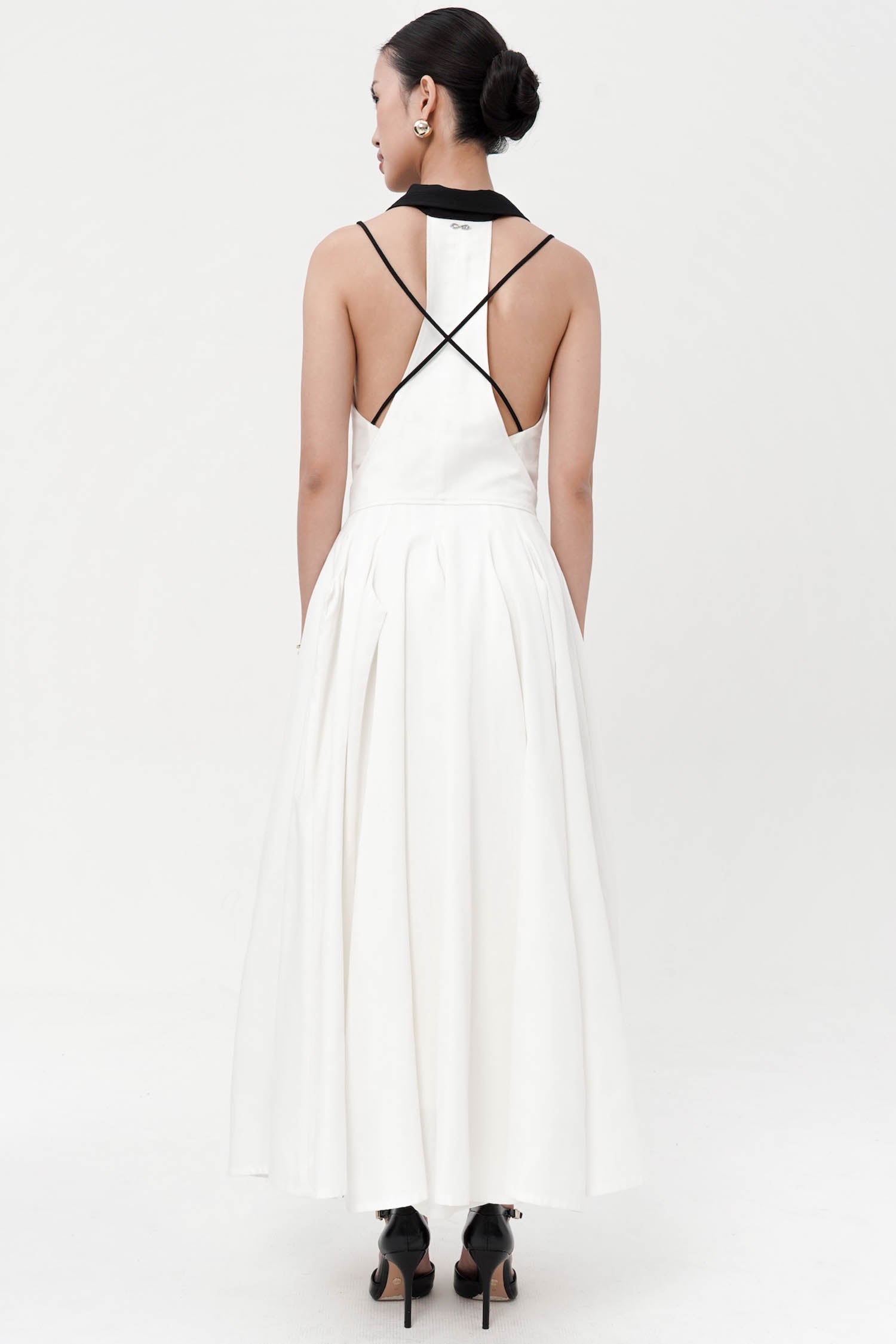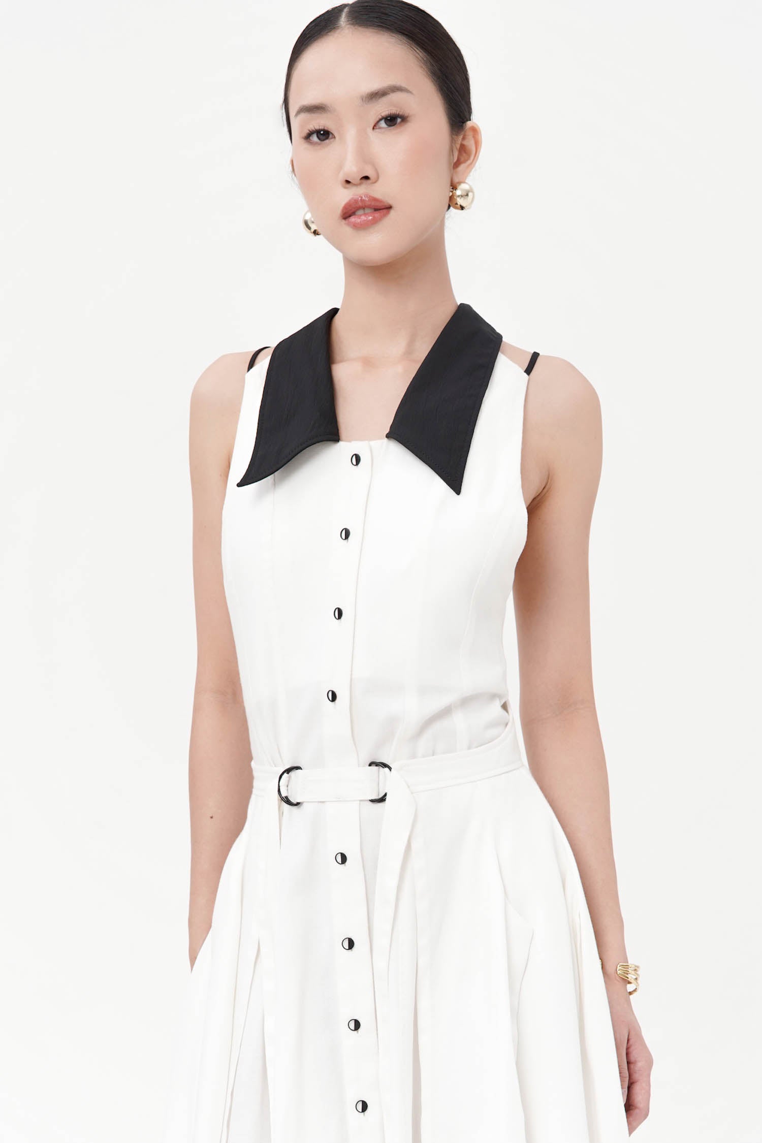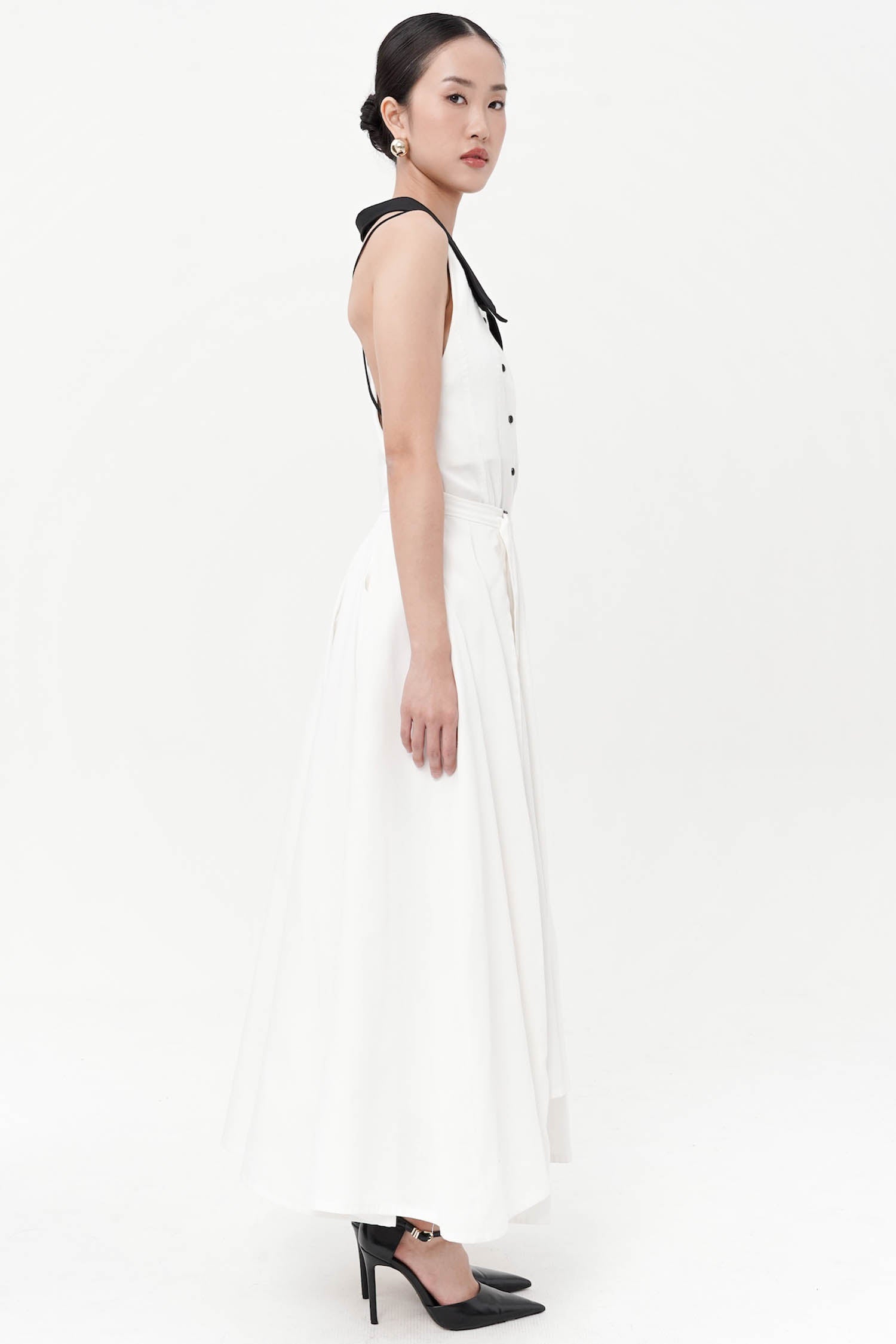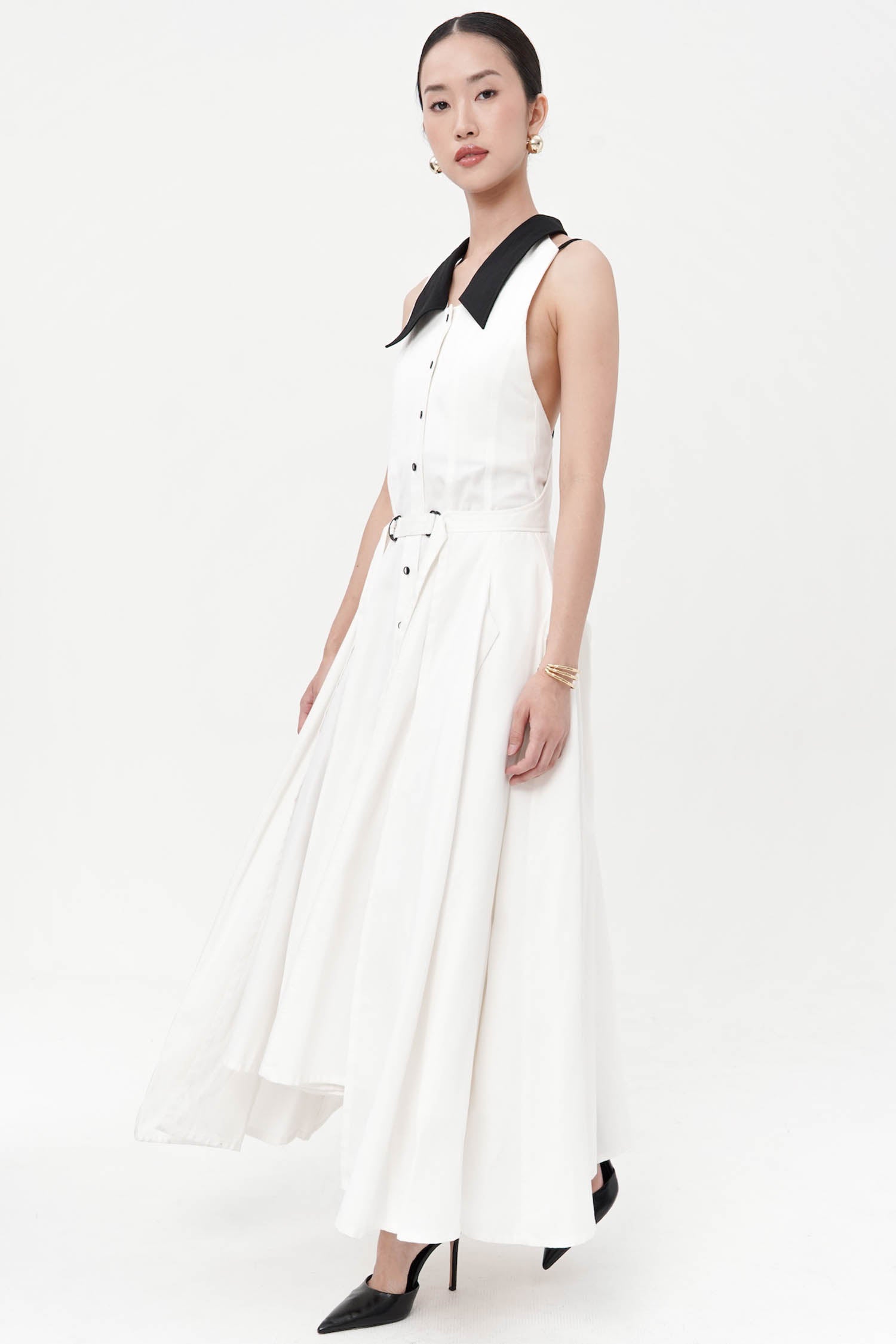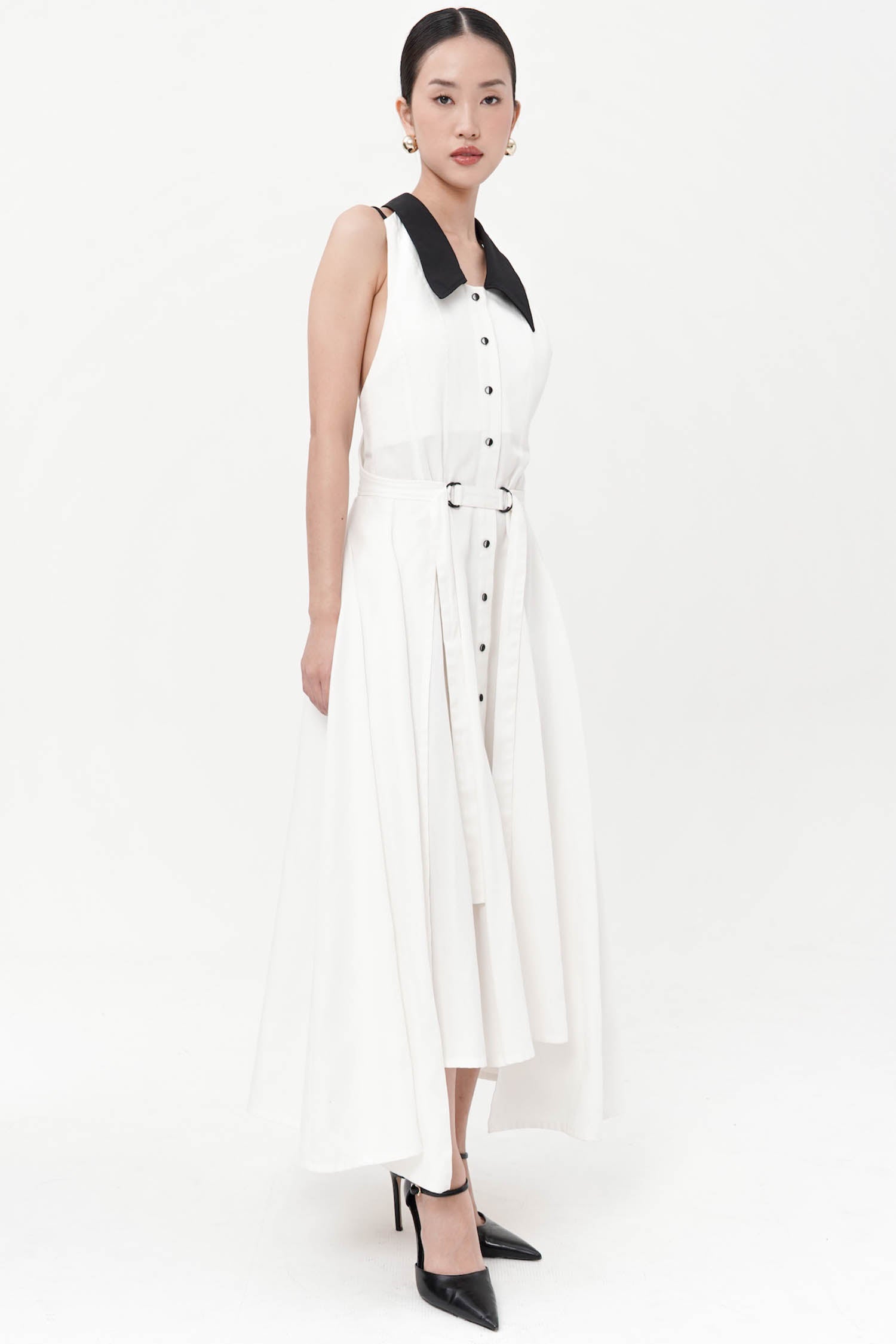 Designed with a button-down front and a sophisticated two-tone color combination, this midi dress features a collared halter neckline and back panel that runs from the back to hemline, which incorporates innovative 3D panels that add architectural dimension and refined structure.