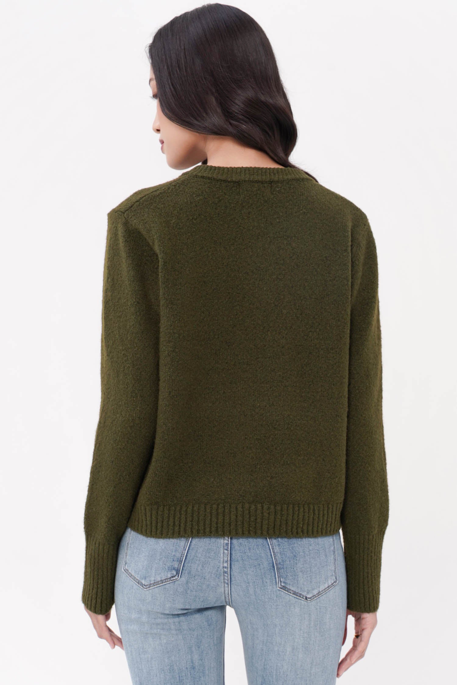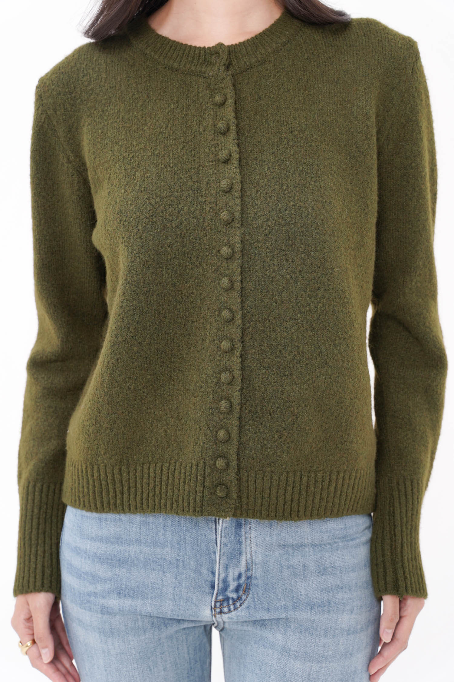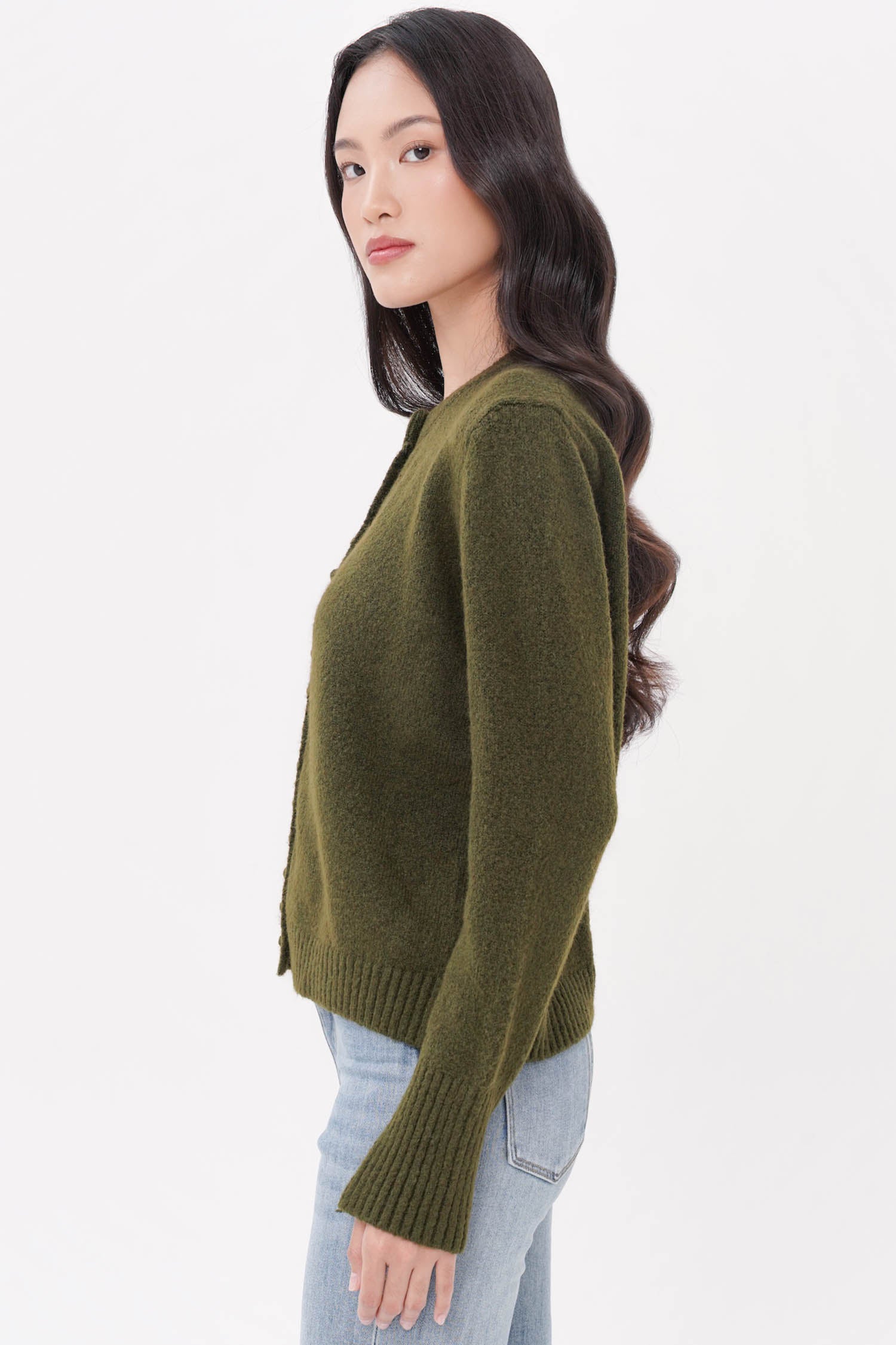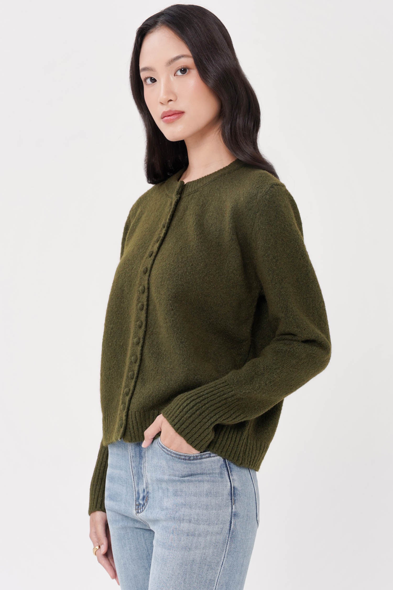 The Raina Cardigan is a timeless essential crafted from a soft polyester knit that offers warmth, comfort, and enduring elegance. Designed with a refined round neckline and adorned with a row of delicate, fabric-covered buttons, it balances minimalism with subtle, textural charm. Its clean silhouette and gently fitted proportions make it effortlessly versatile—layer it over everyday basics for understated polish or pair it with tailored pieces for a more elevated look. Finished with ribbed hems for a touch of structure, the Raina Cardigan is an elegant wardrobe staple available in olive, broken white, and espresso.