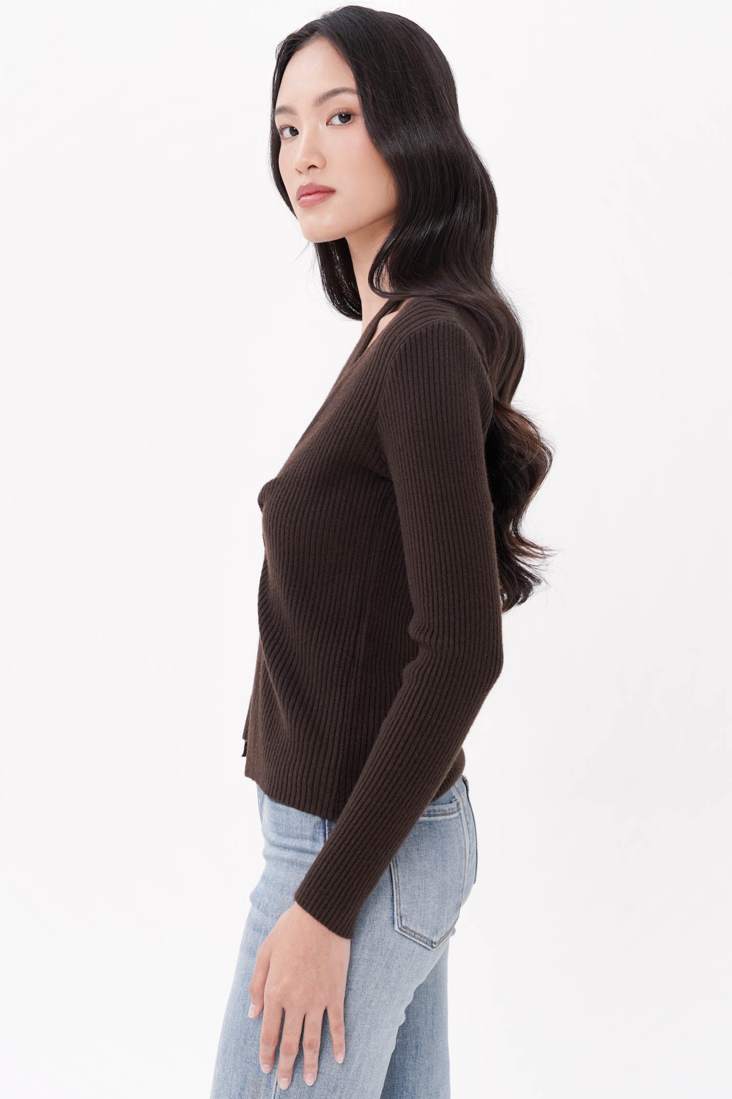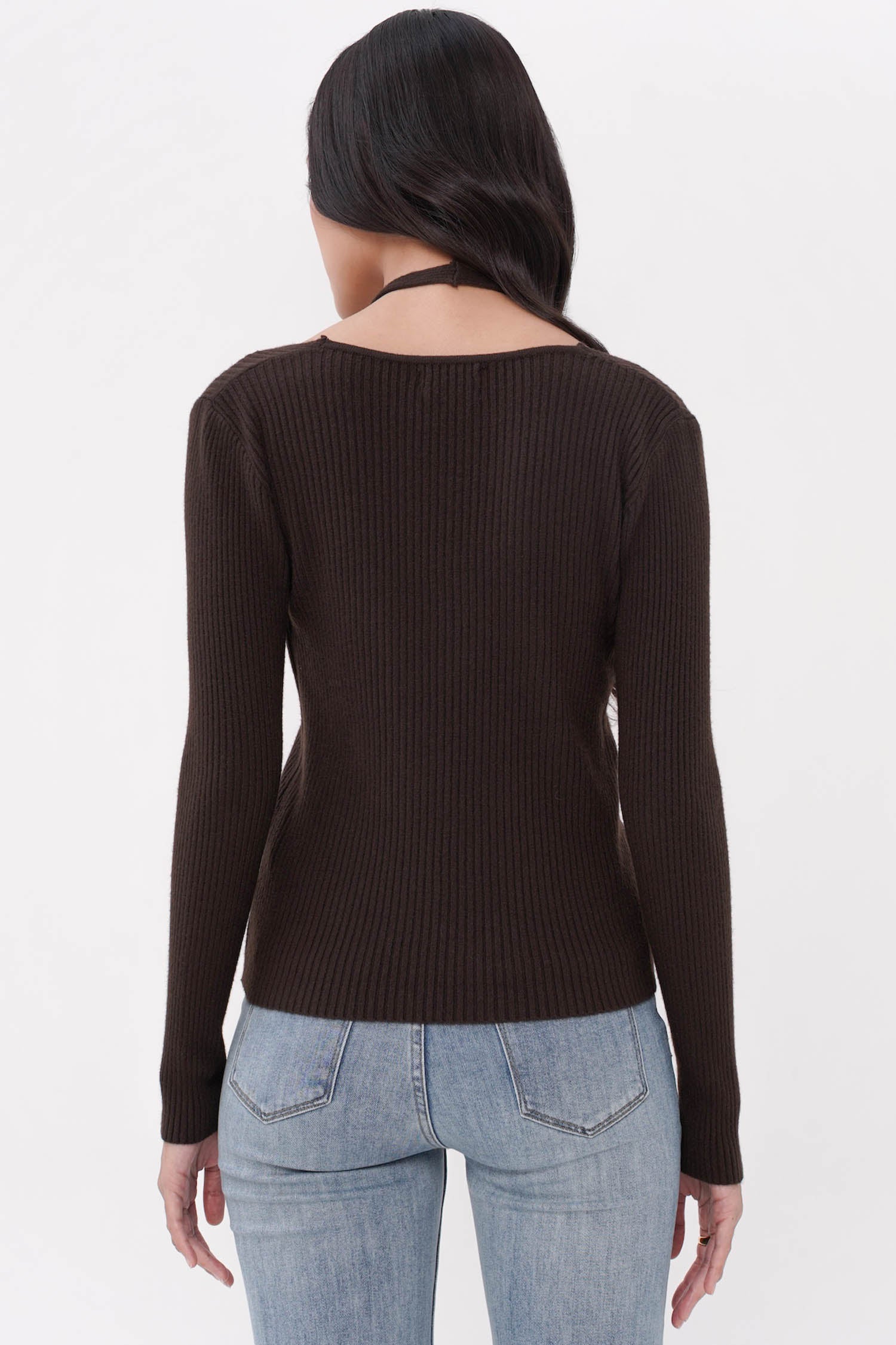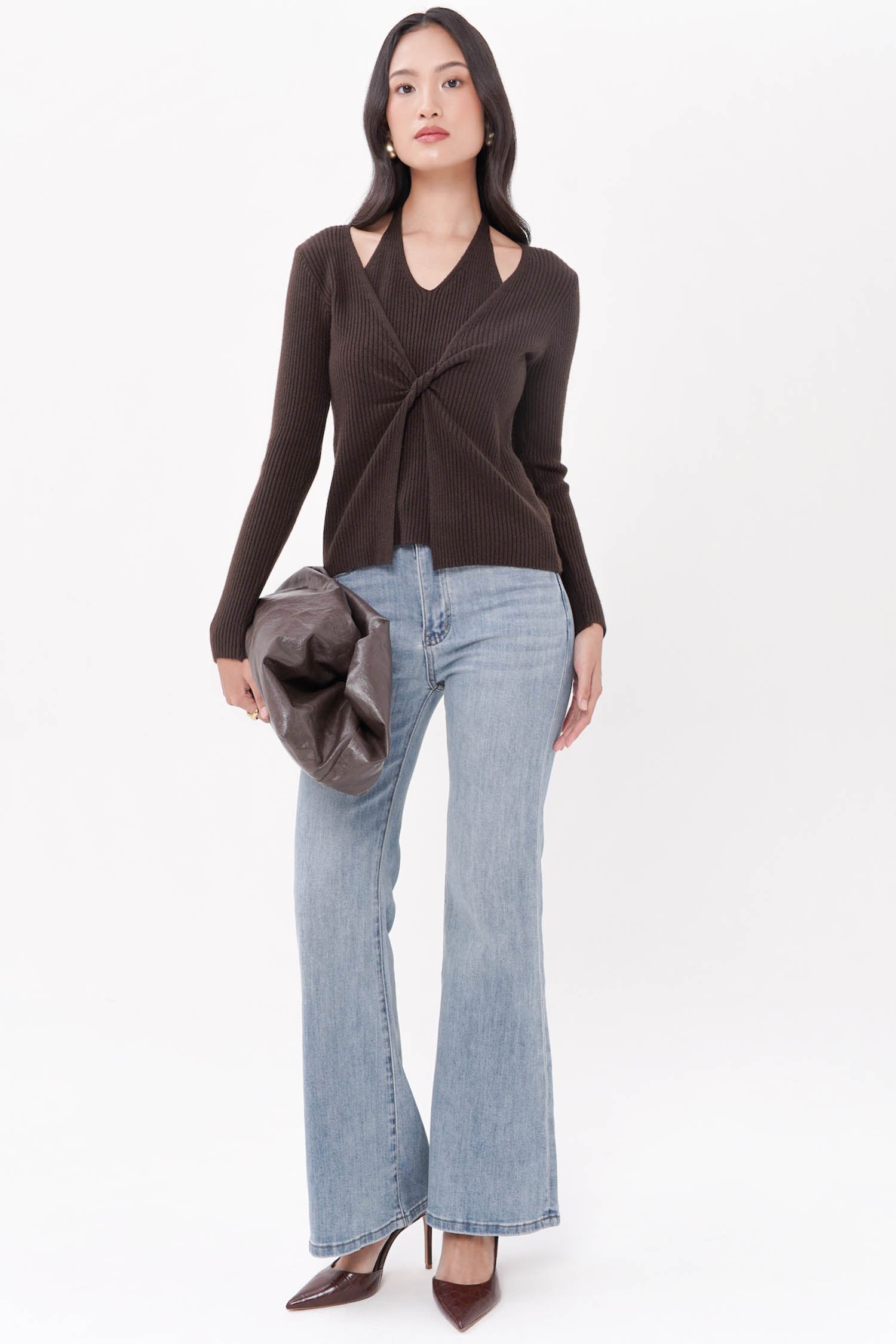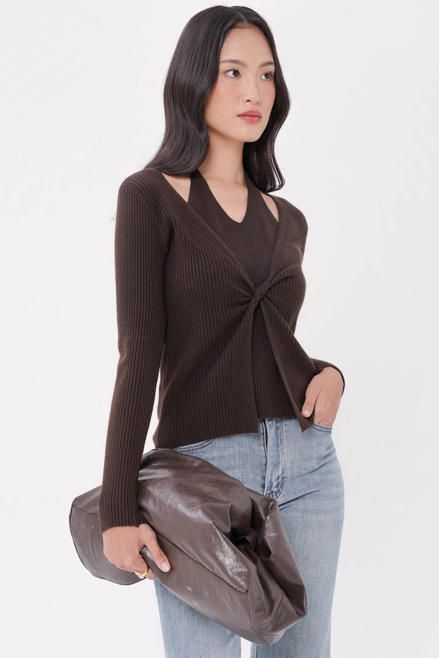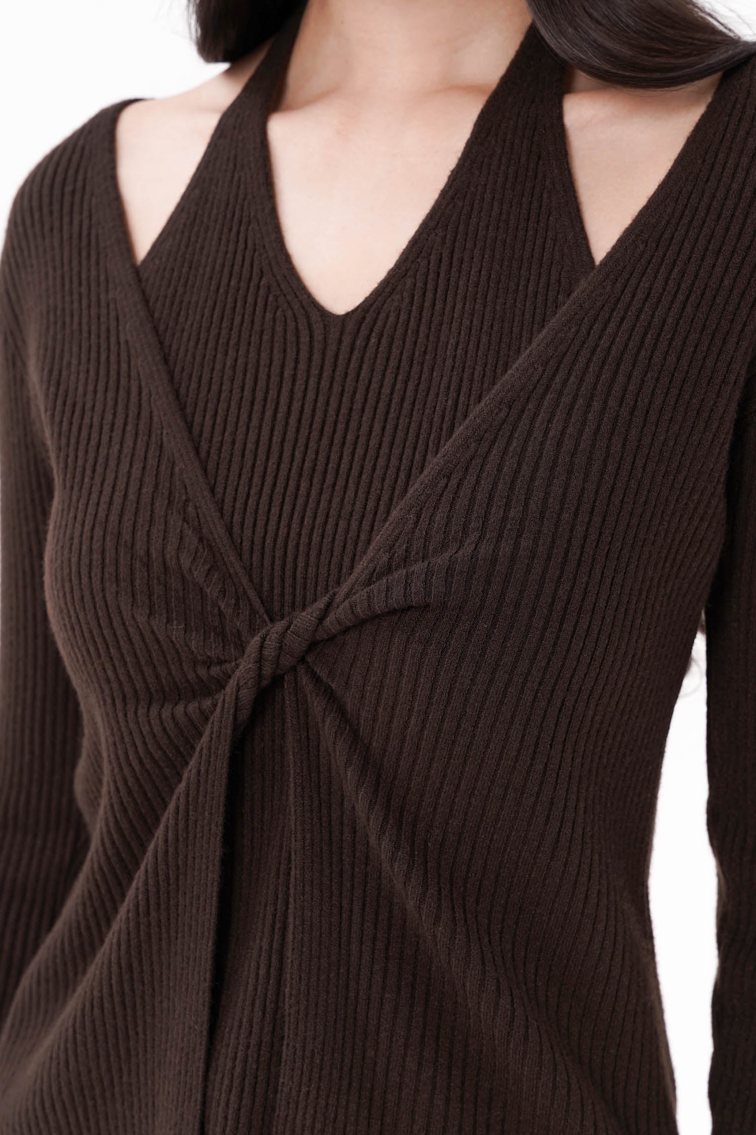 The Rooney Twist Halter Top is a modern statement piece that blends sculptural elegance with effortless wearability, crafted from a soft and flexible polyester knit that contours gracefully to the body. Its distinctive halter neckline frames the shoulders with refined allure, while the artful front twist creates a subtle drape that adds depth and movement to the silhouette. Designed with elongated sleeves and a clean, minimal back, this piece offers a harmonious balance of sophistication and contemporary edge. Versatile enough for elevated casual looks or chic evening ensembles, the Rooney Twist Halter Top embodies understated refinement. Available in dark grey and espresso.