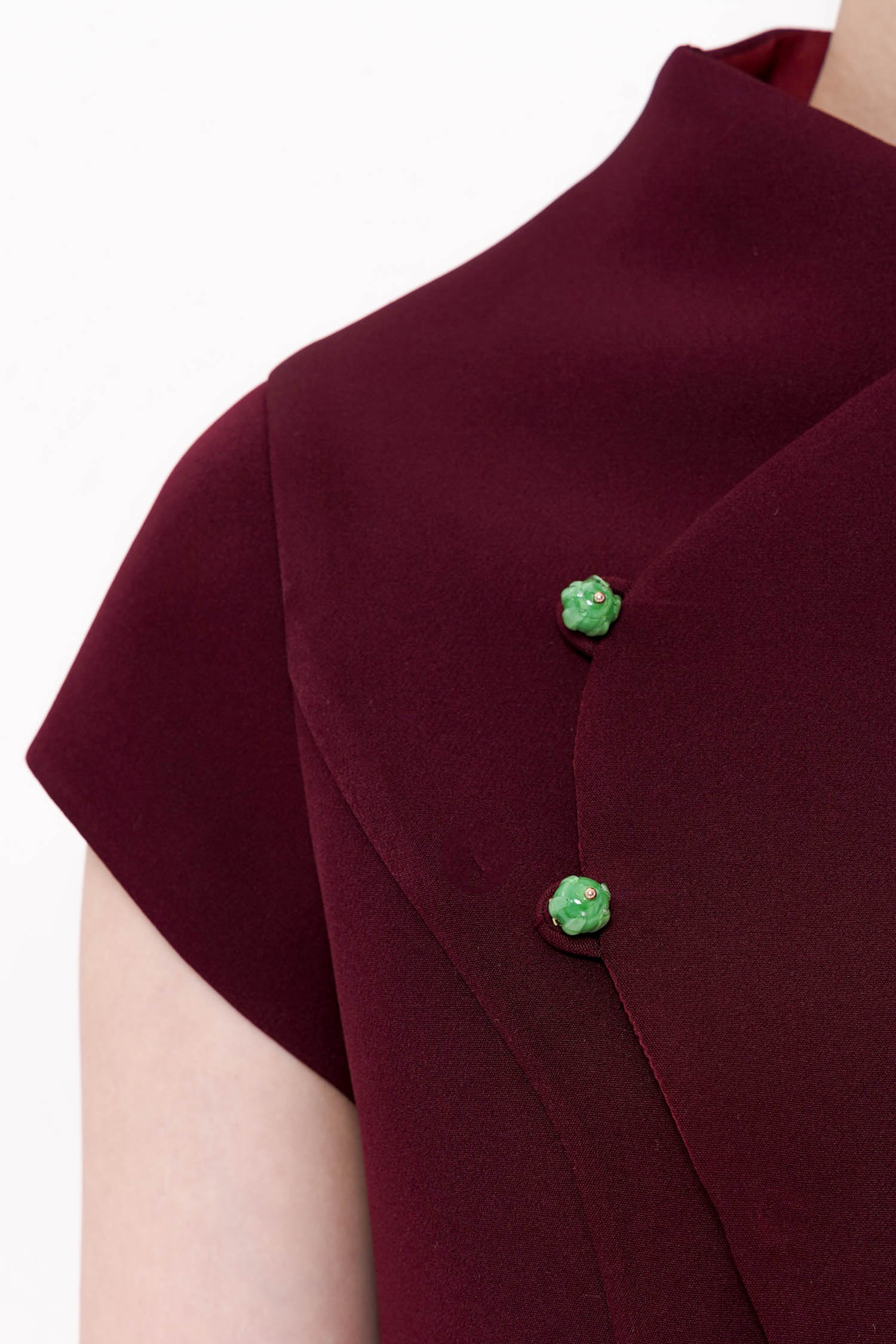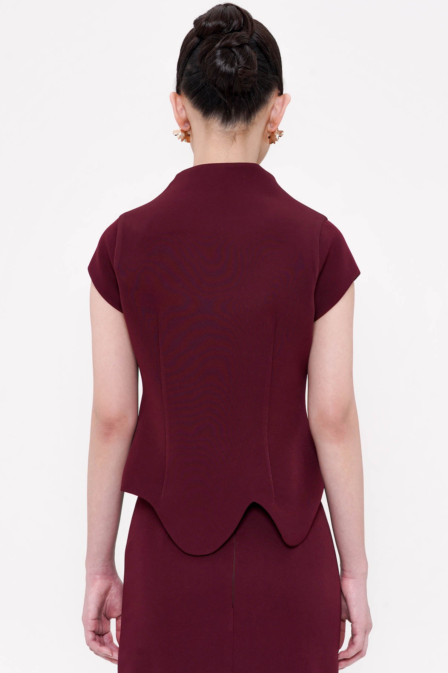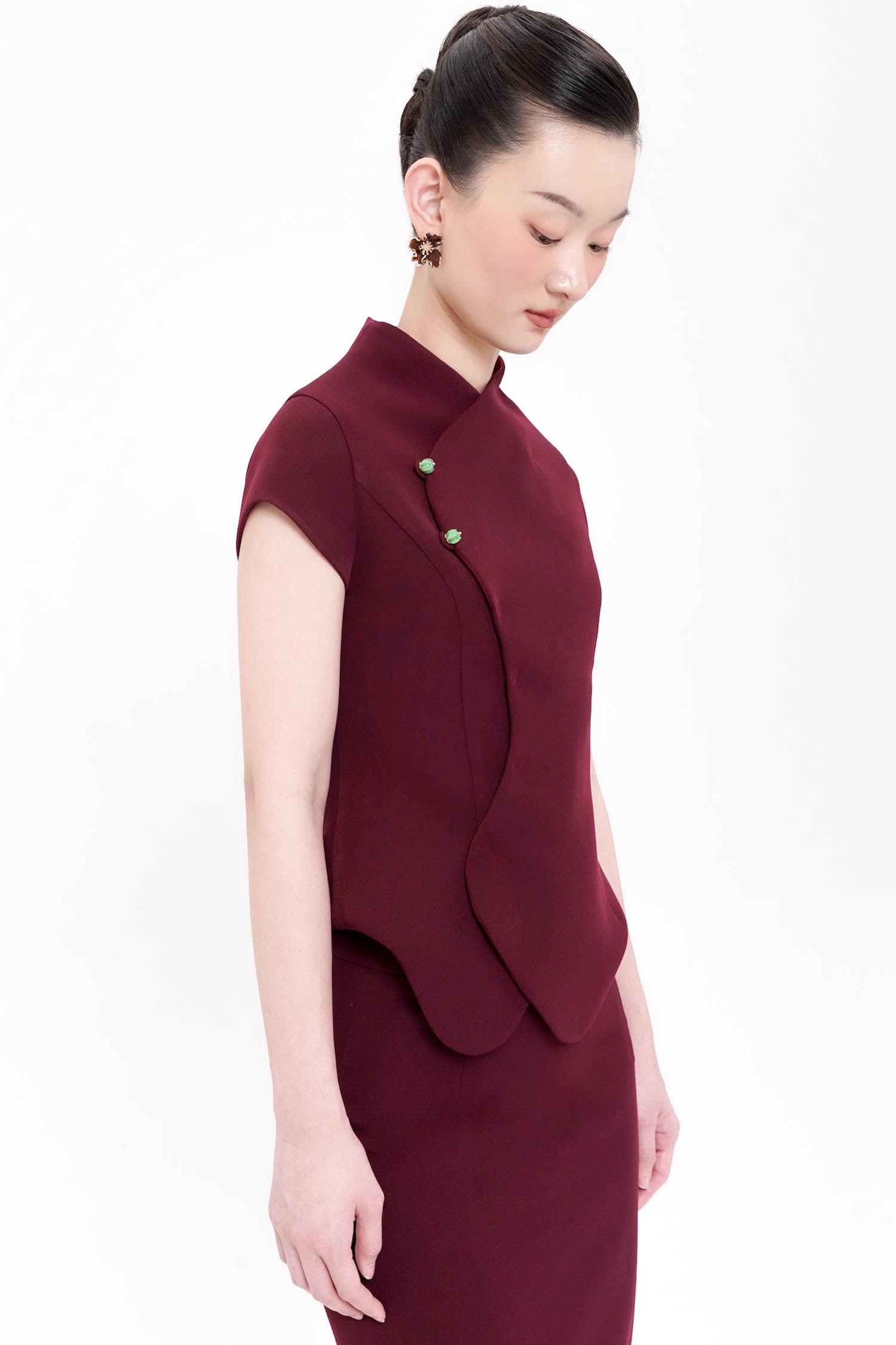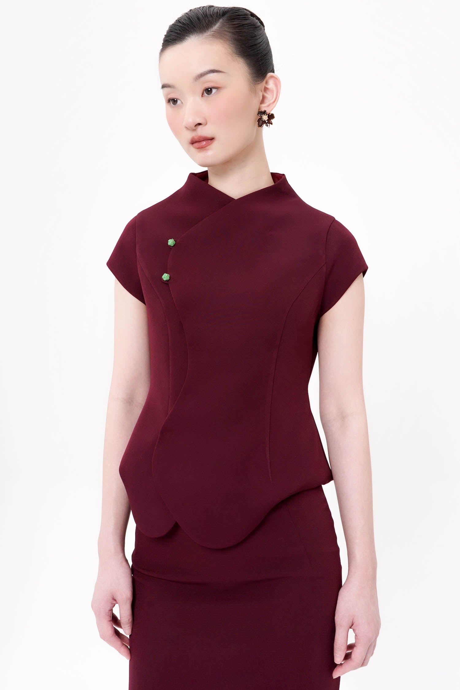 The Ruyi Top in Maroon is a refined expression of contemporary elegance, crafted from semi wool for a structured yet graceful silhouette. Inspired by traditional Eastern forms, the asymmetrical wrap front and sculpted lines create a fluid sense of movement while subtly contouring the body. Finished with delicate ornamental buttons and a softly scalloped hem, the design balances strength and femininity with quiet sophistication. Rich in tone and meticulous in detail, this piece offers a polished presence that transitions effortlessly from formal daytime engagements to evening occasions.