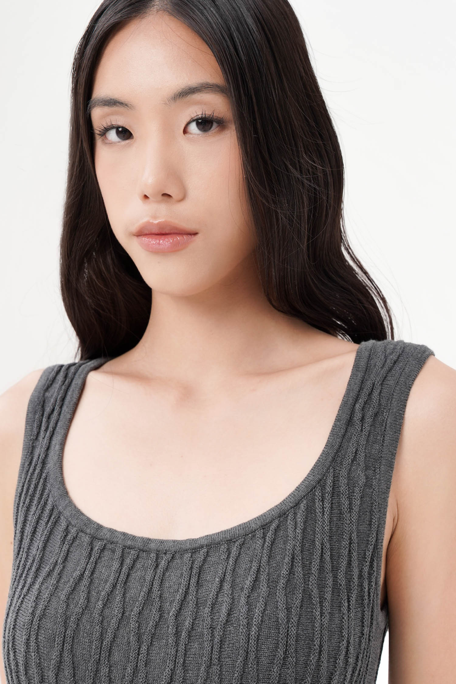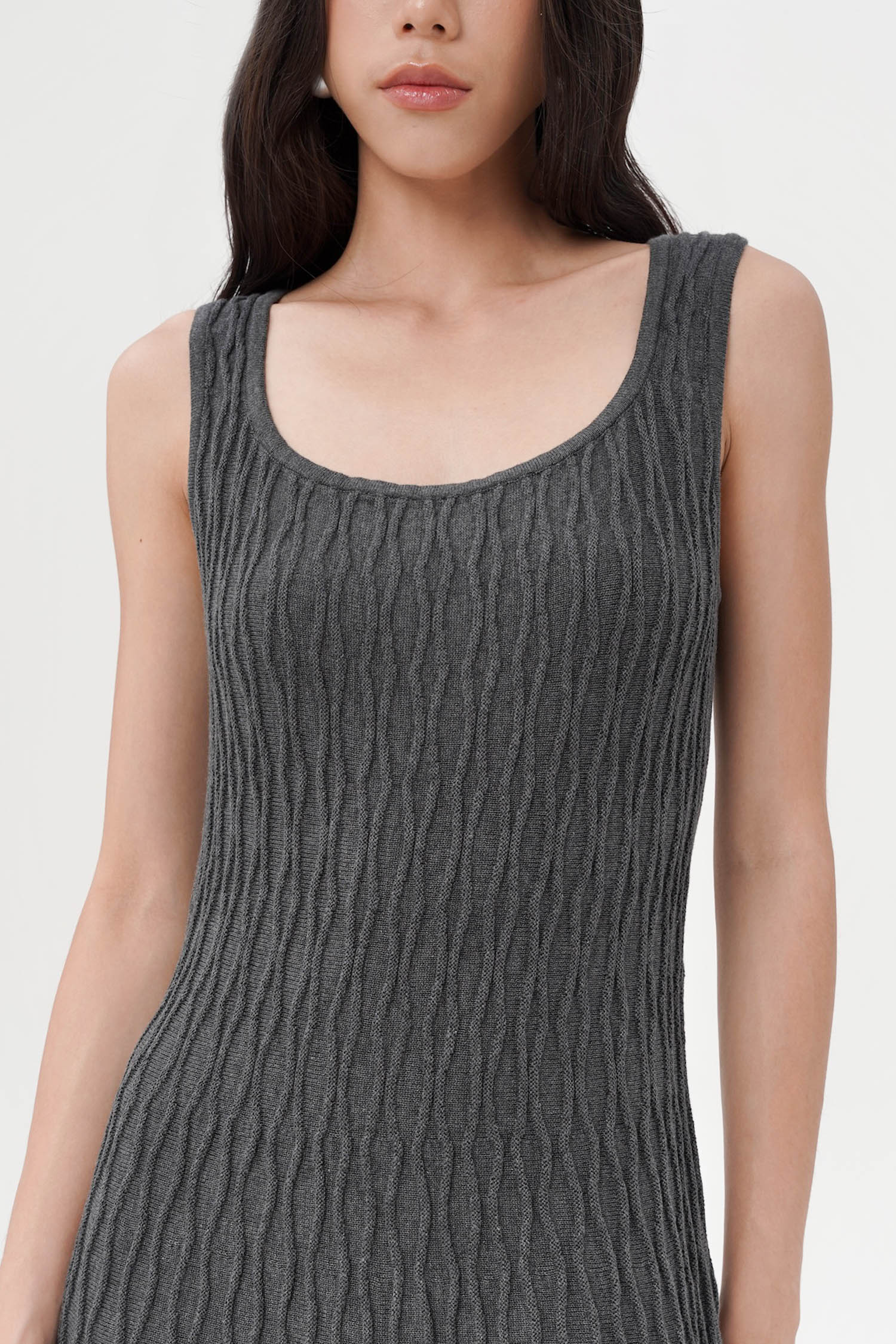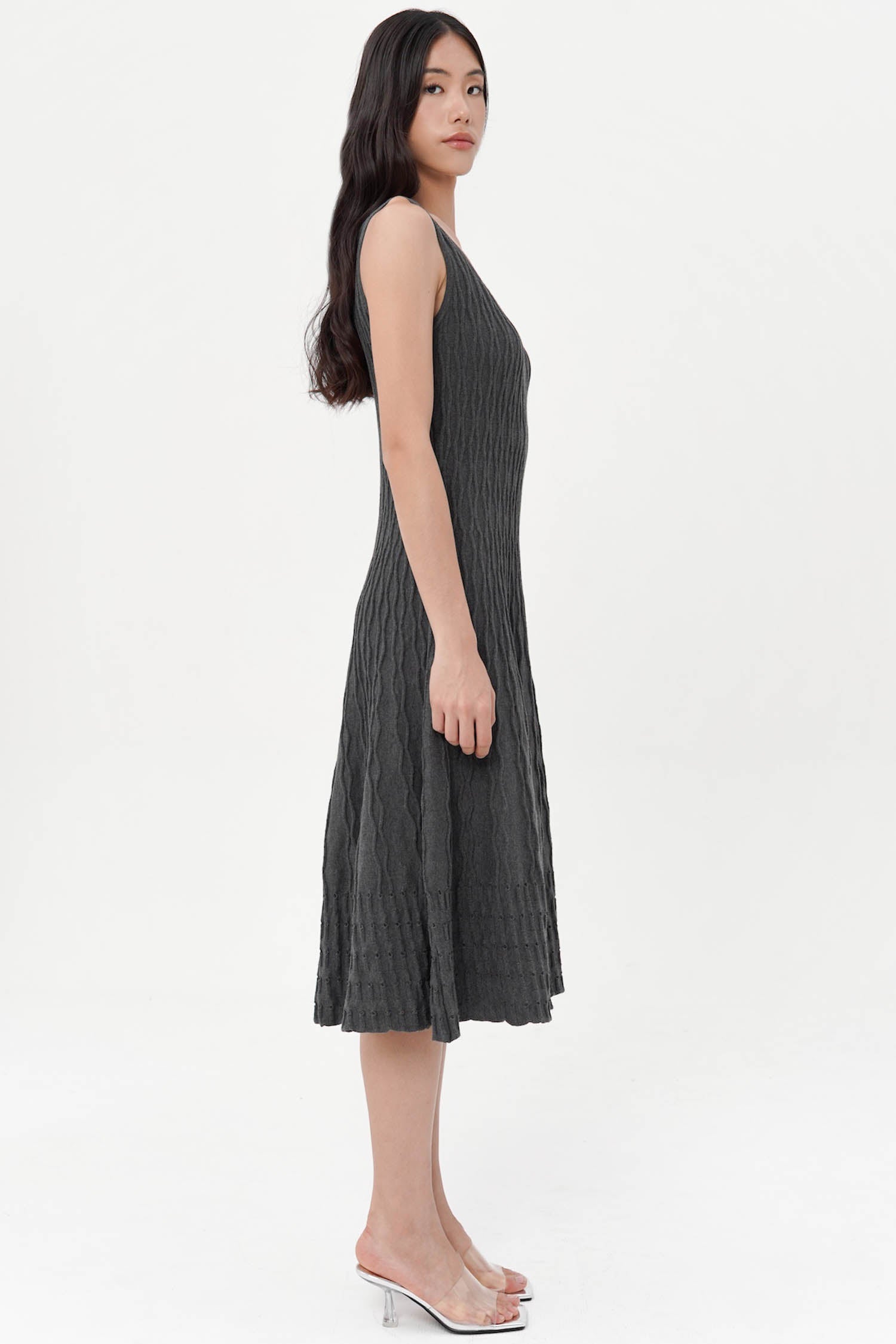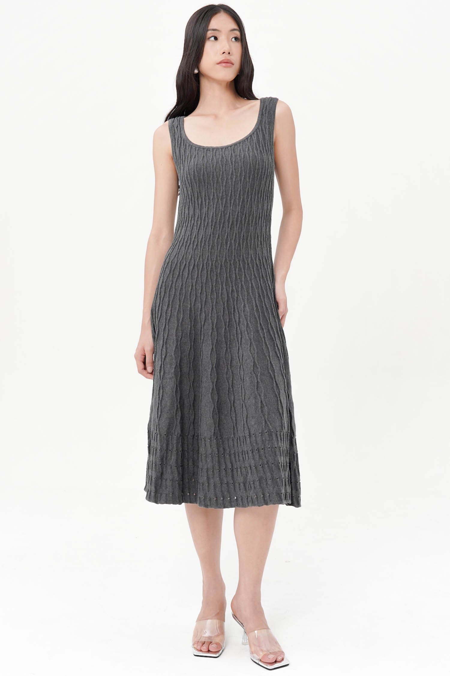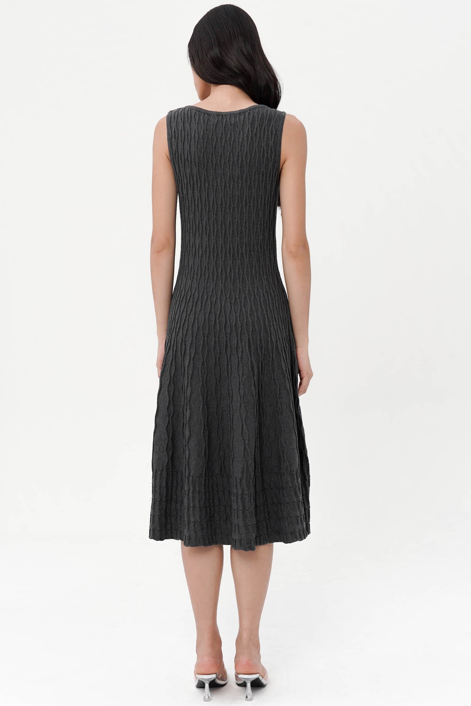 The Saffron Midi Knit Dress captures the essence of modern femininity through its refined simplicity and tactile depth. Crafted from soft cotton knit, it features a sculpted, body-skimming silhouette that flares gently into a fluid midi hem, accentuated by intricate cable-knit detailing that adds both structure and movement. The sleeveless design and rounded neckline lend it a timeless versatility—equally poised for daytime polish or understated evening elegance. Available in Mocha, Dark Grey, and Navy, the Saffron Midi Knit Dress embodies effortless sophistication with a hint of quiet allure.