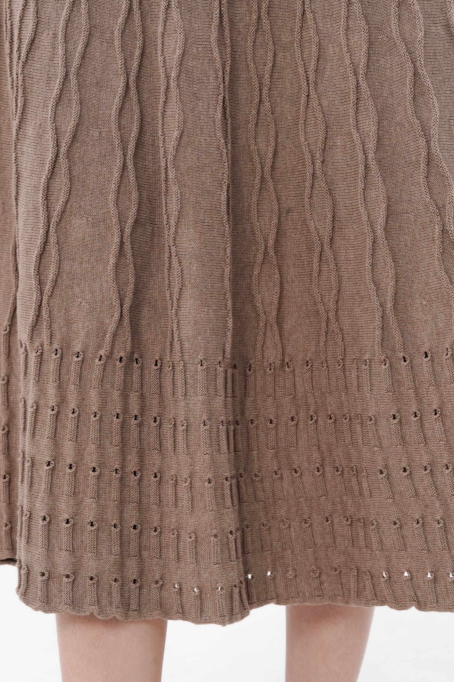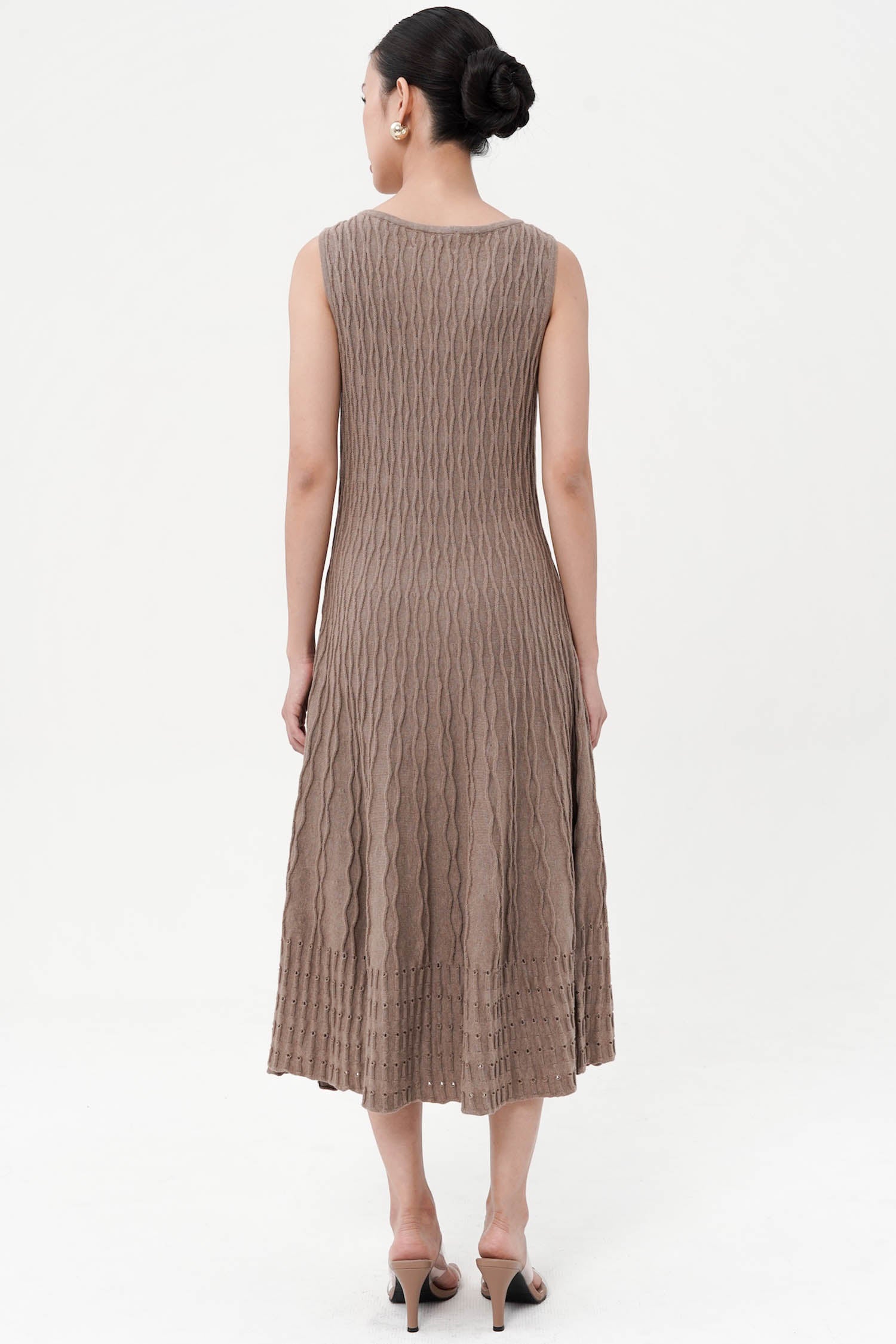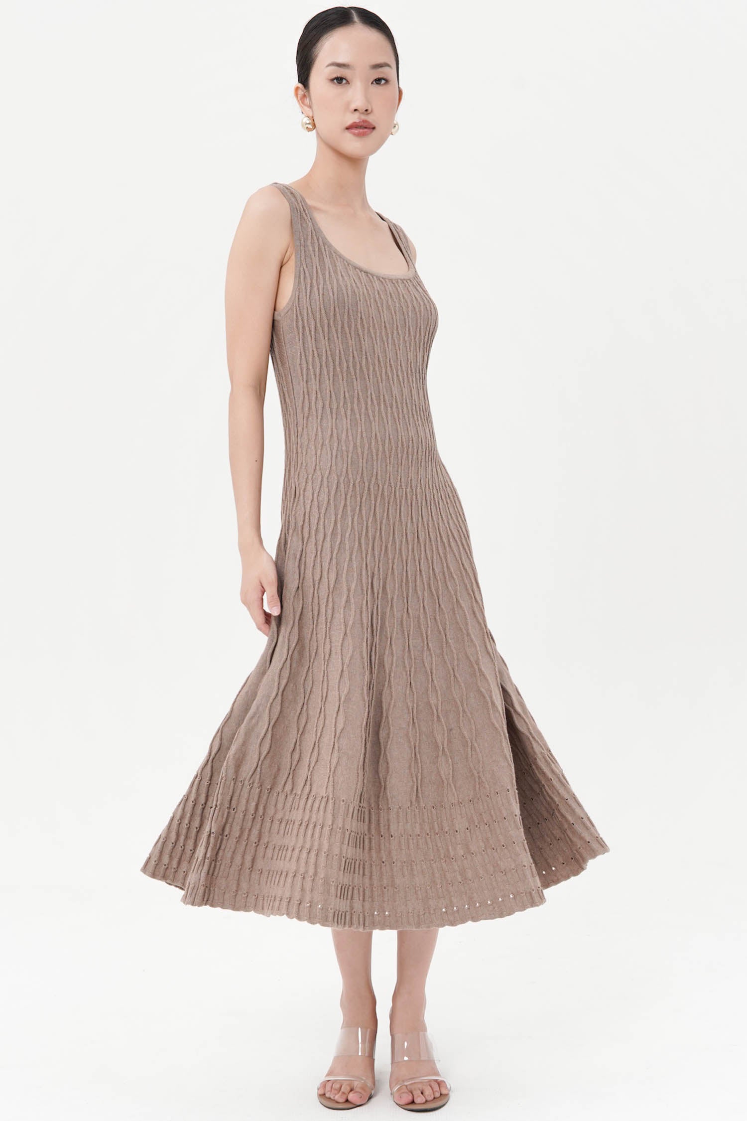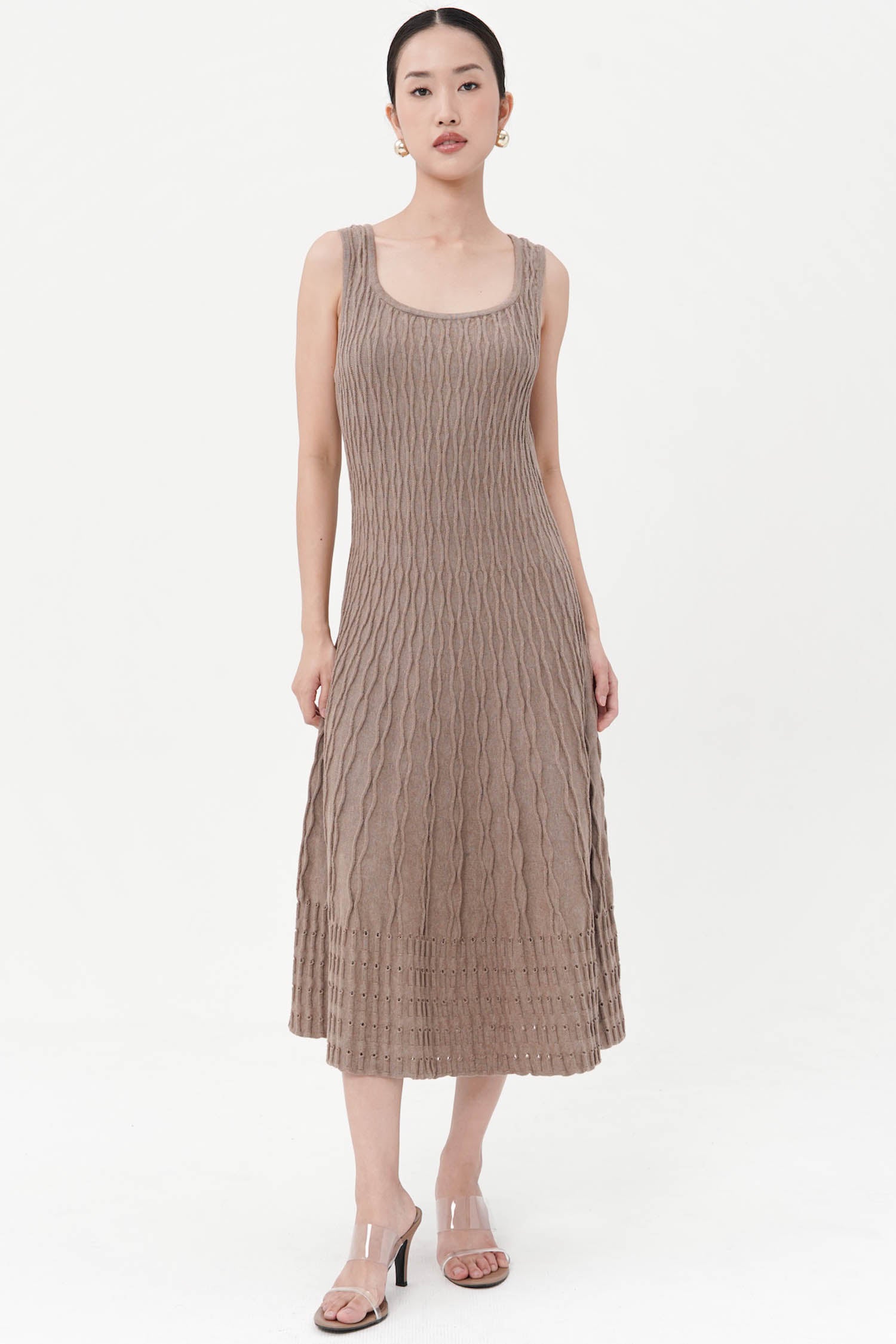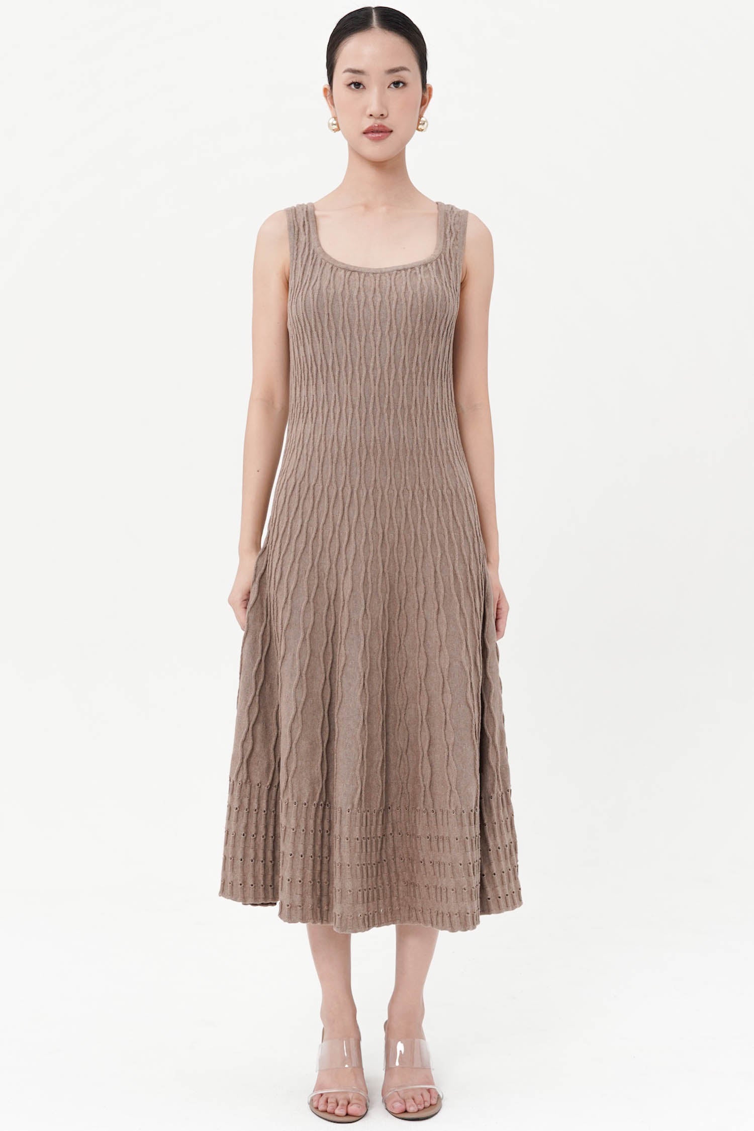 The Saffron Midi Knit Dress captures the essence of modern femininity through its refined simplicity and tactile depth. Crafted from soft cotton knit, it features a sculpted, body-skimming silhouette that flares gently into a fluid midi hem, accentuated by intricate cable-knit detailing that adds both structure and movement. The sleeveless design and rounded neckline lend it a timeless versatility—equally poised for daytime polish or understated evening elegance. Available in Mocha, Dark Grey, and Navy, the Saffron Midi Knit Dress embodies effortless sophistication with a hint of quiet allure.