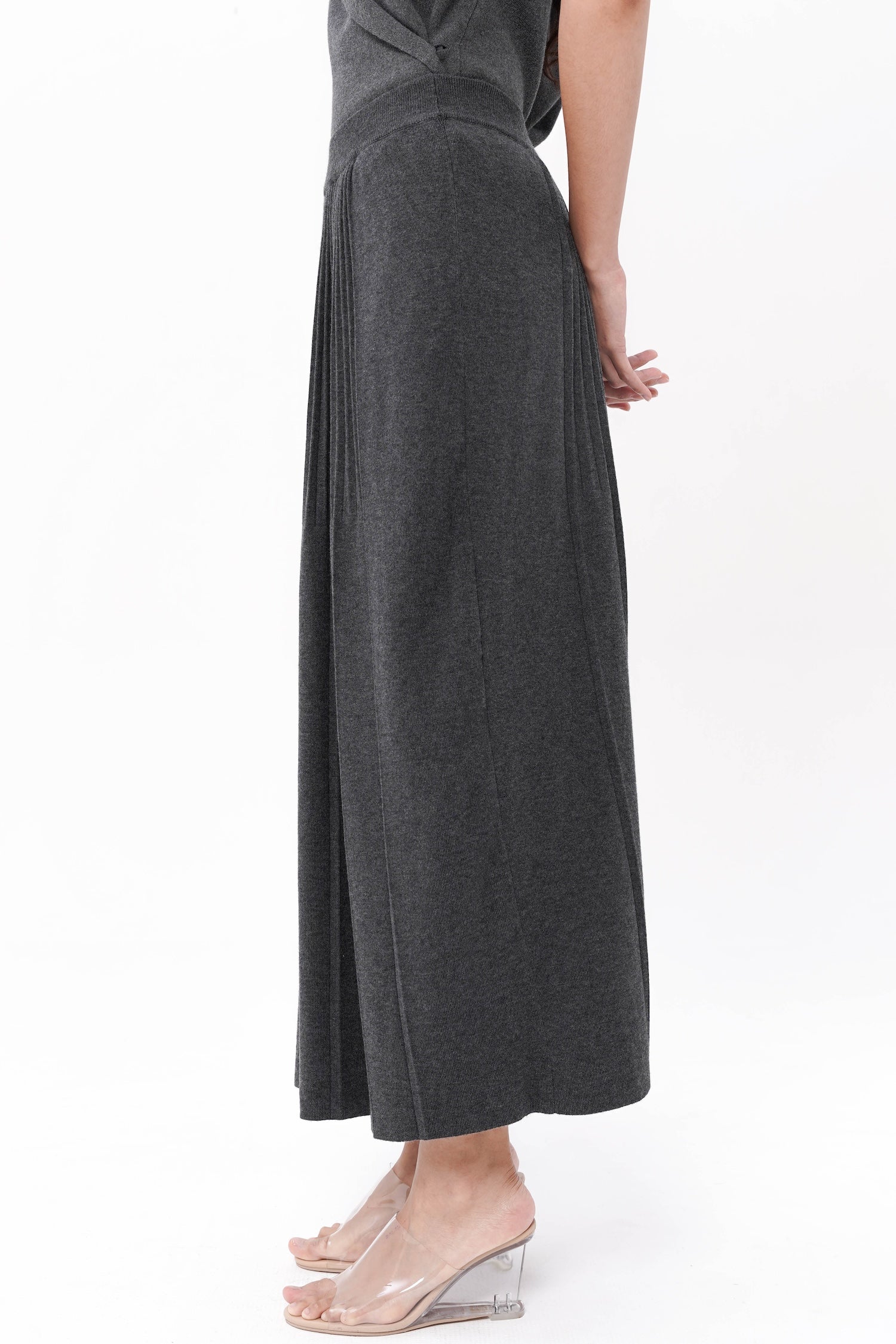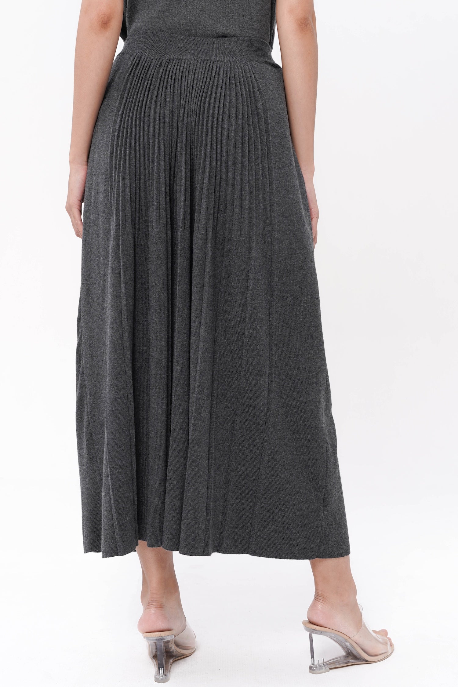 The Serena Maxi Knit Skirt is a refined expression of quiet luxury, crafted from soft, fluid polyester that drapes effortlessly into a full, graceful silhouette. Defined by its meticulously structured pleats that cascade from a smooth, contoured waistband, the skirt moves with an elegant, understated flow, offering both comfort and sophistication in equal measure. Designed to elongate the form while maintaining an ease of wear, it transitions seamlessly from polished daytime ensembles to elevated evening looks. Available in three timeless shades—Espresso, Dark Grey, and Taupe—the Serena Maxi Knit Skirt is a versatile staple that embodies modern femininity with a serene, sculptural presence.