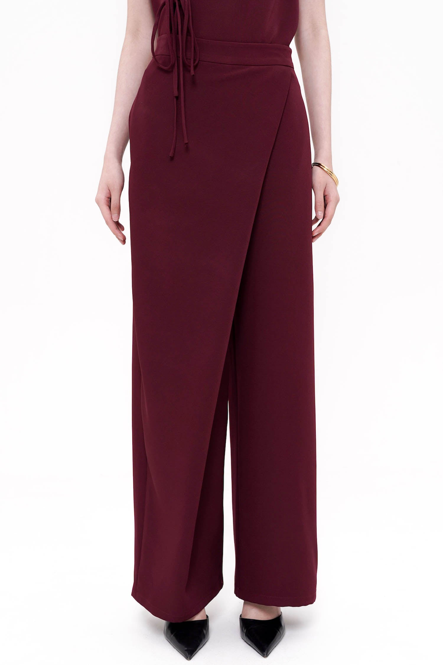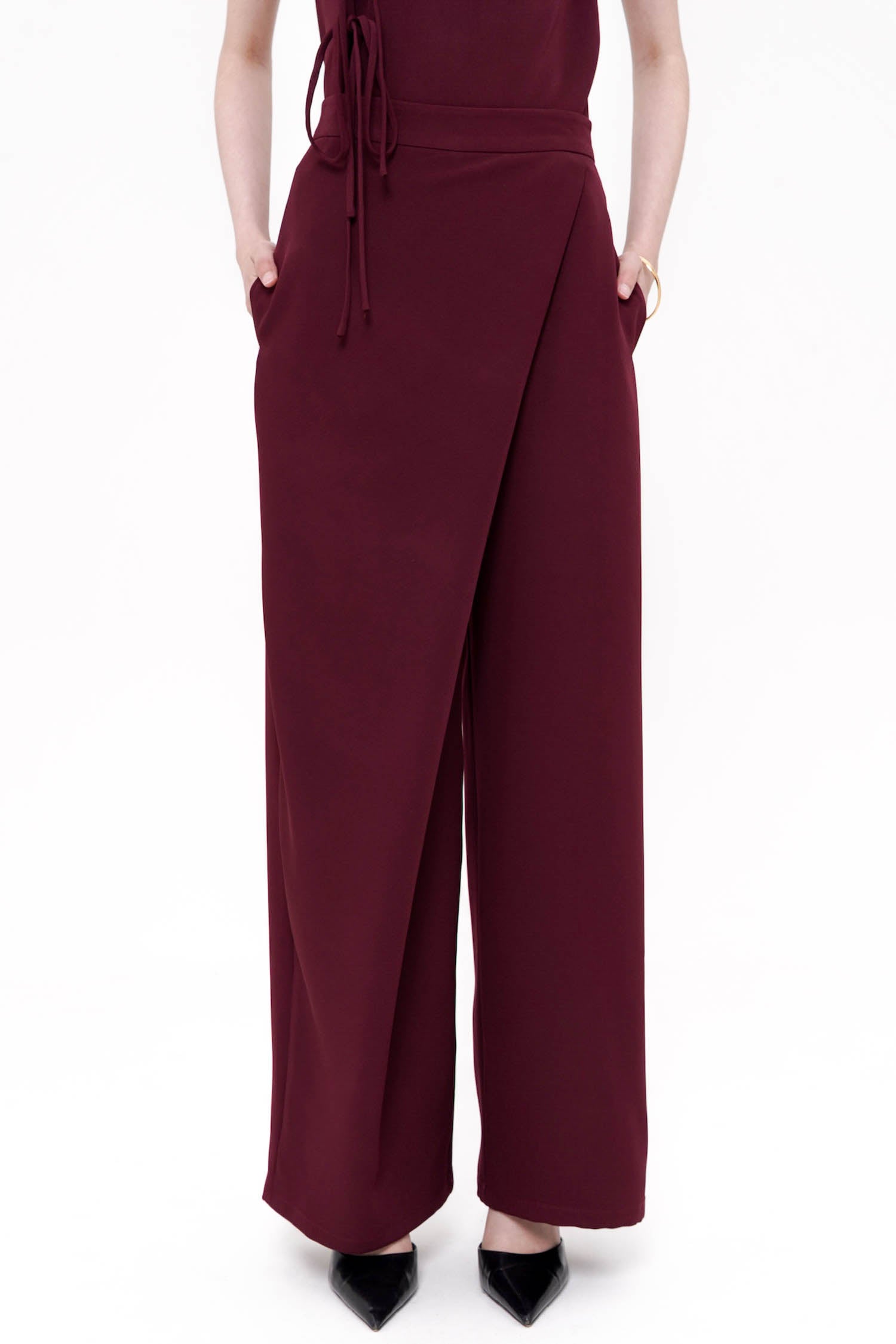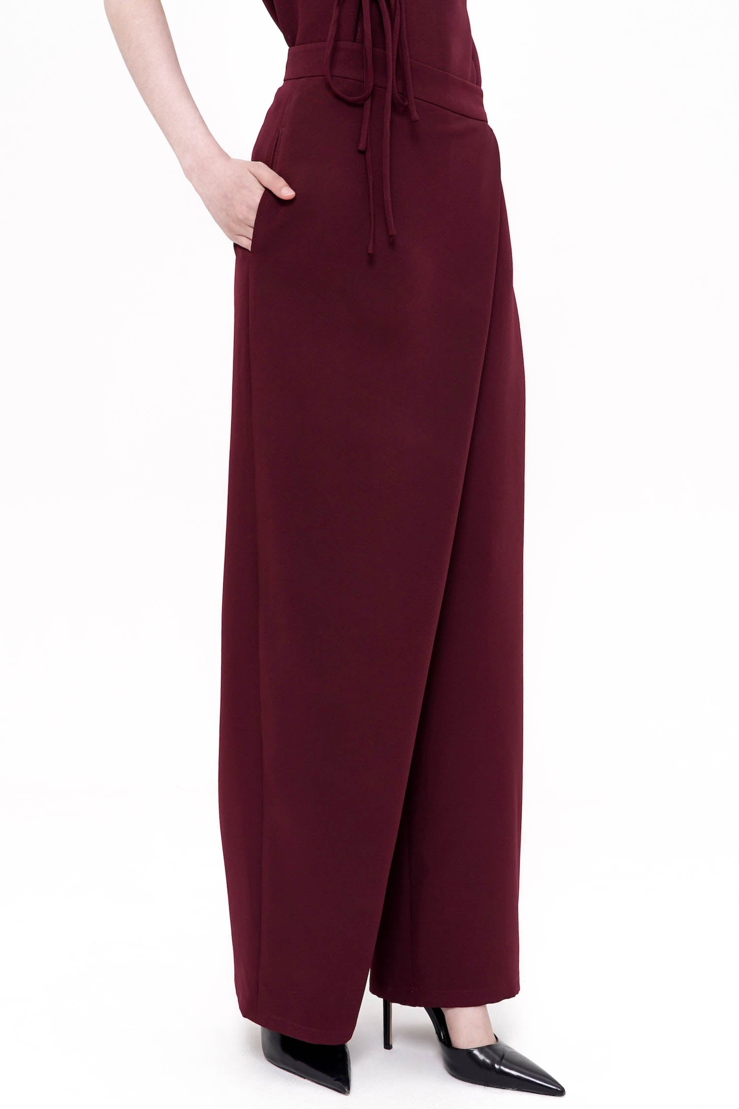 The Song Wrapped Trousers in Maroon embody modern tailoring with a refined sense of elegance, crafted from semi-wool fabric that offers a structured yet fluid drape. Designed with a distinctive wrap-front detail, these trousers create the illusion of a skirt while maintaining the ease and confidence of wide-leg pants. The high-waisted silhouette elongates the line of the body, complemented by clean seams, discreet pockets, and a polished back finish that ensures a sleek profile from every angle. Finished in a rich maroon hue, this sophisticated piece transitions seamlessly from refined daytime styling to elevated evening wear, making it a timeless addition to a curated wardrobe.