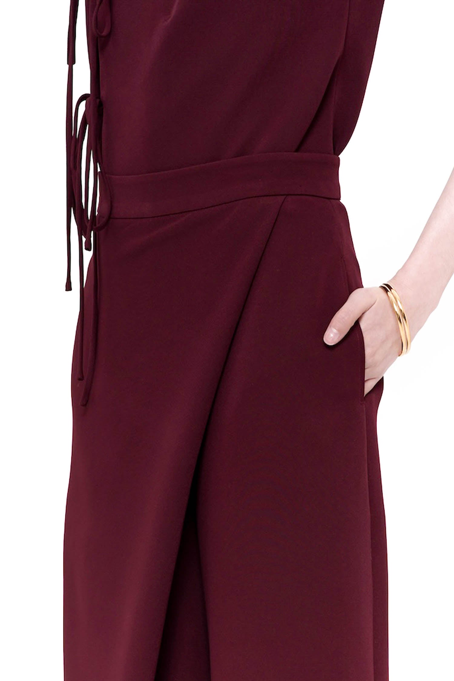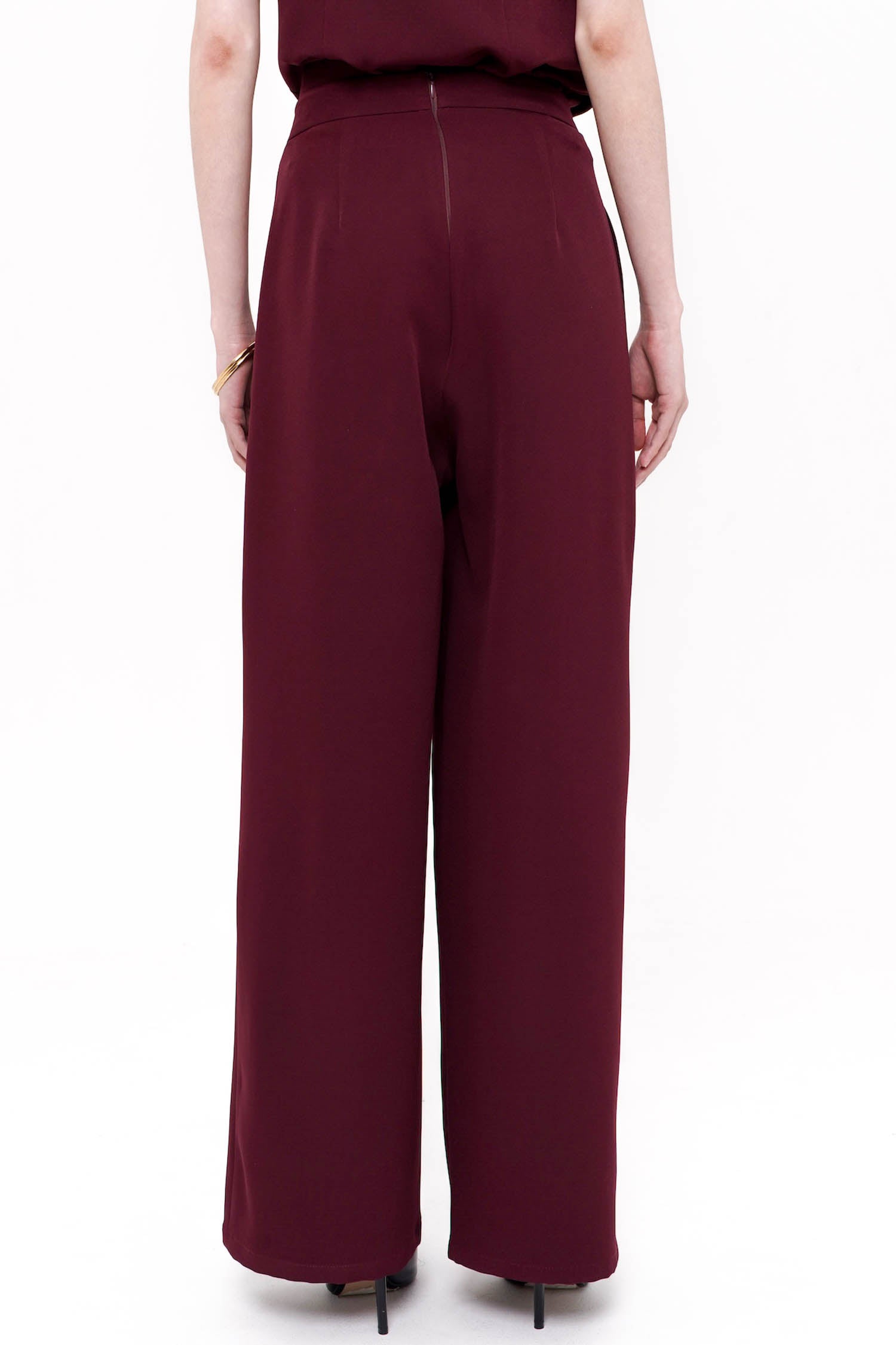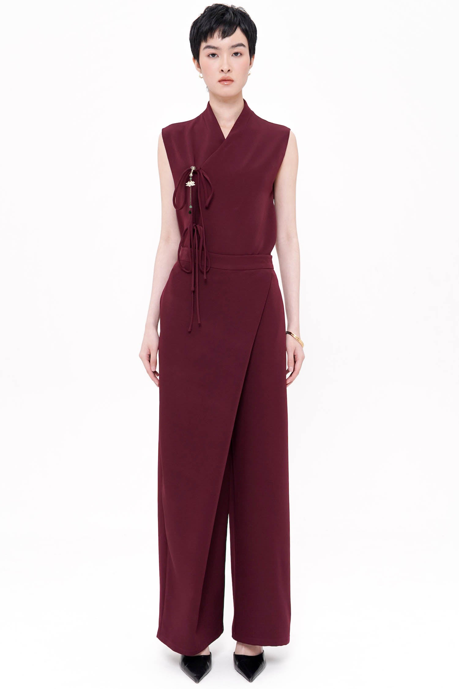 The Song Wrapped Trousers in Maroon embody modern tailoring with a refined sense of elegance, crafted from semi-wool fabric that offers a structured yet fluid drape. Designed with a distinctive wrap-front detail, these trousers create the illusion of a skirt while maintaining the ease and confidence of wide-leg pants. The high-waisted silhouette elongates the line of the body, complemented by clean seams, discreet pockets, and a polished back finish that ensures a sleek profile from every angle. Finished in a rich maroon hue, this sophisticated piece transitions seamlessly from refined daytime styling to elevated evening wear, making it a timeless addition to a curated wardrobe.