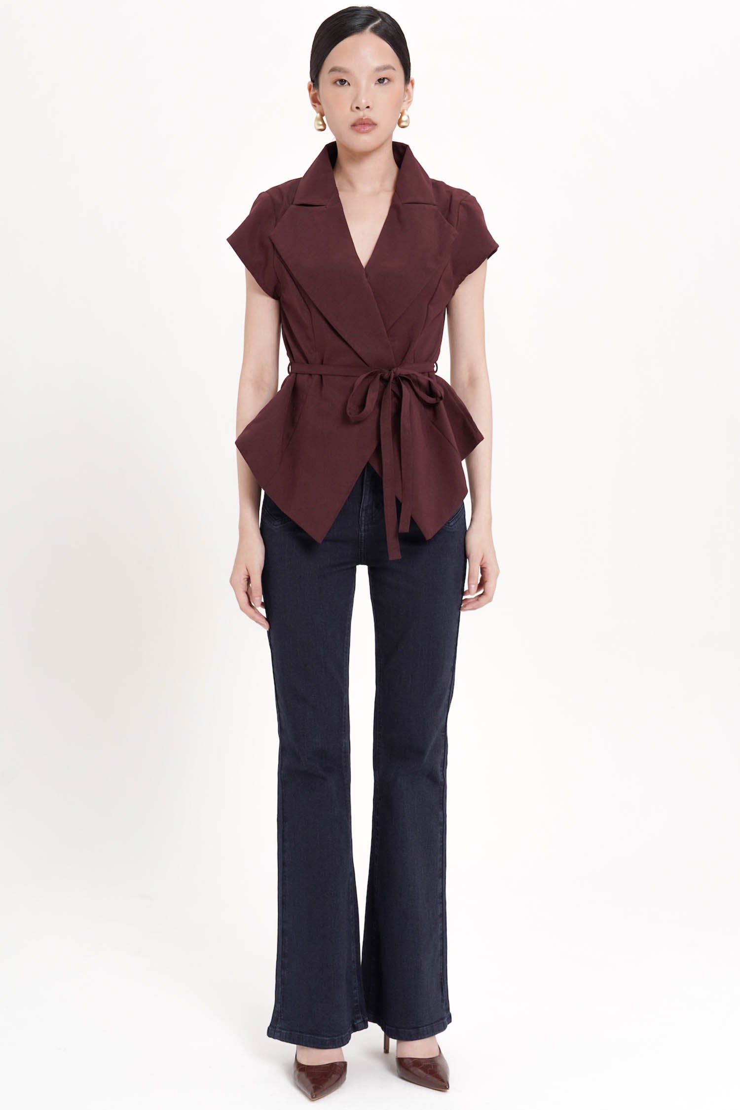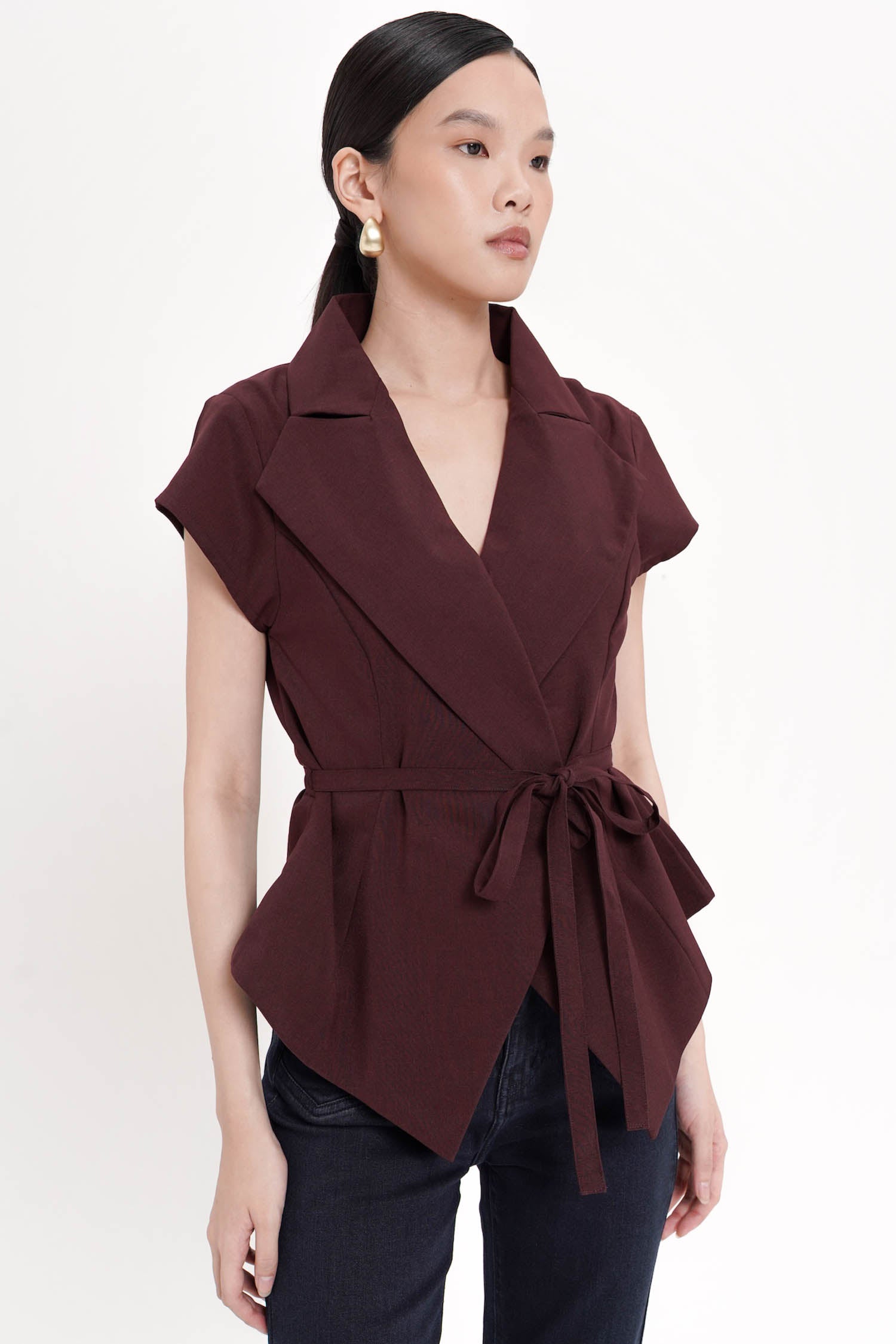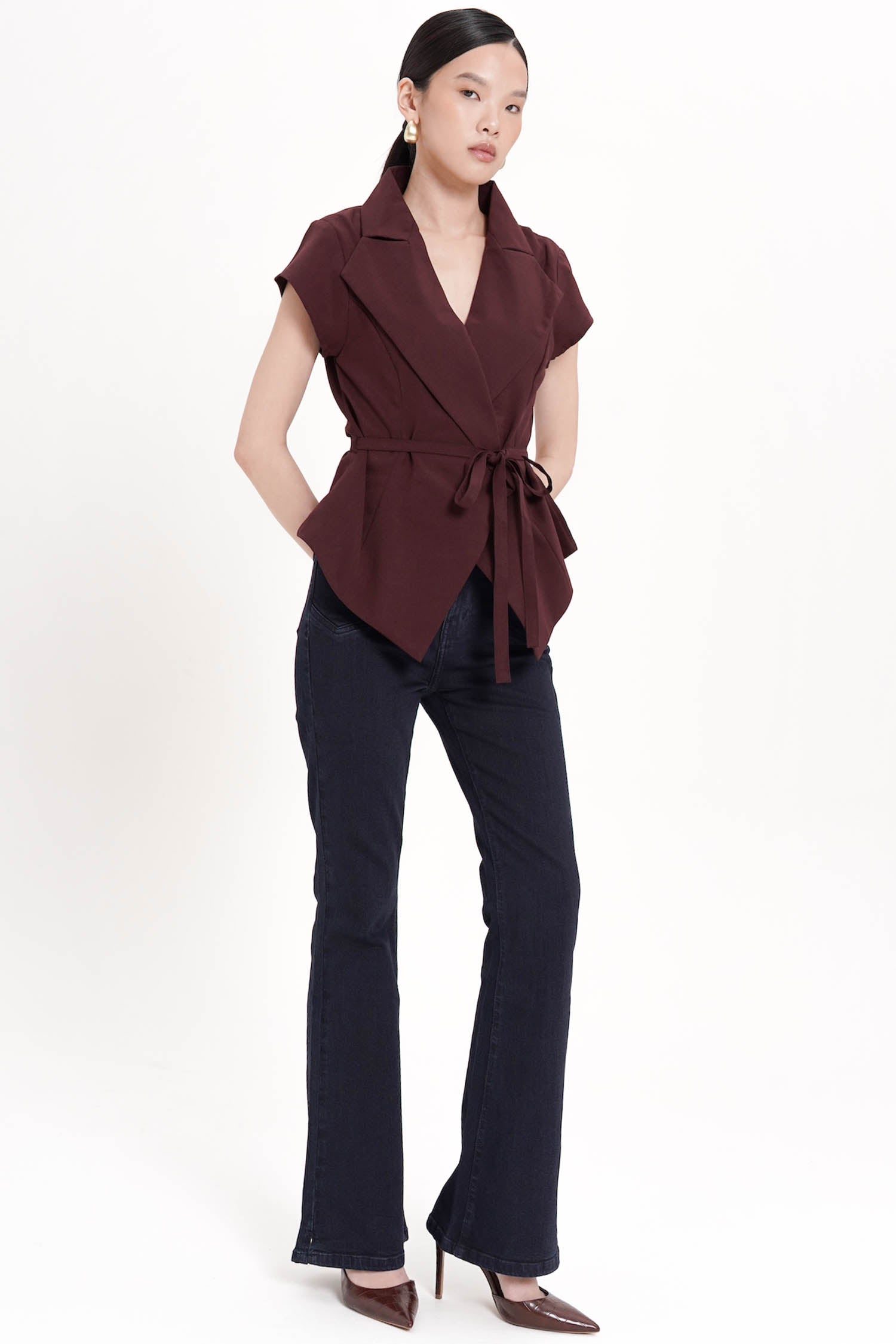 The Teegan Wrap Top redefines modern tailoring with its sharp lapel collar and sculpted wrap silhouet...