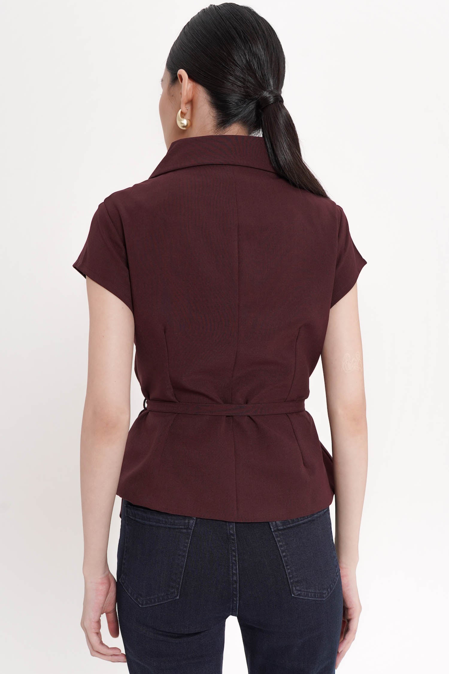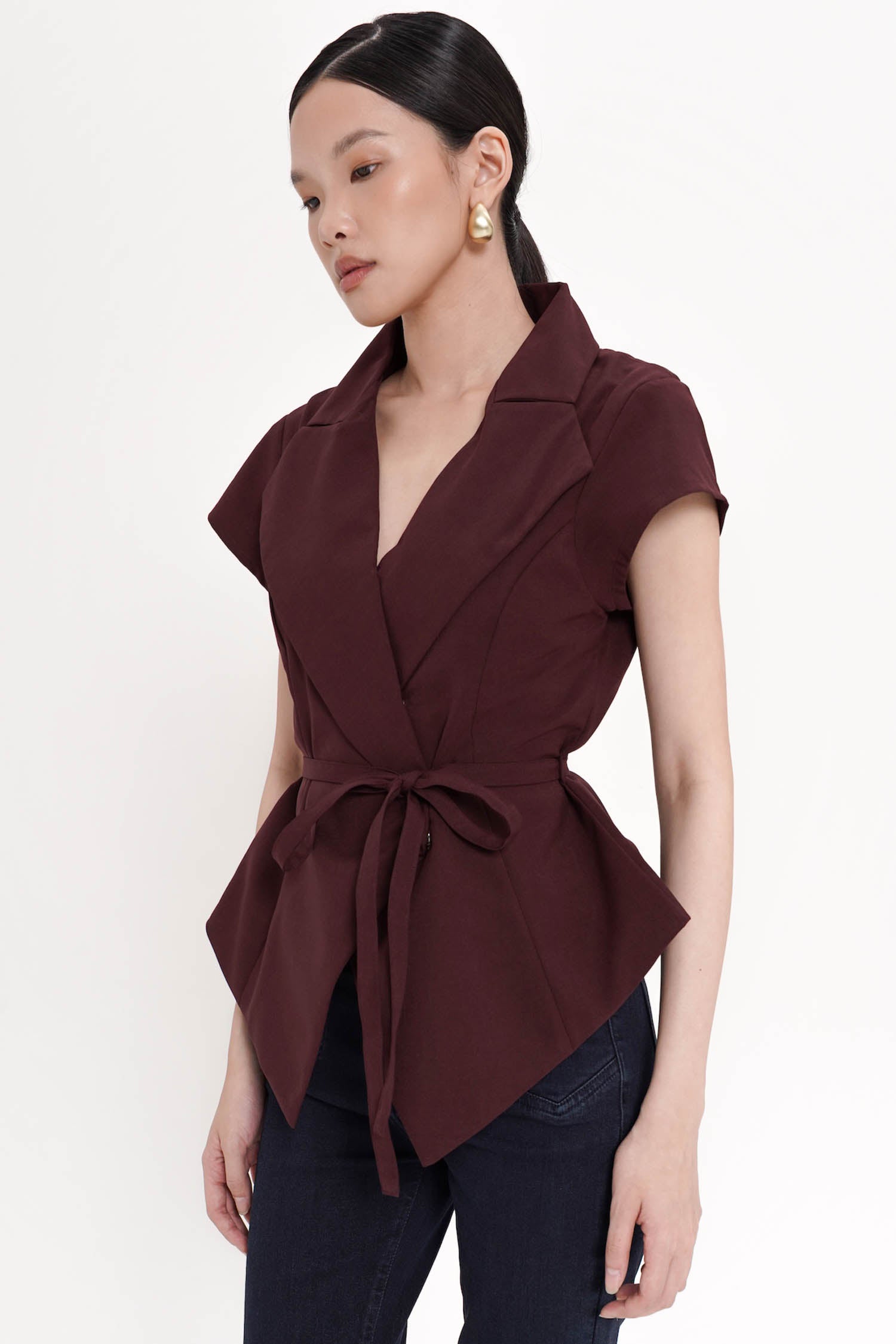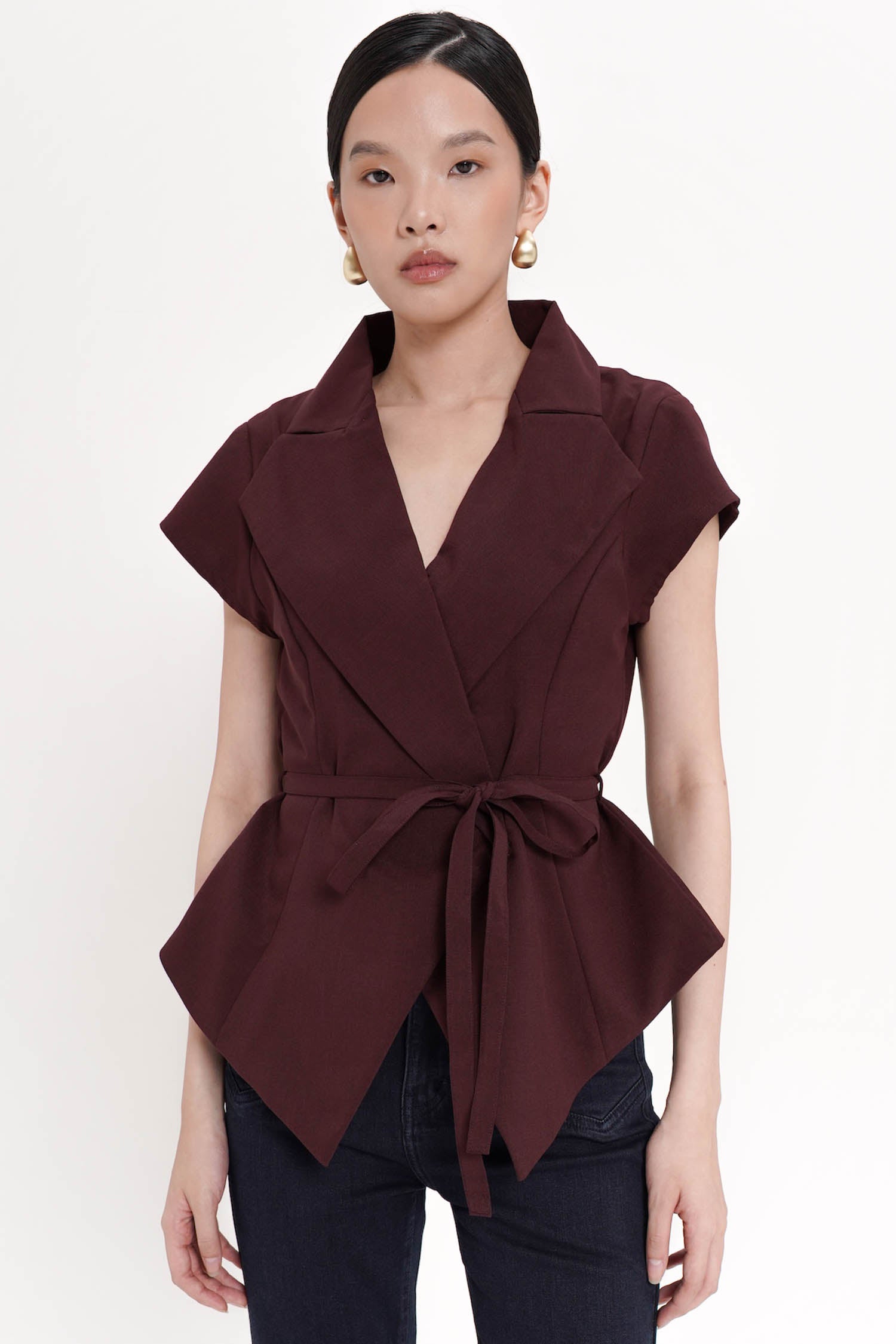 The Teegan Wrap Top redefines modern tailoring with its sharp lapel collar and sculpted wrap silhouet...