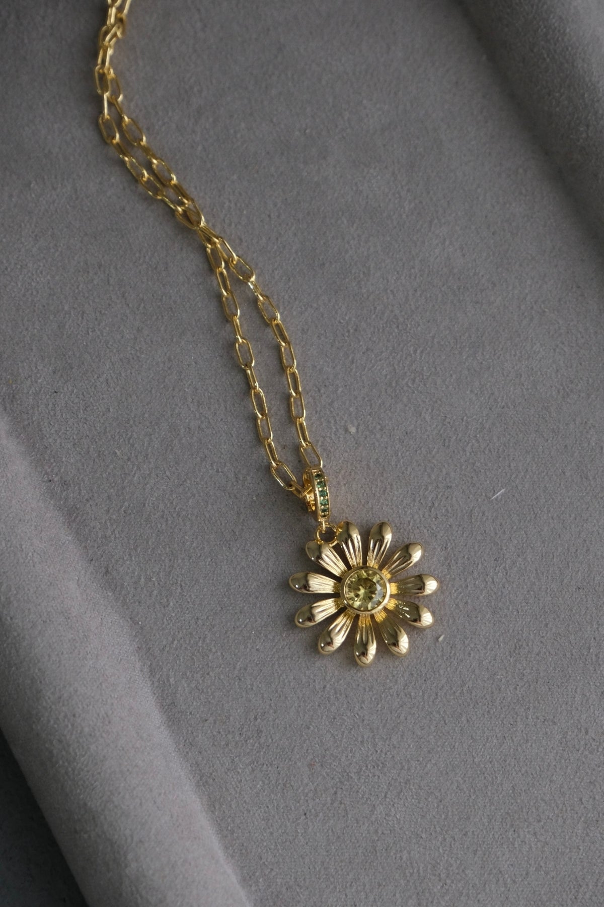 This necklace features a delicate gold-toned chain with elongated links, paired with a daisy-shaped pendant. The pendant showcases polished gold petals surrounding a central yellow gem that adds a soft sparkle. The pendant loop is accented with small green stones, providing a subtle touch of color contrast. The overall design exudes a fresh, elegant, and feminine charm — perfect for adding a cheerful, refined accent to any outfit.