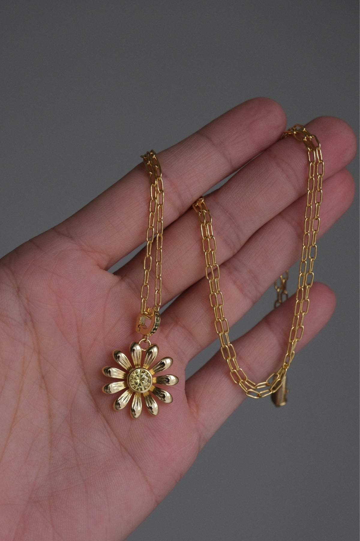 Made from brass with 16k gold plating with daisy pendant and yellow crystal at the center.