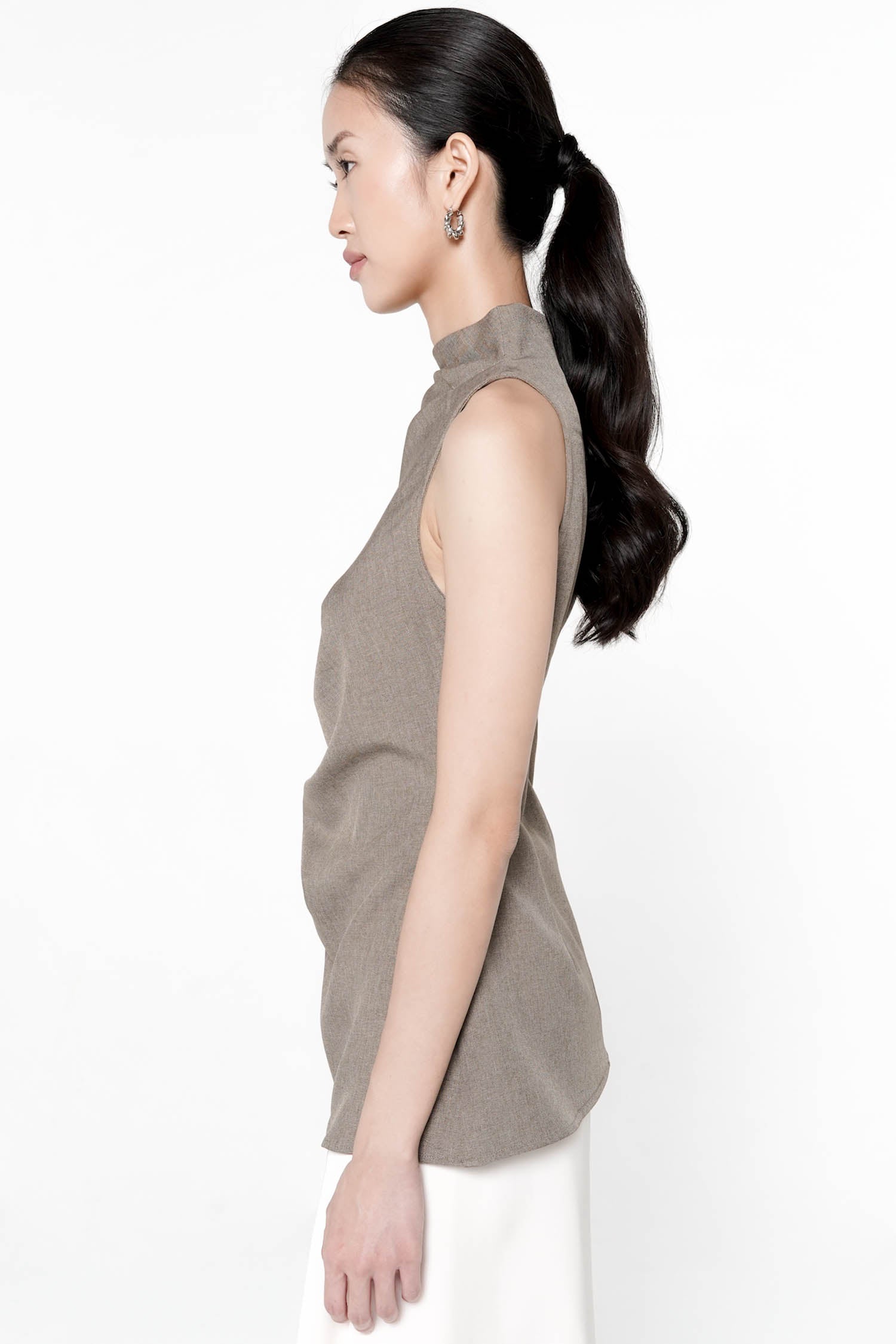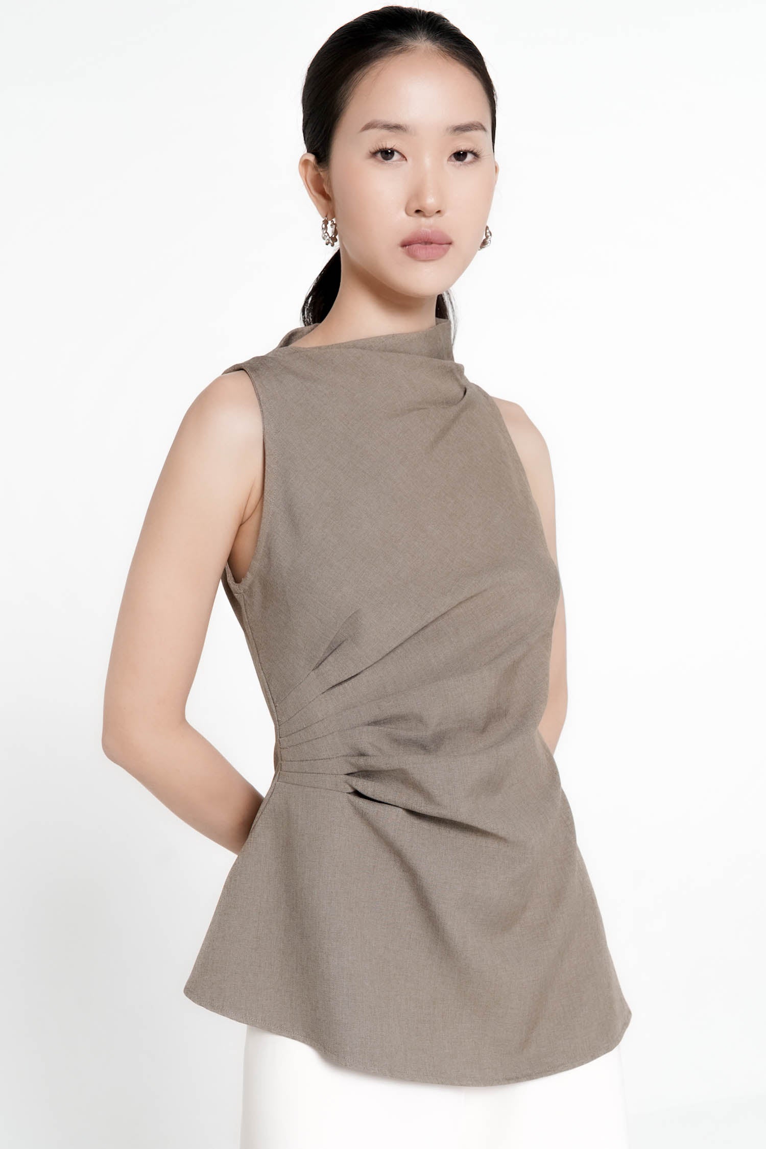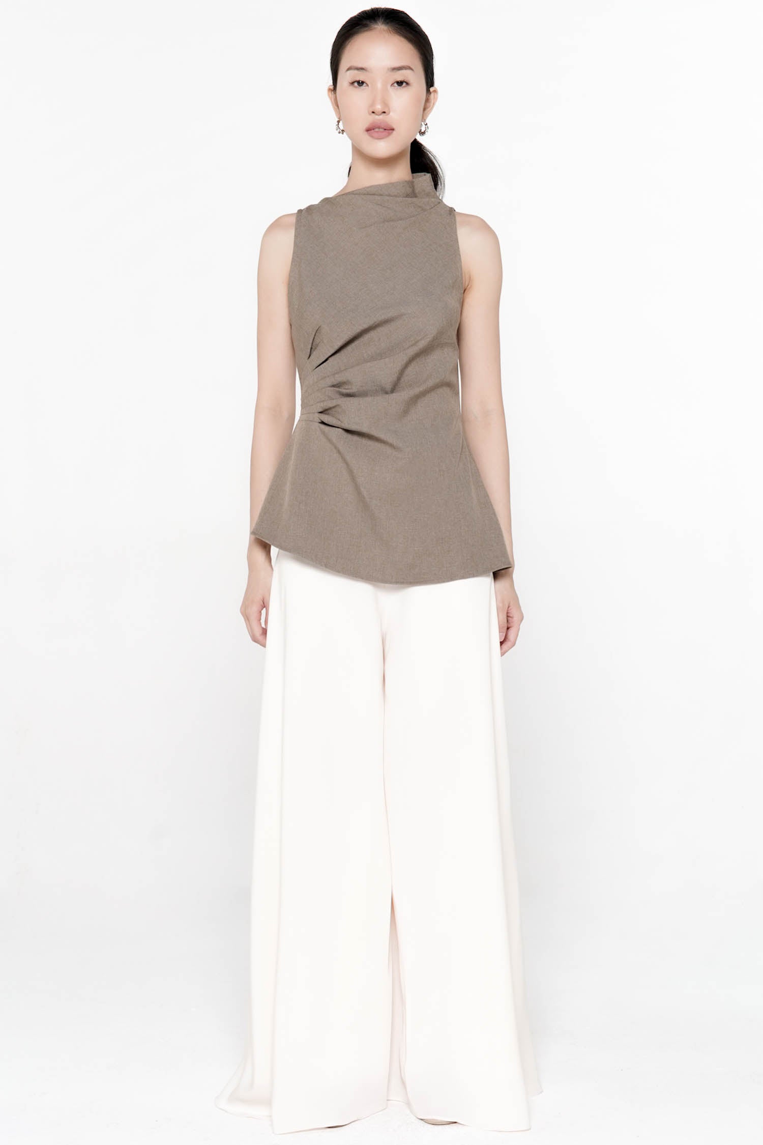 A seamless fusion of modernity and grace, the Vailla Cinched Top captivates with its sculptural draping and asymmetrical hem. Designed in luxurious semi-wool fabric, it features artful side ruching that accentuates the waist, creating a flattering, form-enhancing effect. Available in Grey and Ash Brown, this timeless piece adds an air of understated sophistication to any ensemble.