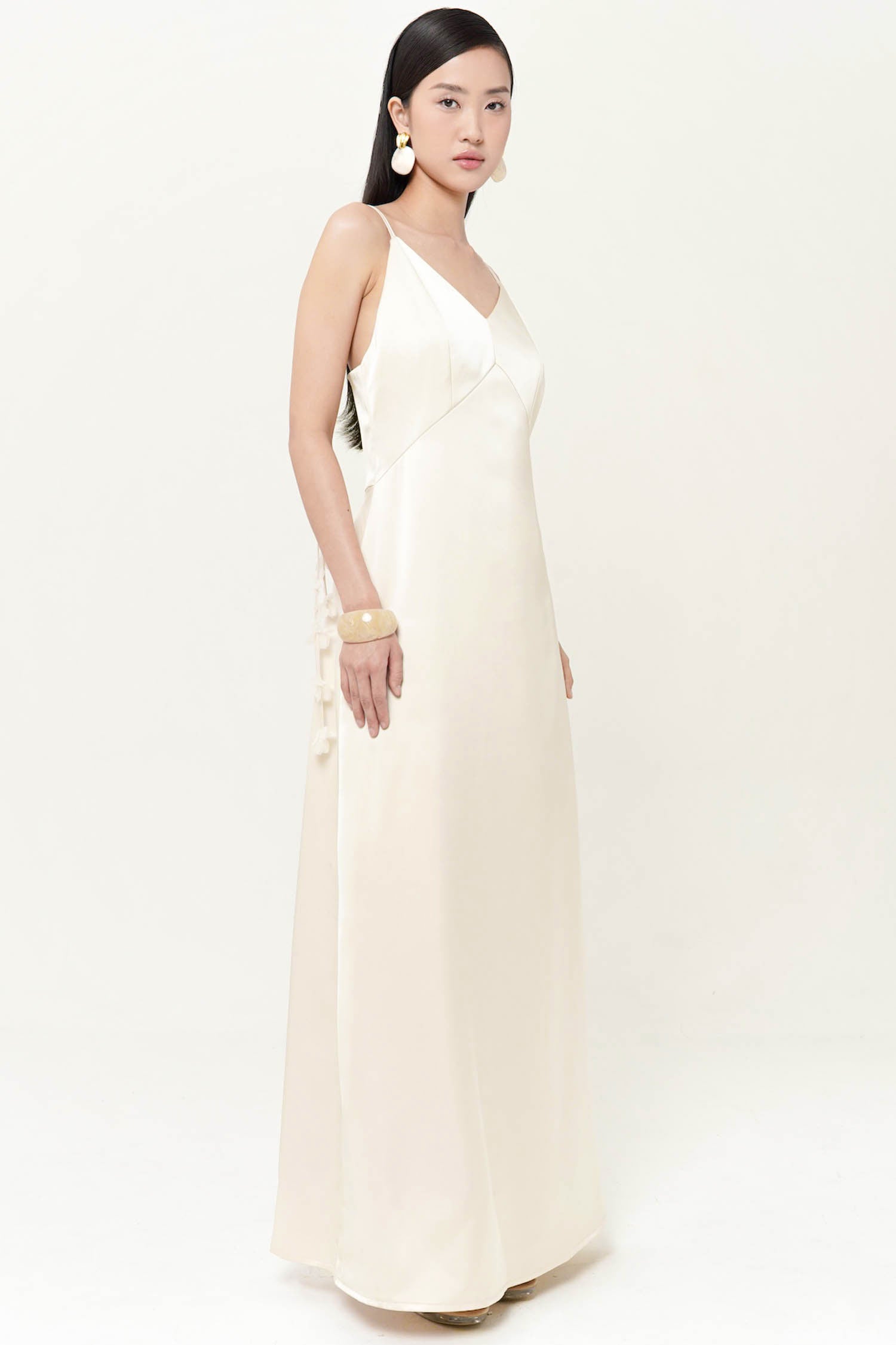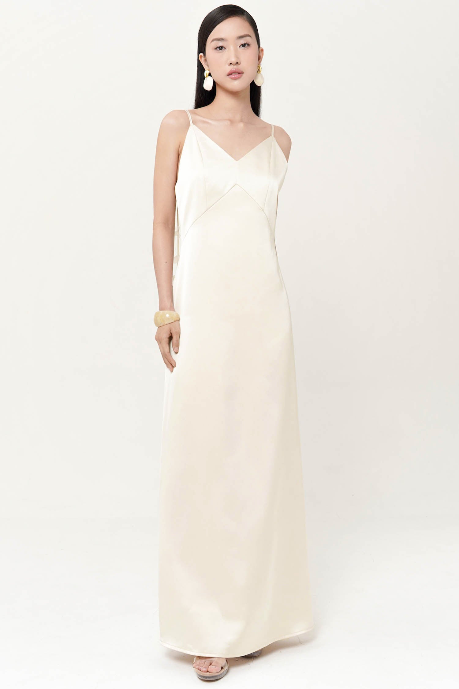 The Vale Dress is a satin slip style with a V-neckline, slim adjustable straps and a fluid floor-length silhouette—modern, timeless, and effortlessly elegant.