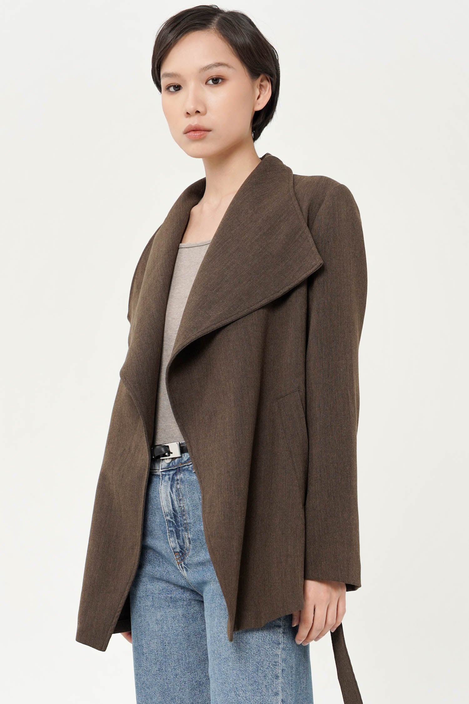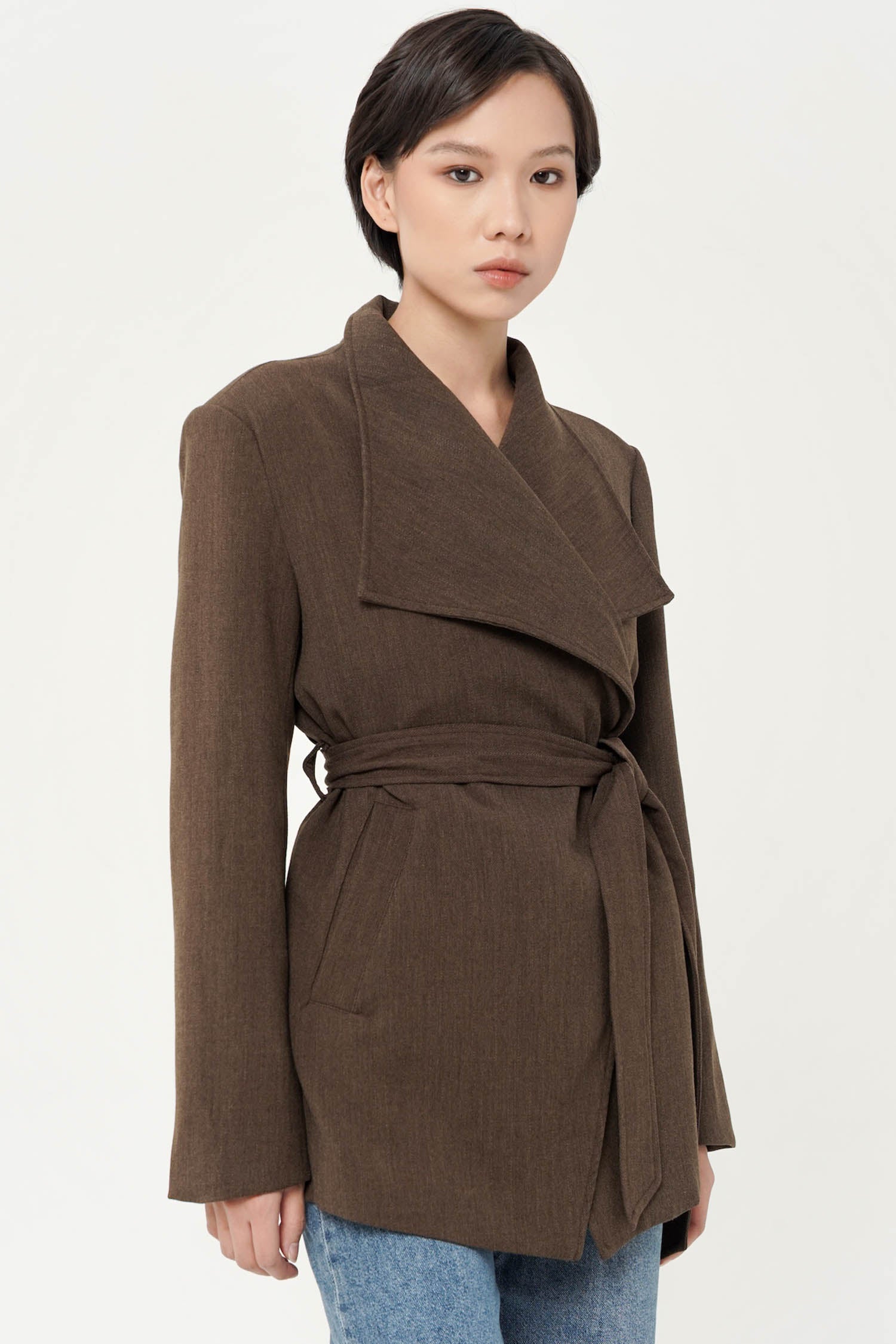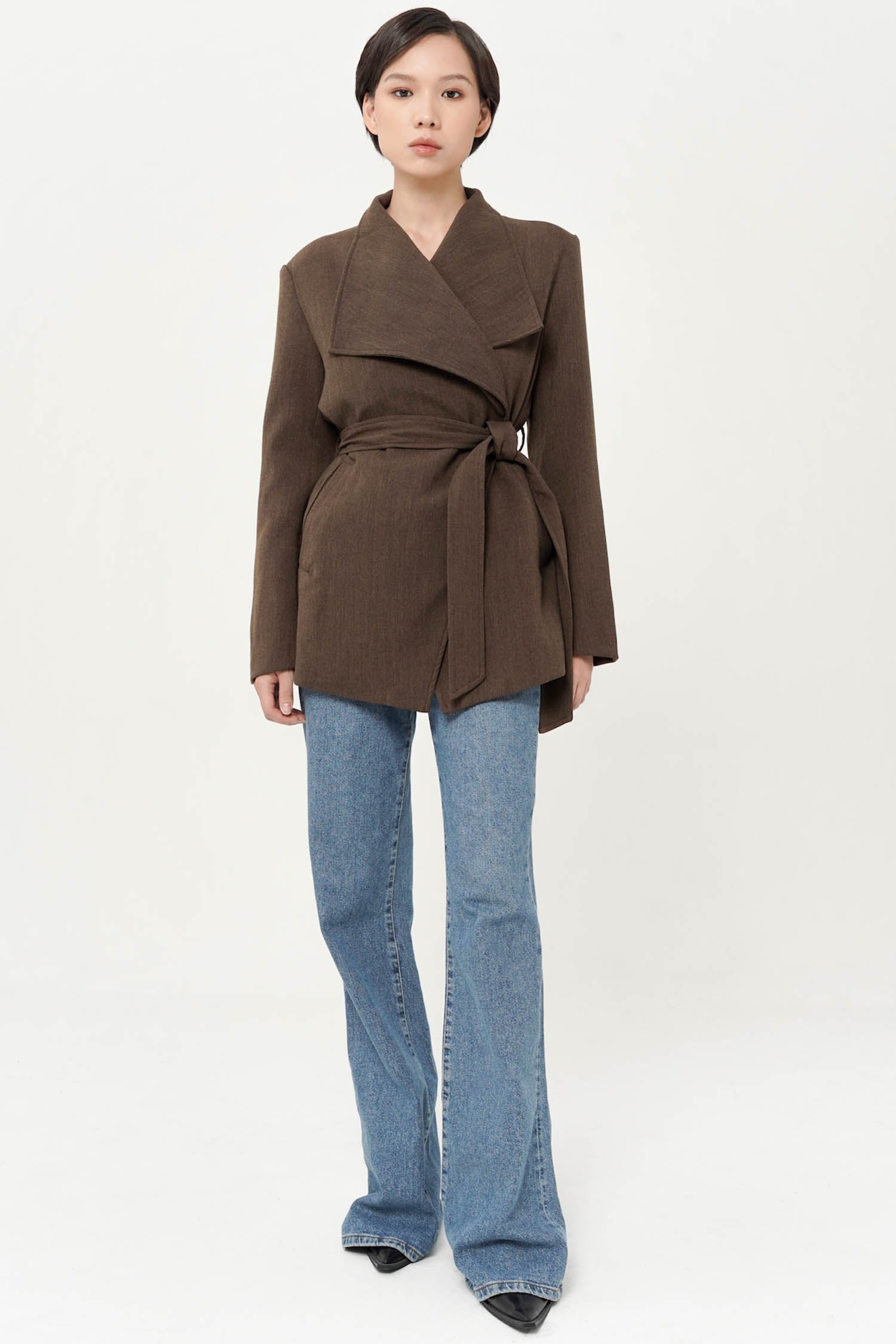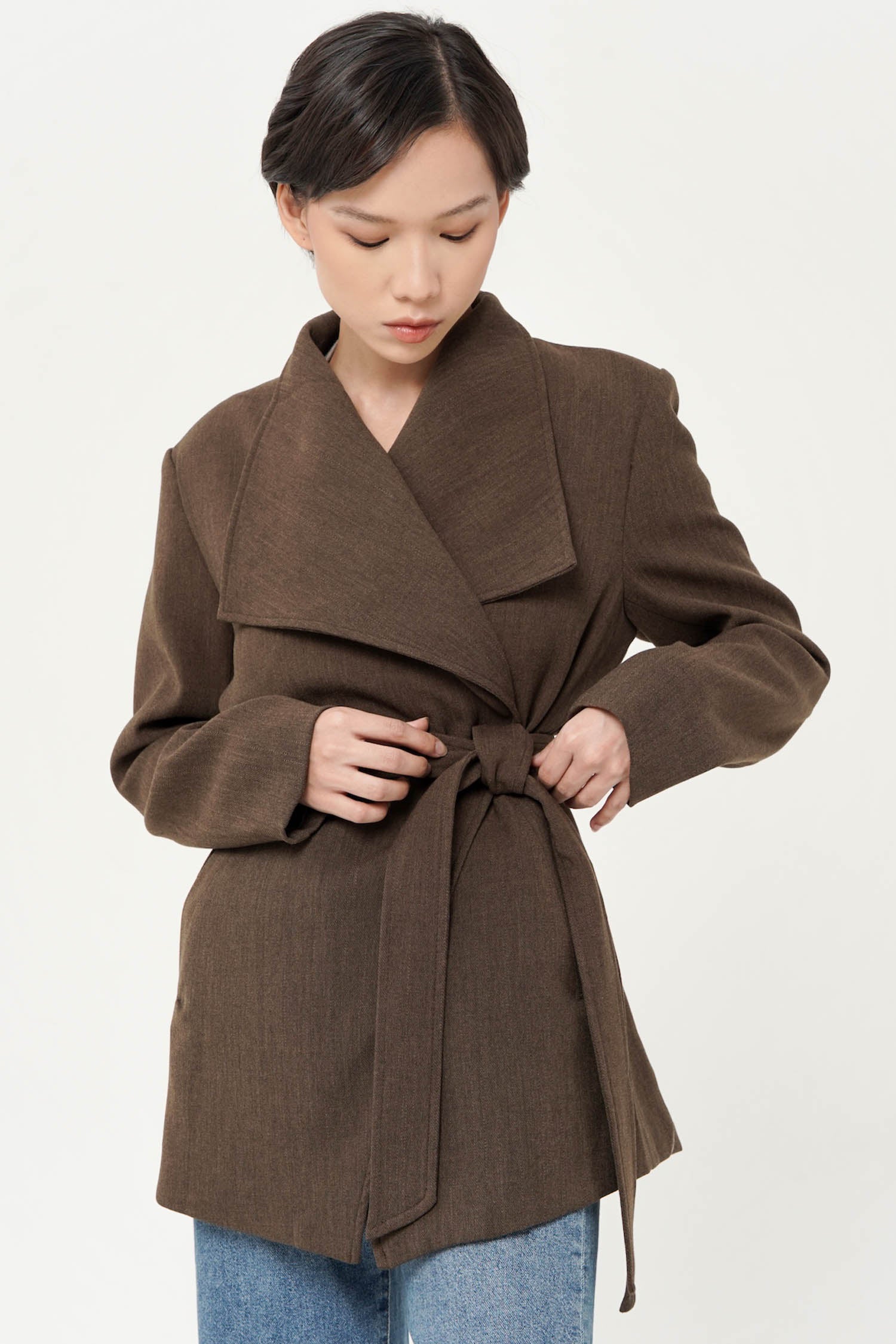 VERONA WRAP BELTED COAT The Verona Wrap Belted Coat is a timeless expression of effortless sophistication, tailored from a refined polyester blend that ensures both structure and comfort. Defined by its dramatic lapel and fluid drape, this coat is cinched at the waist with a self-tie belt, creating a flattering silhouette that exudes modern elegance. Its versatile design allows for multiple styling options, whether worn open for a relaxed, laid-back feel or fastened for a polished, tailored finish. In its rich earthy tone, the Verona coat offers an understated yet impactful statement, seamlessly elevating both casual and refined ensembles.