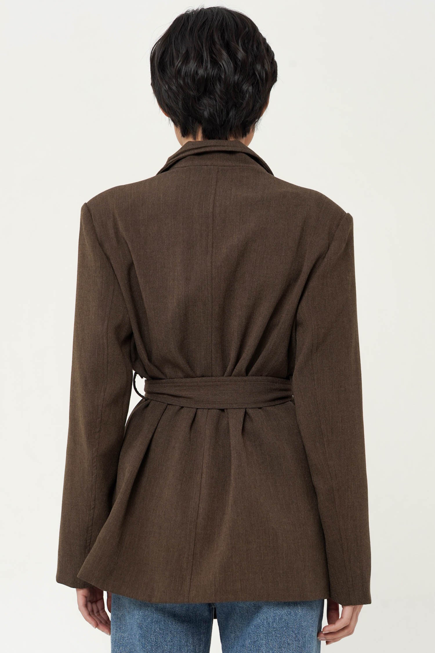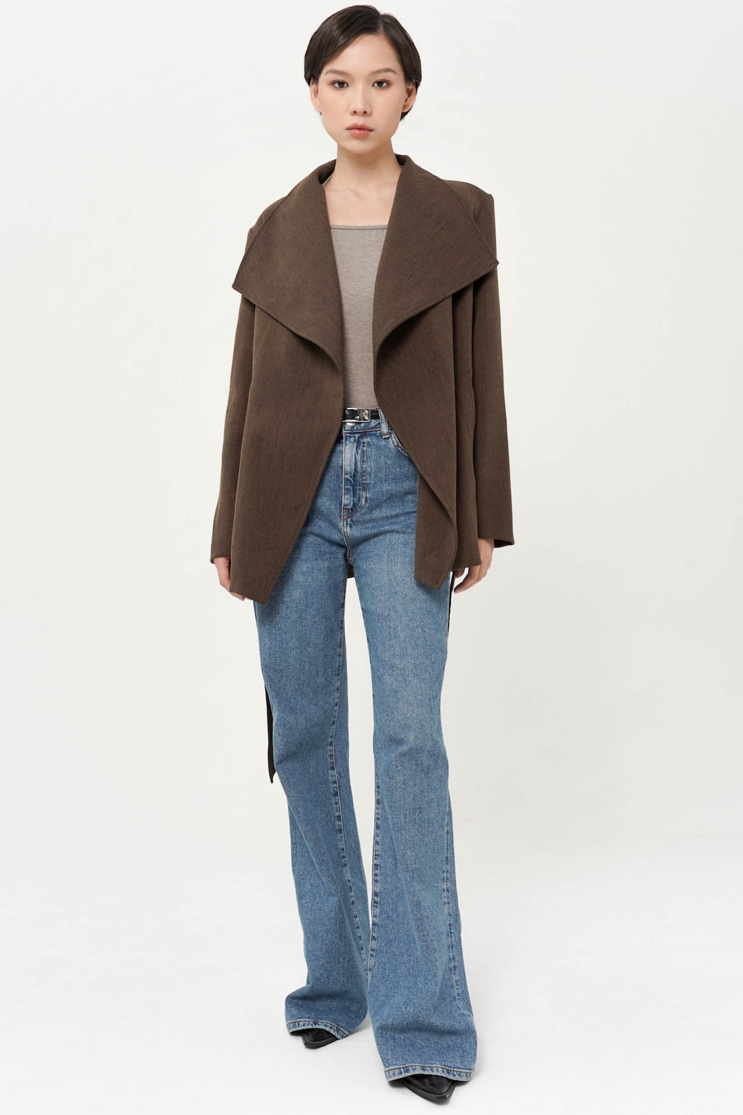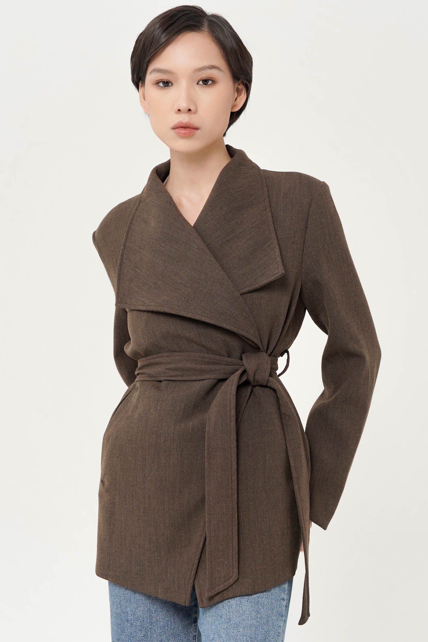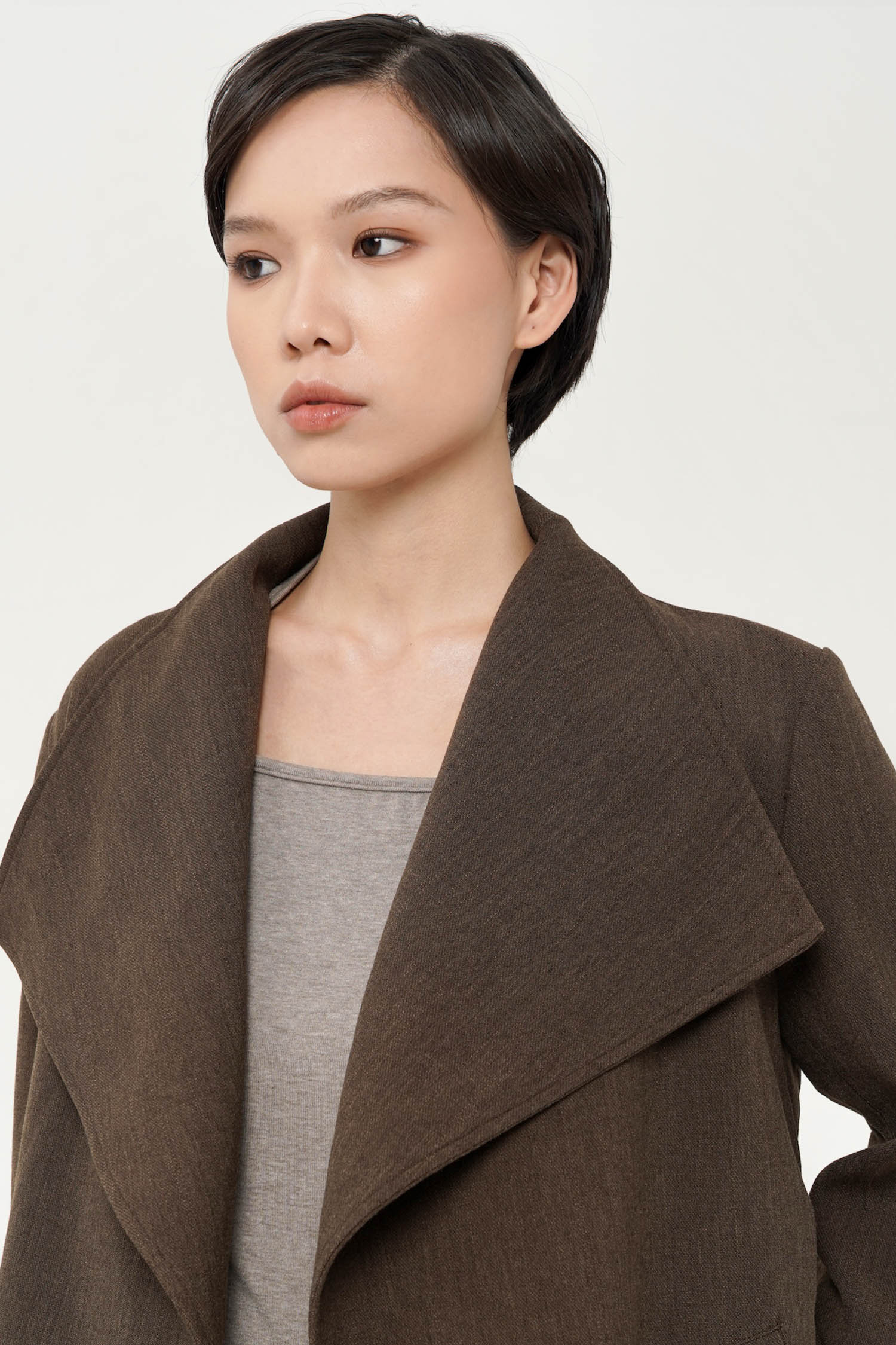 VERONA WRAP BELTED COAT The Verona Wrap Belted Coat is a timeless expression of effortless sophistication, tailored from a refined polyester blend that ensures both structure and comfort. Defined by its dramatic lapel and fluid drape, this coat is cinched at the waist with a self-tie belt, creating a flattering silhouette that exudes modern elegance. Its versatile design allows for multiple styling options, whether worn open for a relaxed, laid-back feel or fastened for a polished, tailored finish. In its rich earthy tone, the Verona coat offers an understated yet impactful statement, seamlessly elevating both casual and refined ensembles.