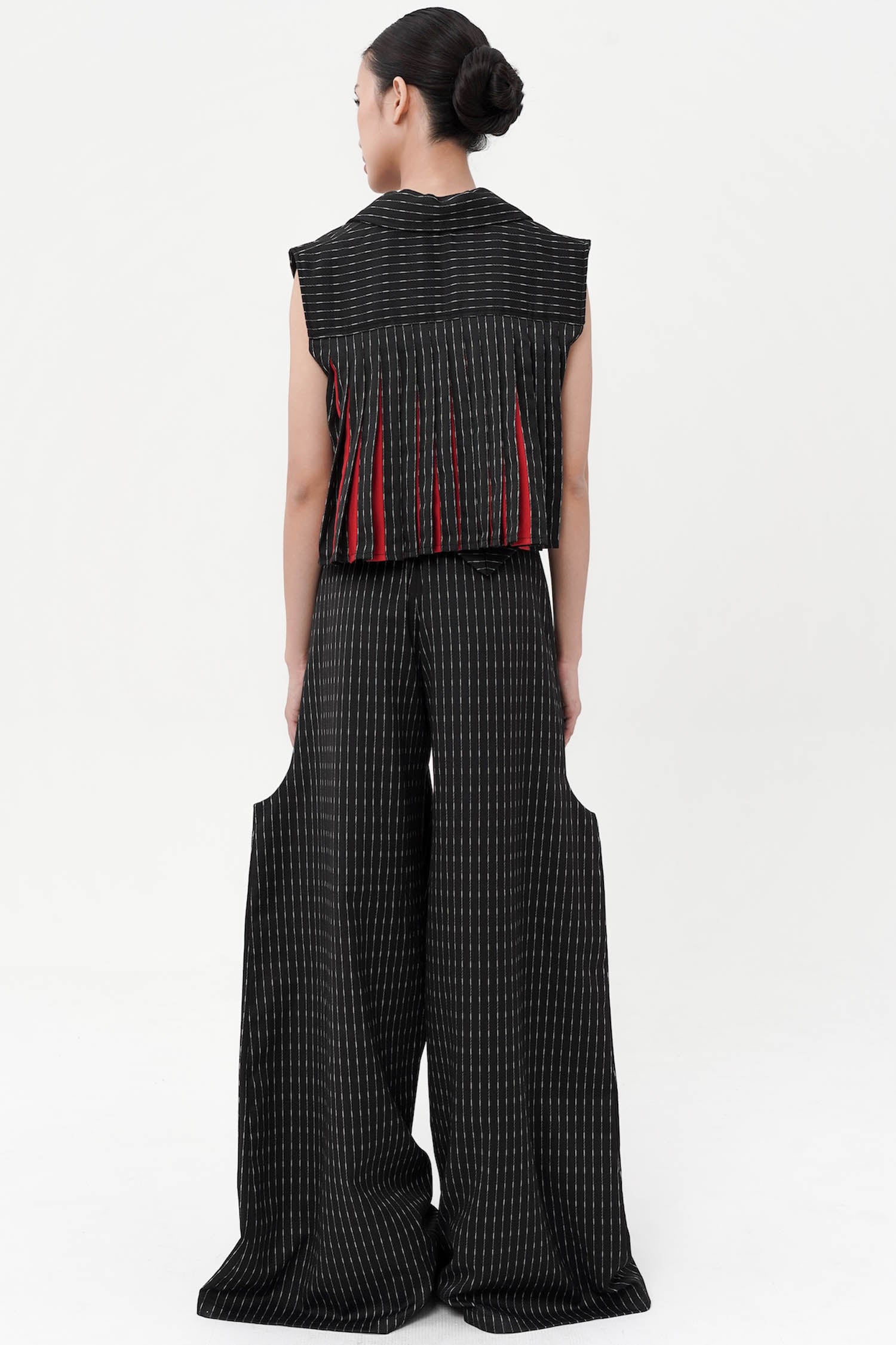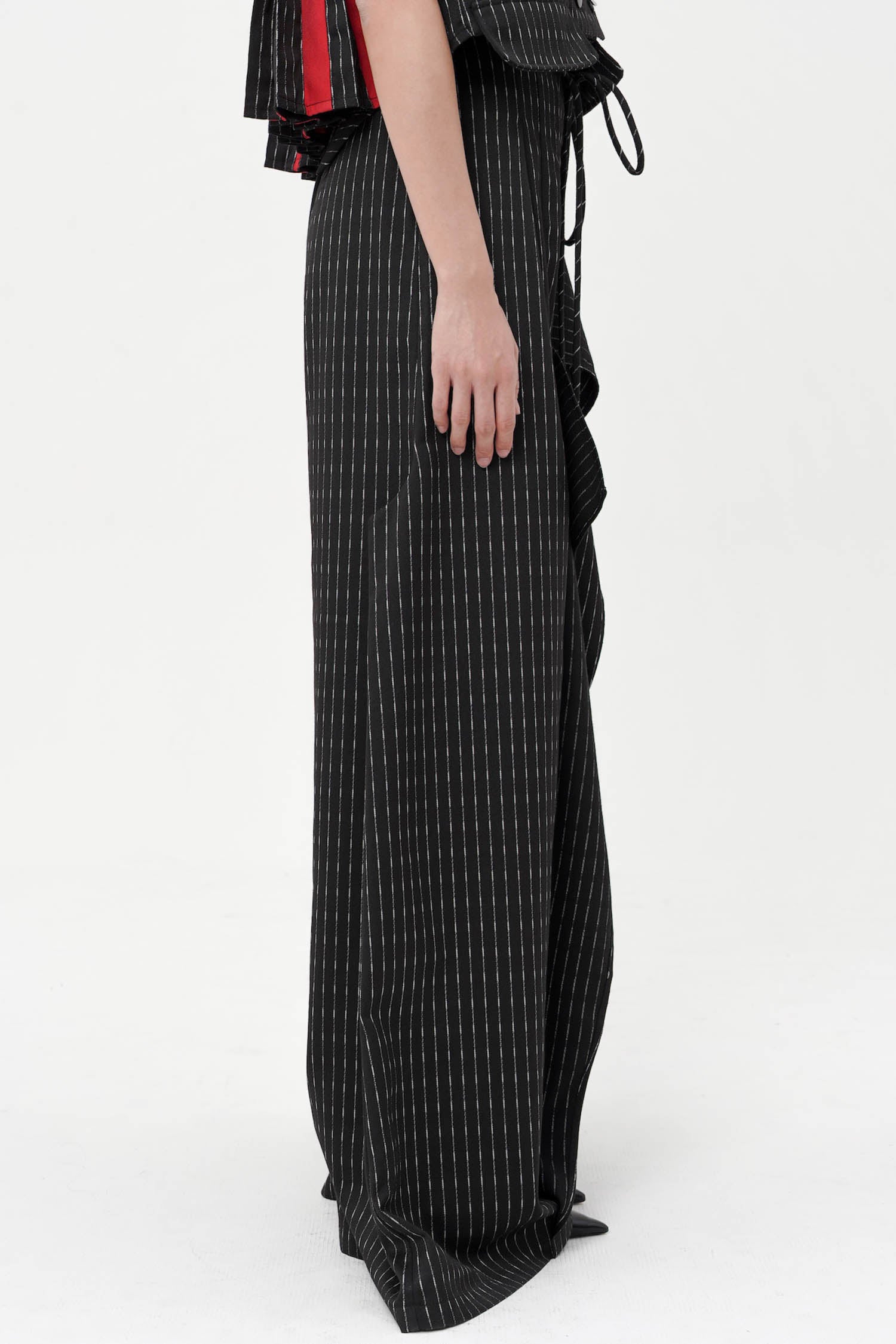 Designed with a high-waisted silhouette that flatters the figure while providing comfort, this pants have wide-leg cut that allows for graceful movement and complemented by drapery at the front. Completed with ties at the waist and back pocket.