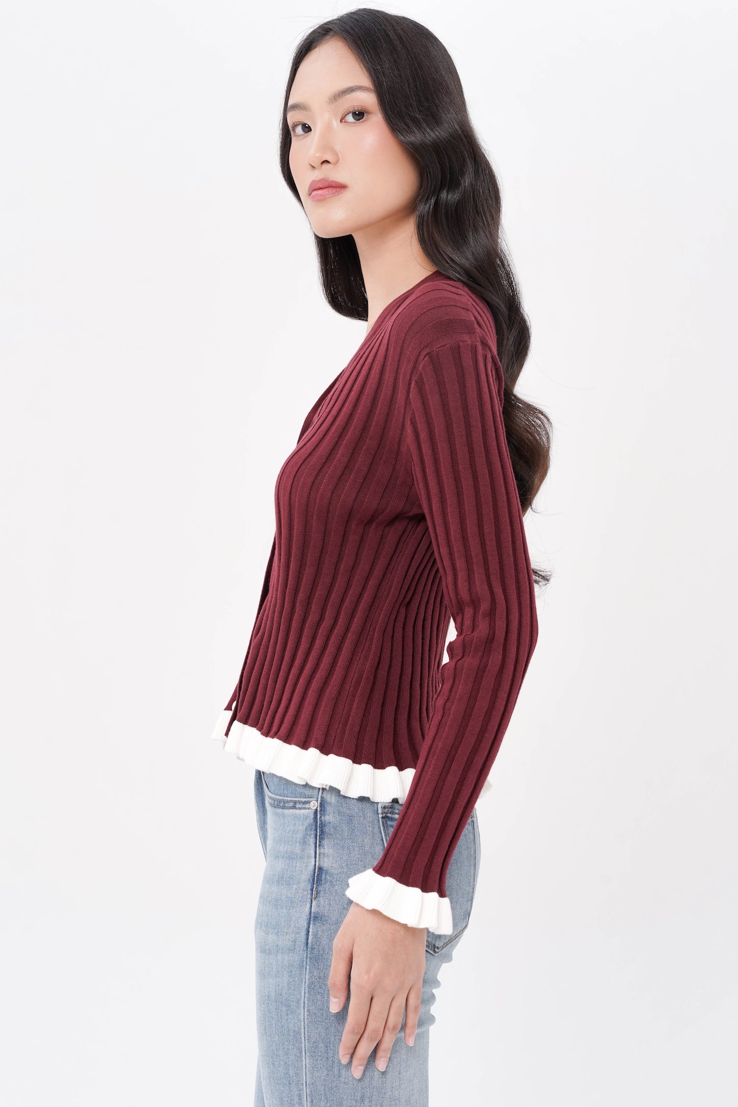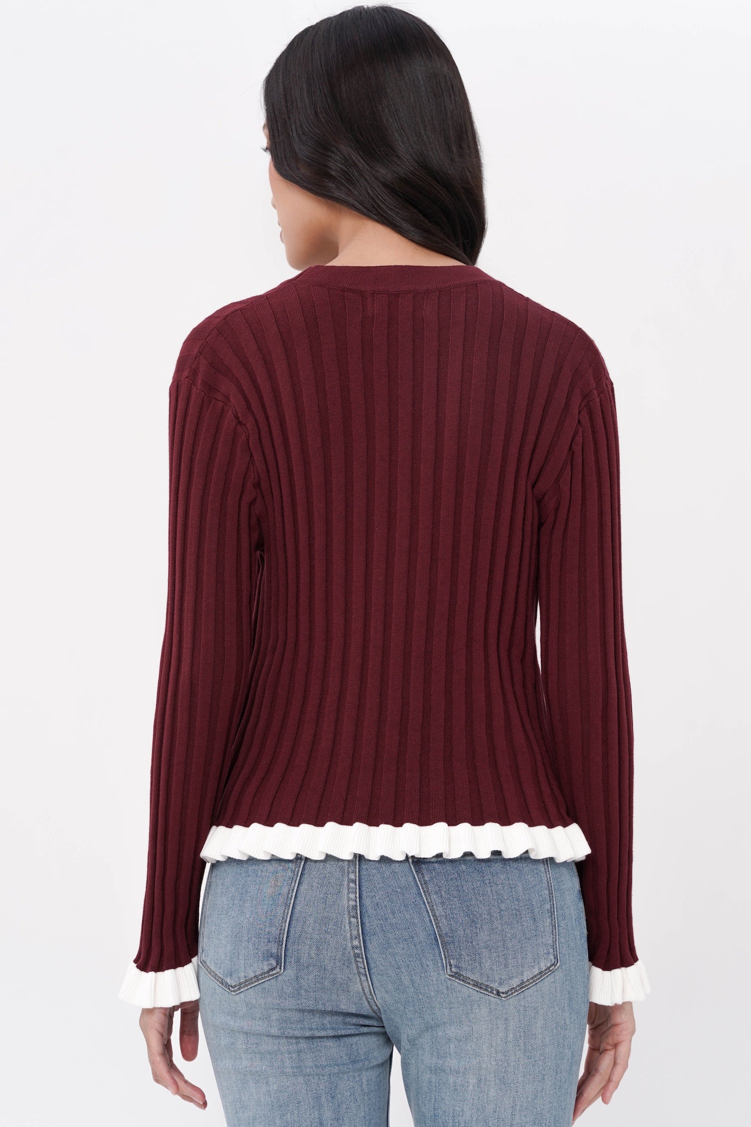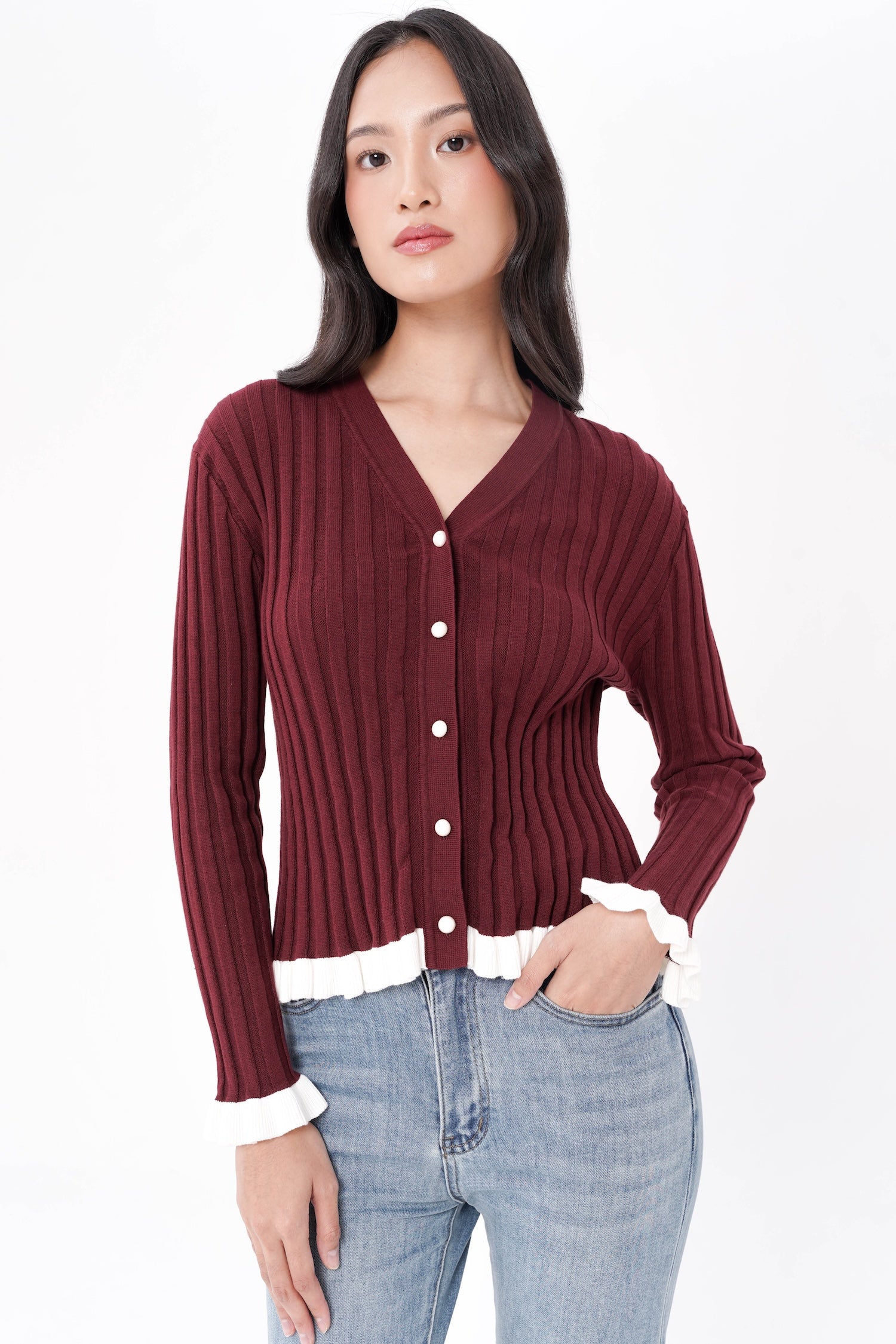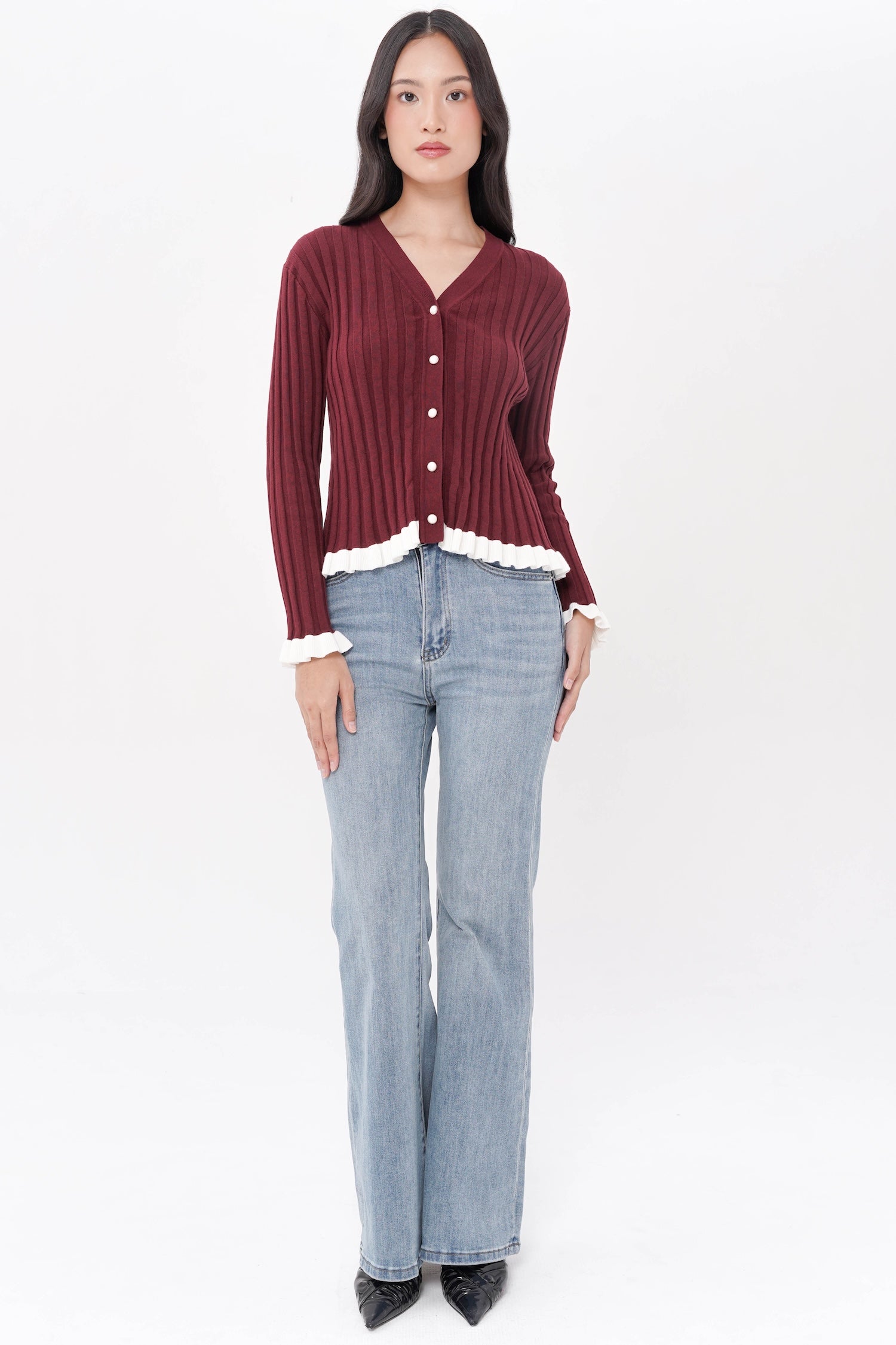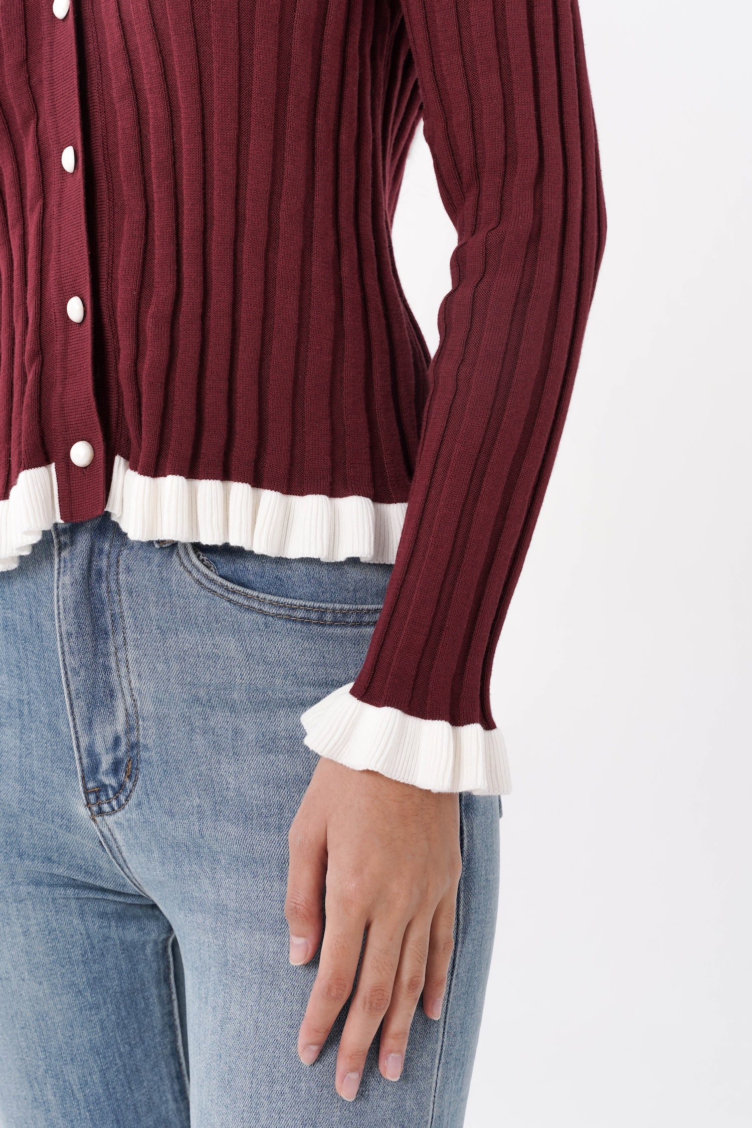 The Wilda Ruffle Cardigan combines timeless charm with modern femininity, designed in breathable cotton knit with a streamlined fit that highlights its graceful ruffled hem and cuffs. Finished with pearl-like buttons for a sophisticated touch, this piece brings subtle movement and elegance to any ensemble. Available in Navy, Maroon, and Dusty Pink.