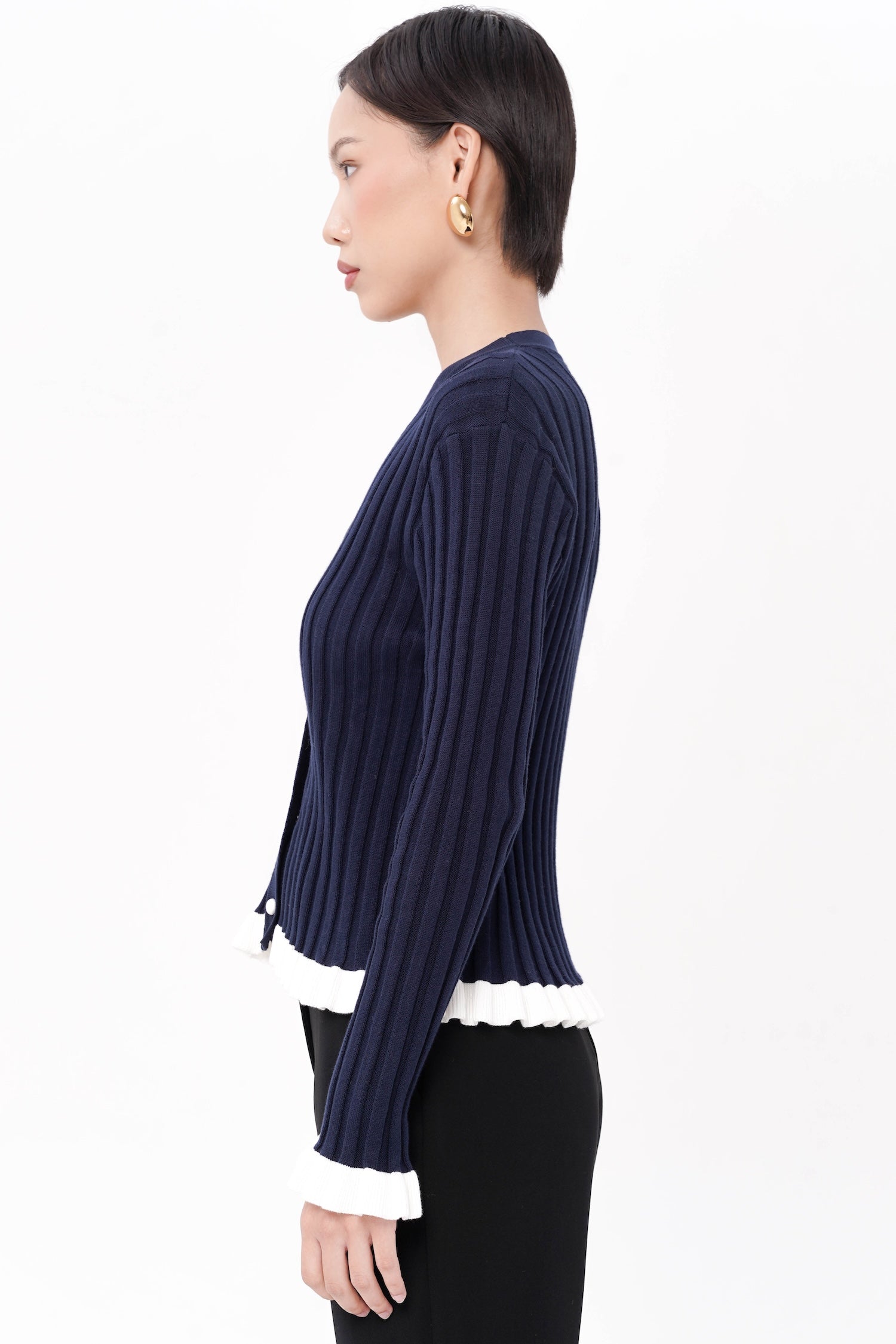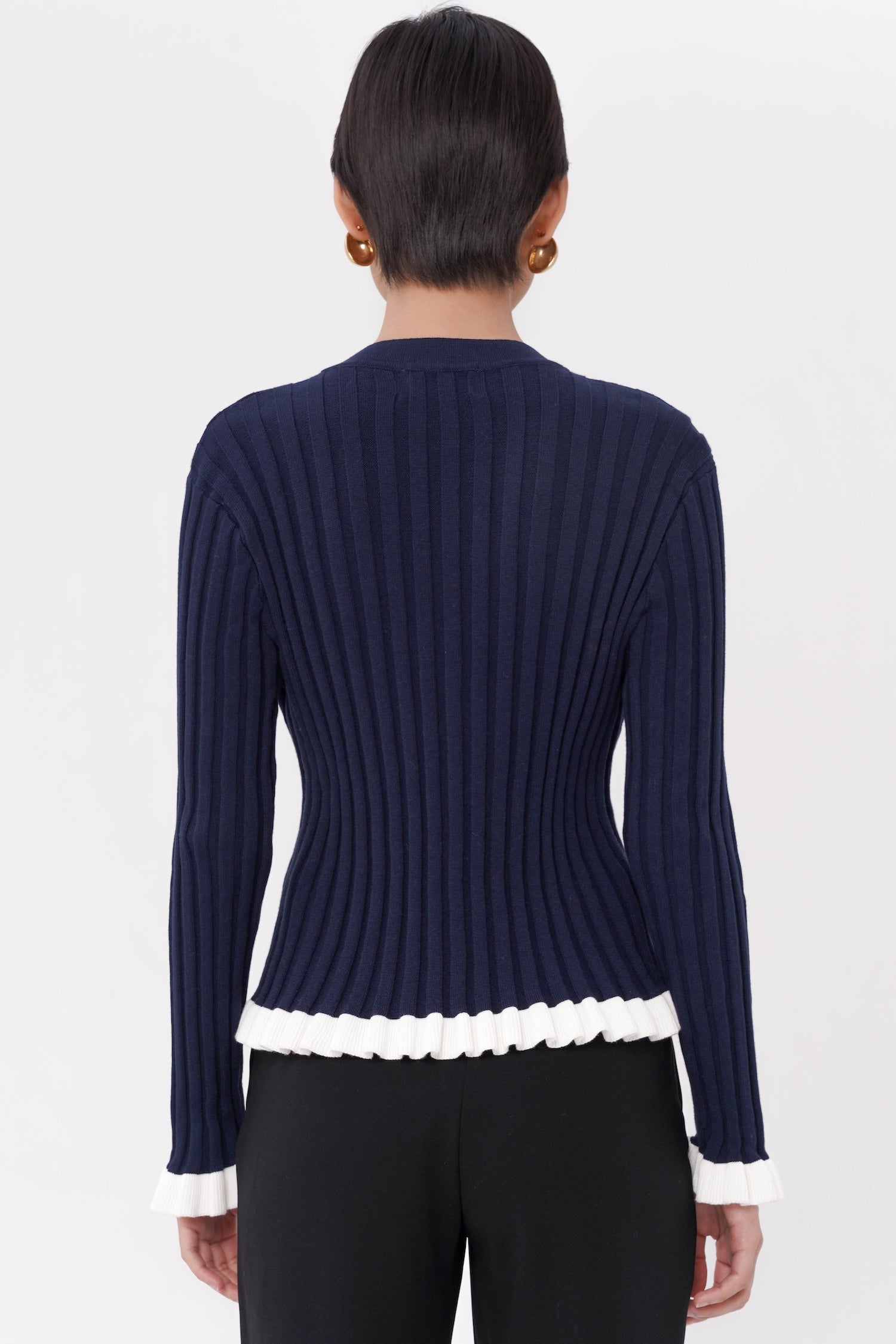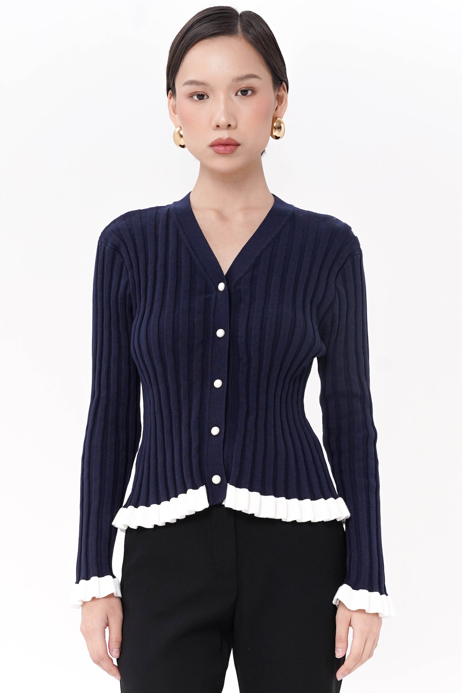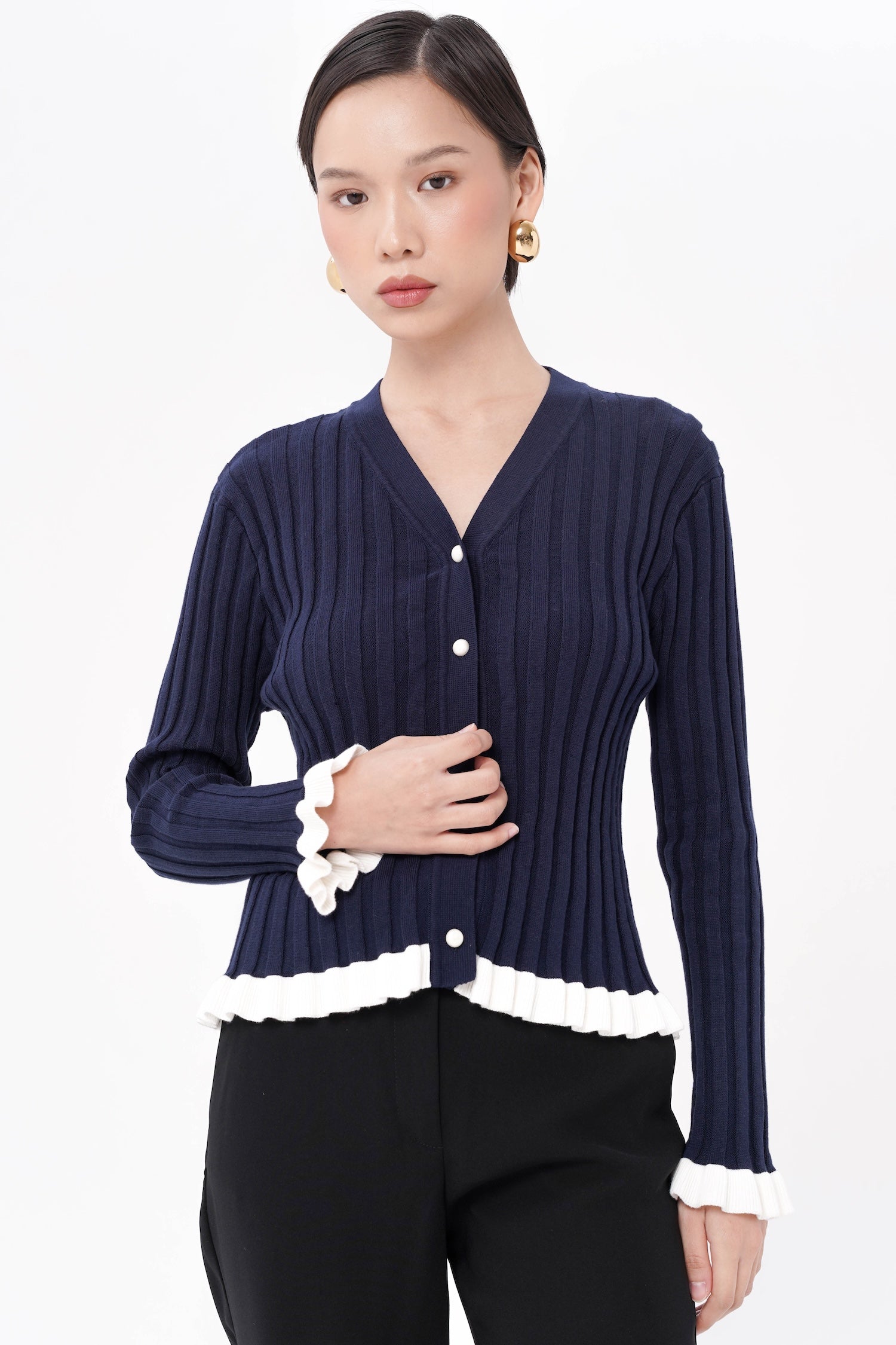 The Wilda Ruffle Cardigan combines timeless charm with modern femininity, designed in breathable cotton knit with a streamlined fit that highlights its graceful ruffled hem and cuffs. Finished with pearl-like buttons for a sophisticated touch, this piece brings subtle movement and elegance to any ensemble. Available in Navy, Maroon, and Dusty Pink.
