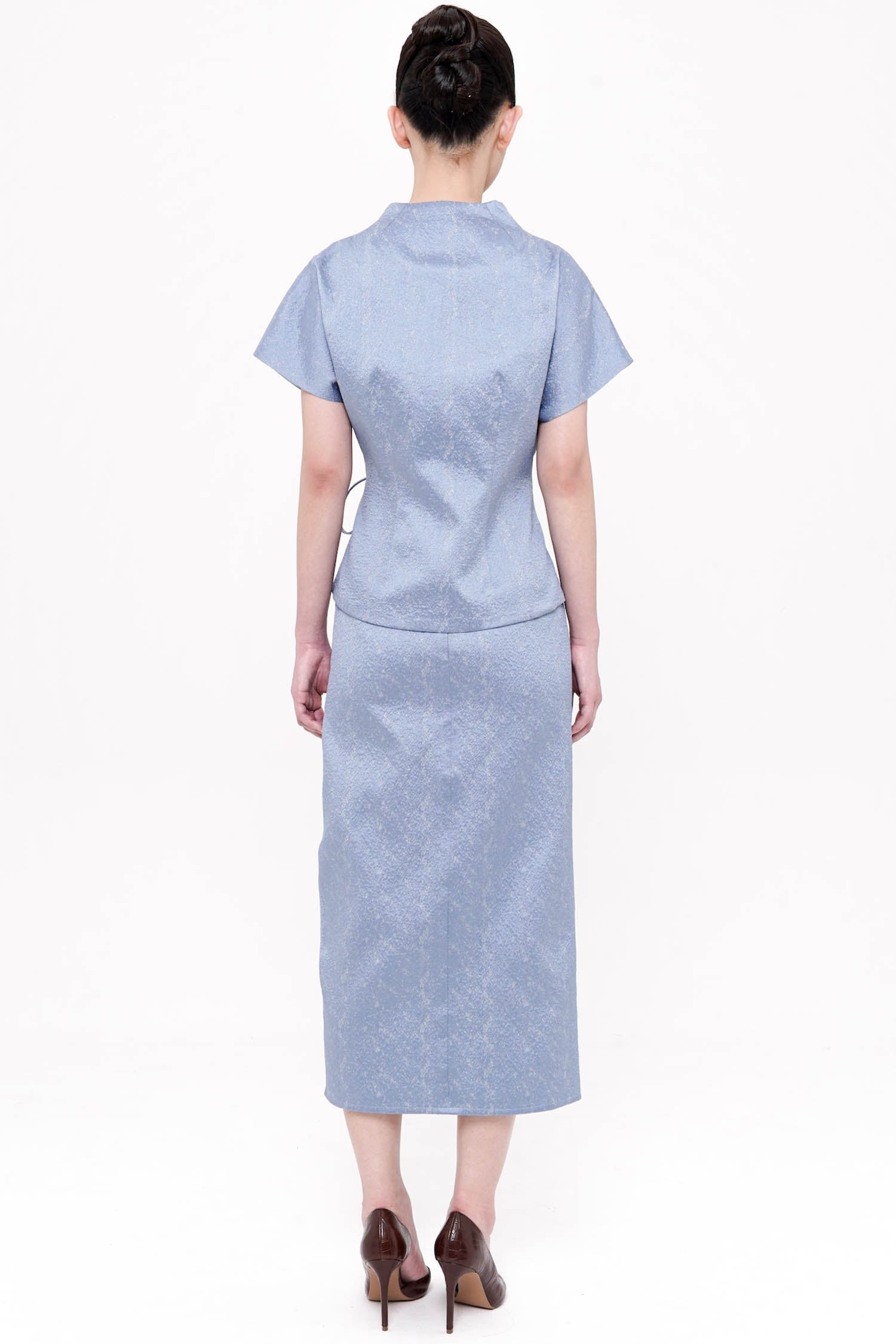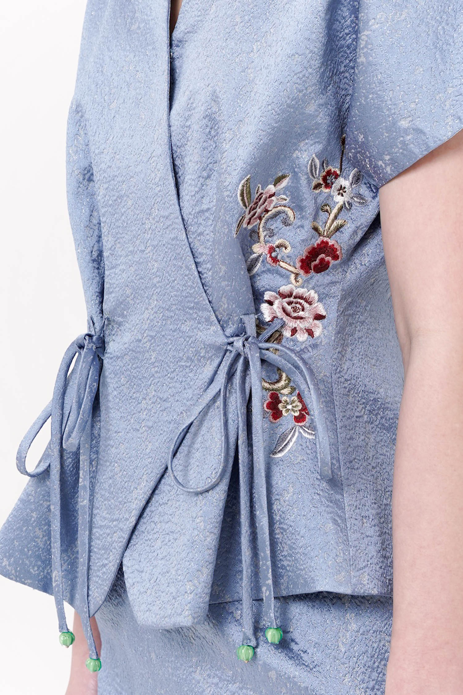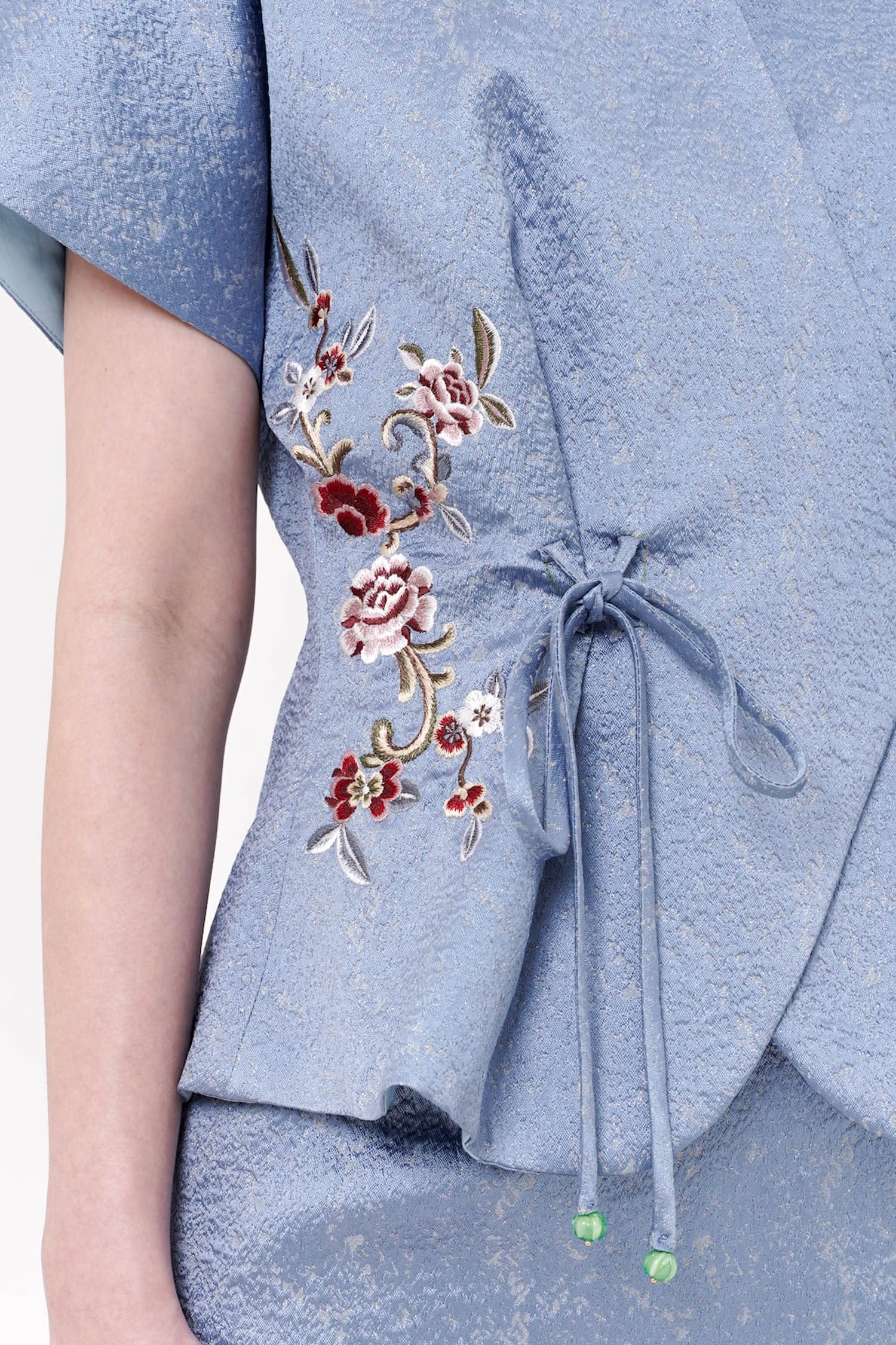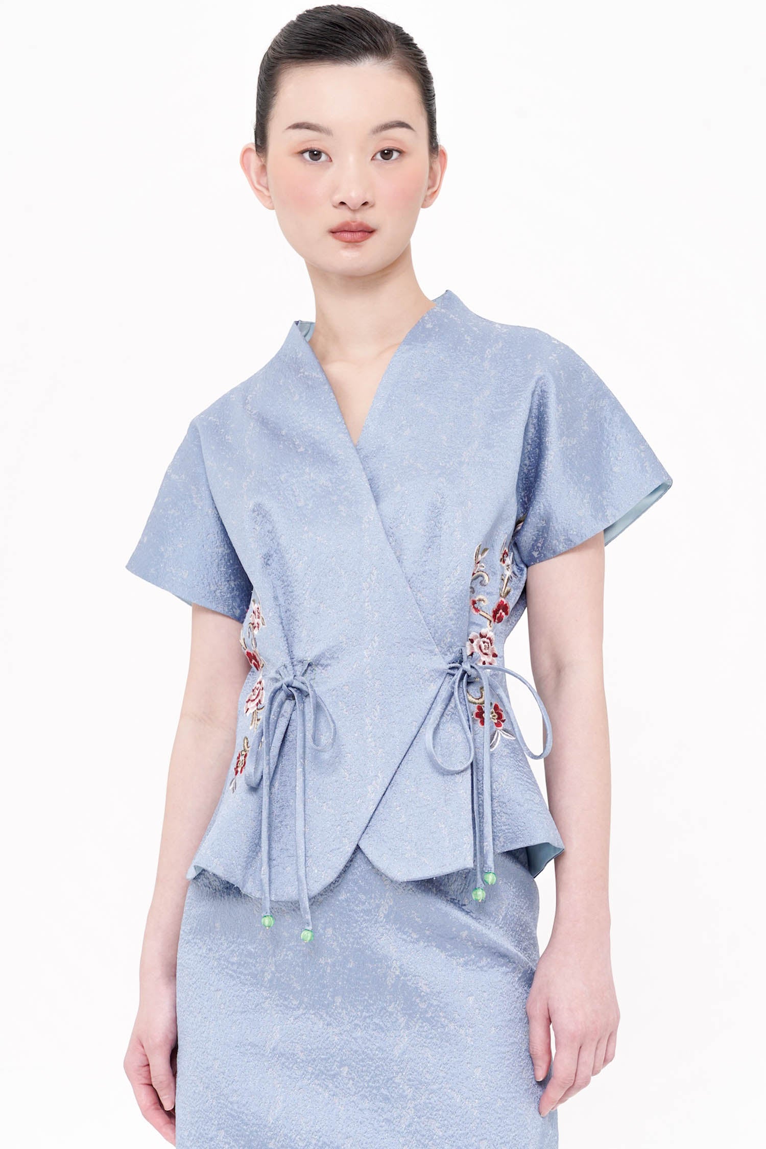The Wufu Tied Top is an elegant reinterpretation of heritage-inspired silhouettes, crafted from richly textured jacquard that lends depth and quiet luxury to the design. Featuring a refined wrap-inspired front with adjustable side ties, the top is softly sculpted to flatter the waist while allowing graceful movement. Delicate floral embroidery accents the sides, adding a poetic contrast to the clean structure and subtle sheen of the fabric. Finished with a gently flared hem, this piece embodies balance between strength and femininity, making it a sophisticated choice for both festive and refined daytime occasions. Available in Maroon and Blue.