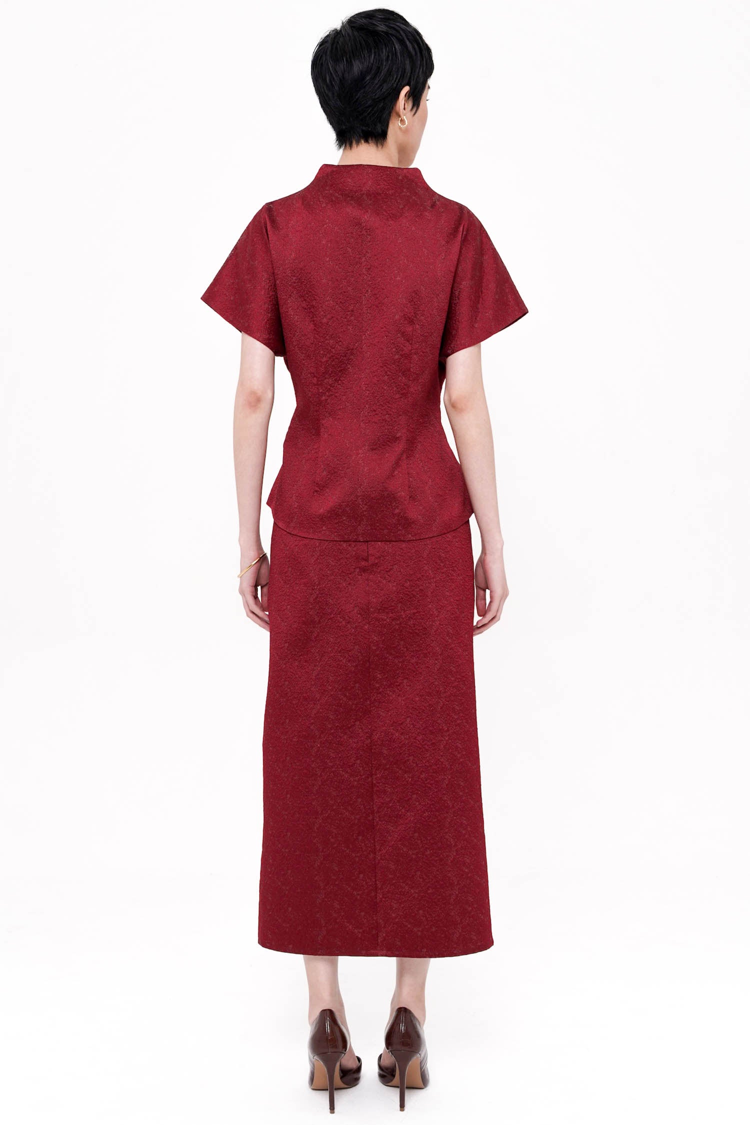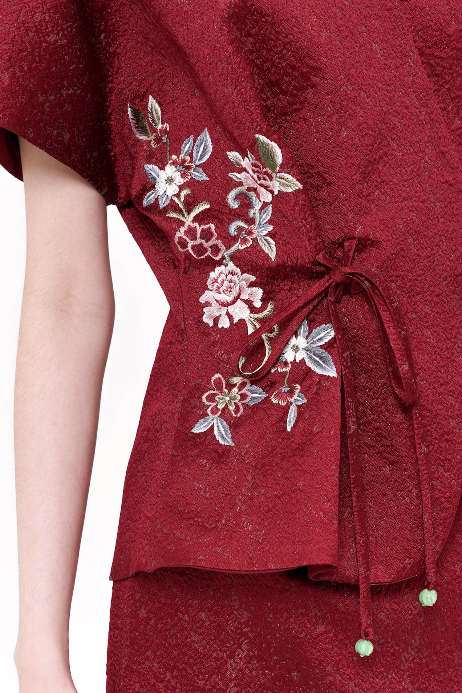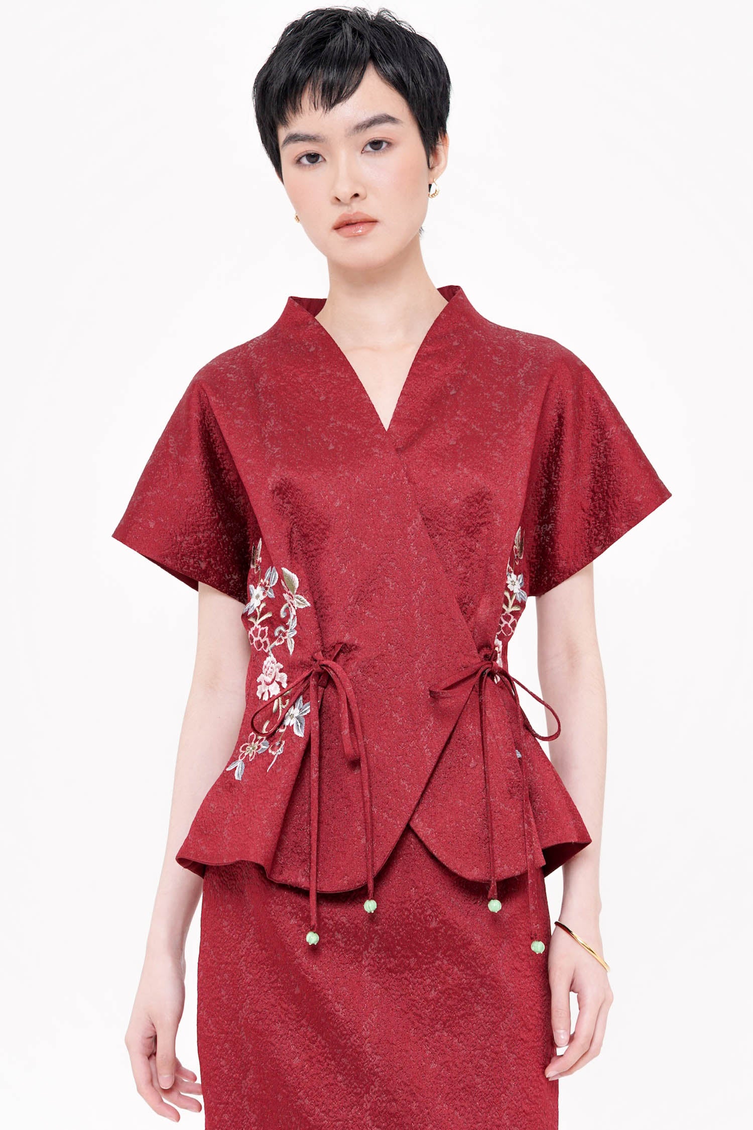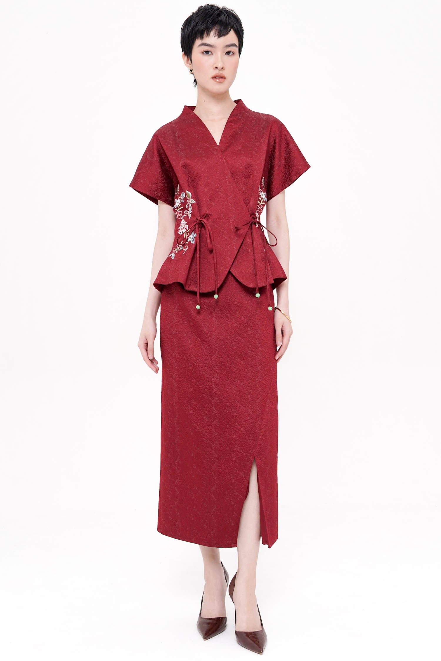 The Wufu Tied Top is an elegant reinterpretation of heritage-inspired silhouettes, crafted from richly textured jacquard that lends depth and quiet luxury to the design. Featuring a refined wrap-inspired front with adjustable side ties, the top is softly sculpted to flatter the waist while allowing graceful movement. Delicate floral embroidery accents the sides, adding a poetic contrast to the clean structure and subtle sheen of the fabric. Finished with a gently flared hem, this piece embodies balance between strength and femininity, making it a sophisticated choice for both festive and refined daytime occasions. Available in Maroon and Blue.