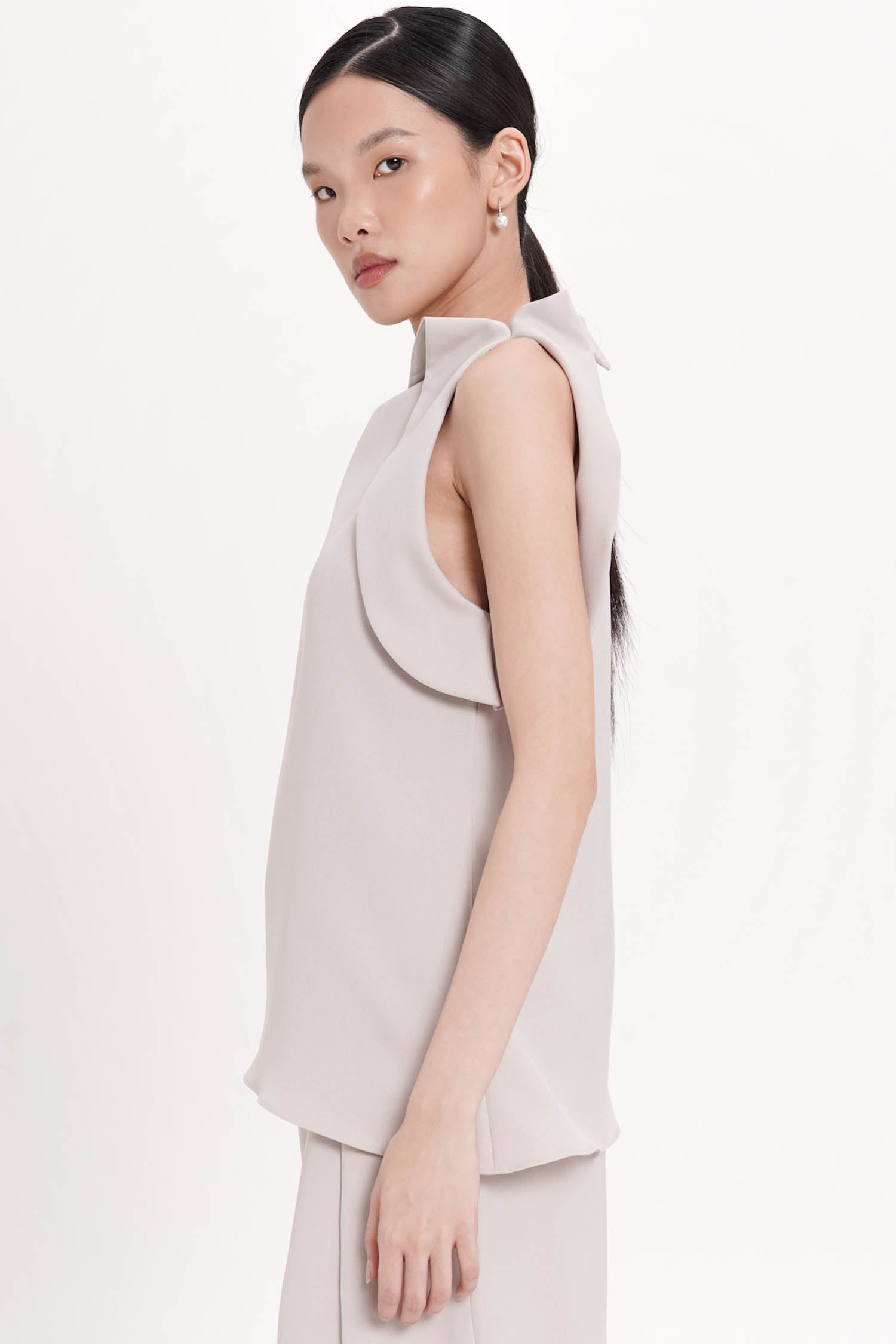 The Wyre Shawl Neck Top is a study in understated elegance, defined by its fluid lines and sculptural neckline. Crafted from semi wool, this sleeveless design features a softly draped shawl-inspired collar that frames the neckline with subtle sophistication. Its asymmetric hem enhances the graceful flow of the silhouette, while the clean construction lends a modern finish. Available in Broken White, Burgundy, and Denim, it is a versatile piece that transitions seamlessly from refined daywear to elevated evening ensembles.