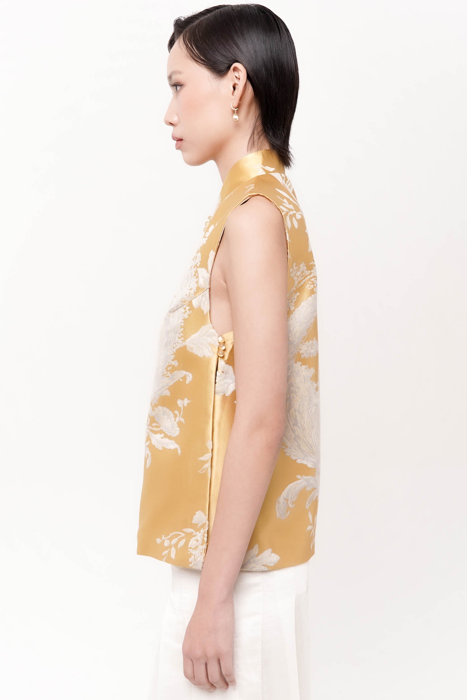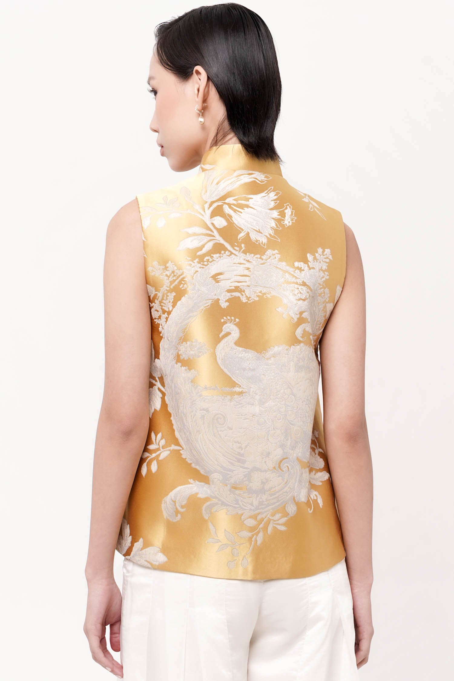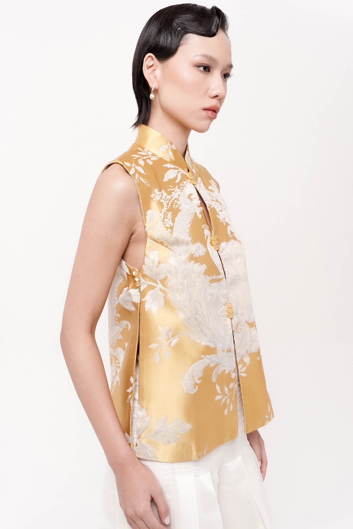 The Xia Qipao Vest is a graceful reinterpretation of traditional elegance, crafted to embody timeless refinement with a modern sensibility. Designed with a structured mandarin collar and delicate button detailing, this sleeveless vest showcases intricate floral and phoenix-inspired motifs that lend a sense of quiet luxury. Made from smooth polyester with a subtle sheen, it offers a polished silhouette that drapes beautifully on the body. Available in pink and gold, the Xia Qipao Vest is a sophisticated statement piece, perfect for elevating both contemporary and classic ensembles.
