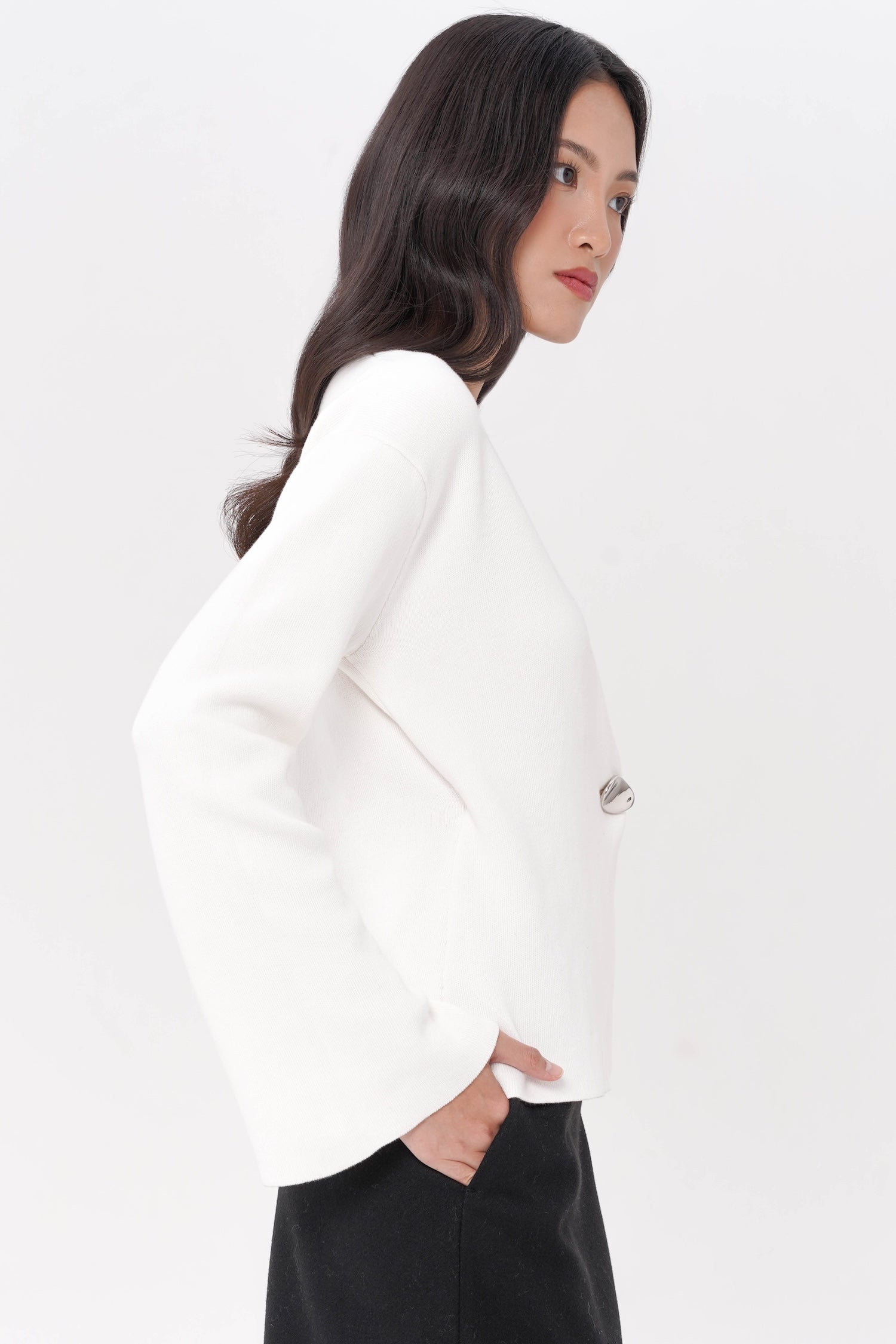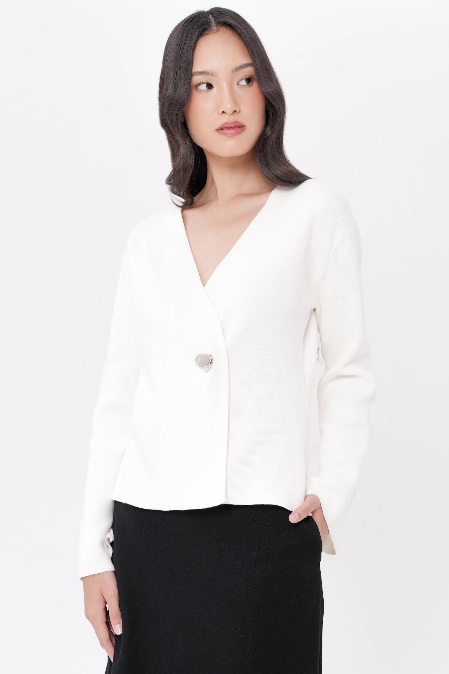 The Zaina Wrap Cardigan brings refined simplicity to modern dressing, crafted from a soft cotton knit that drapes effortlessly across the body. Its clean, minimalist silhouette is elevated by a sculptural wrap design that closes with a single polished accent, creating a gentle asymmetry that feels both contemporary and timeless. The deep V-neckline frames the décolletage with understated elegance, while the smooth, full-length sleeves and seamless back lend a sense of quiet sophistication. Versatile and polished, the Zaina Wrap Cardigan transitions with ease from casual refinement to elevated ensembles, available in classic black and crisp white.